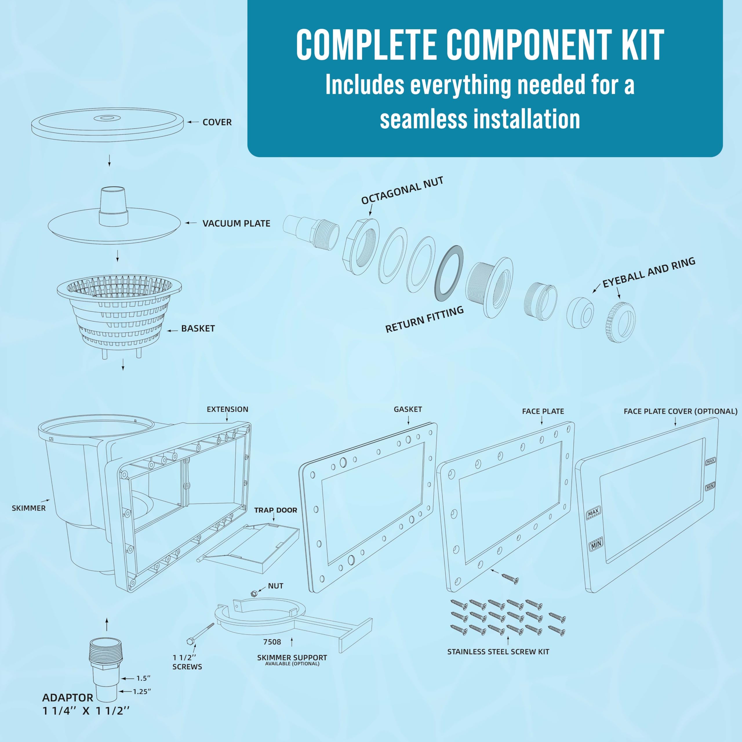 Complete Component Kit: Includes everything needed for a seamless installation; the package comes with the pool skimmer housing, housing support, housing cover, snap-in weir door, face plate, face plate cover, debris basket, double gaskets, vacuum plate attachment, hose fitting adaptor (1 ¼" or 1 ½"), directional eyeball return fitting, and 12 stainless steel screws.