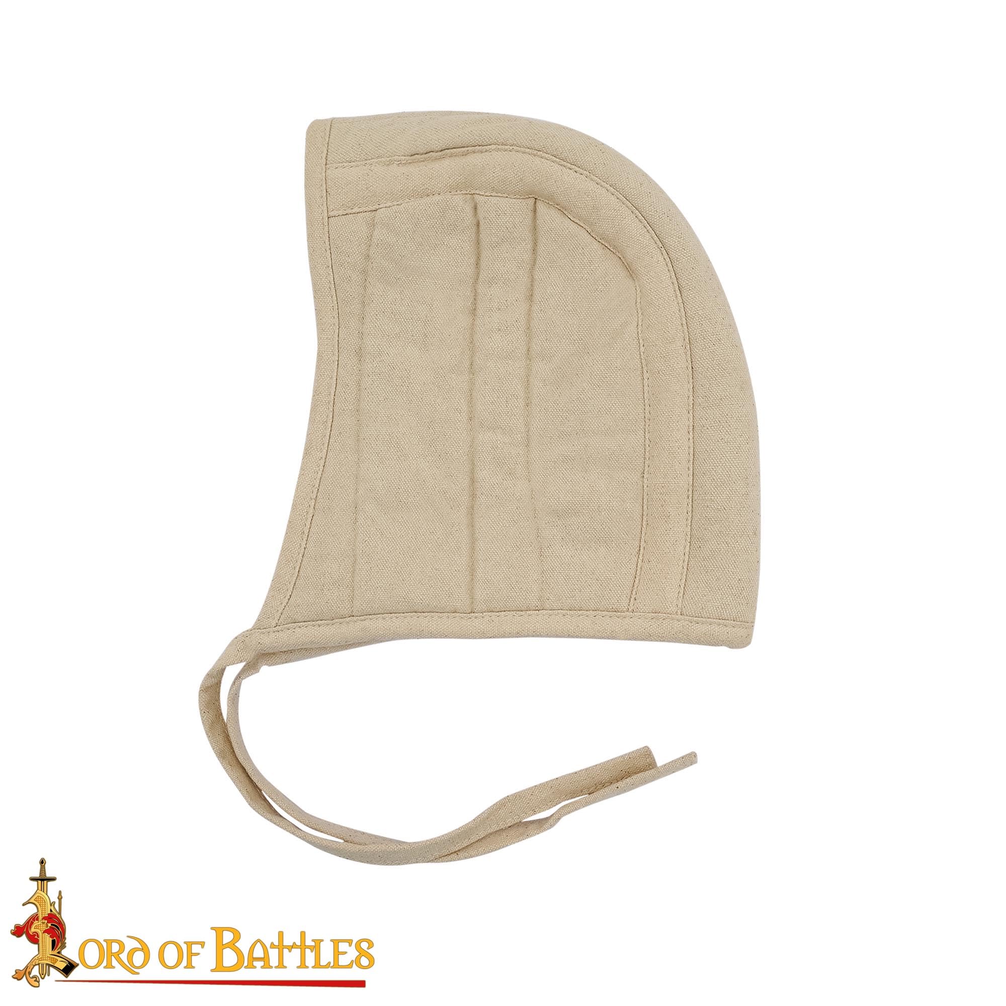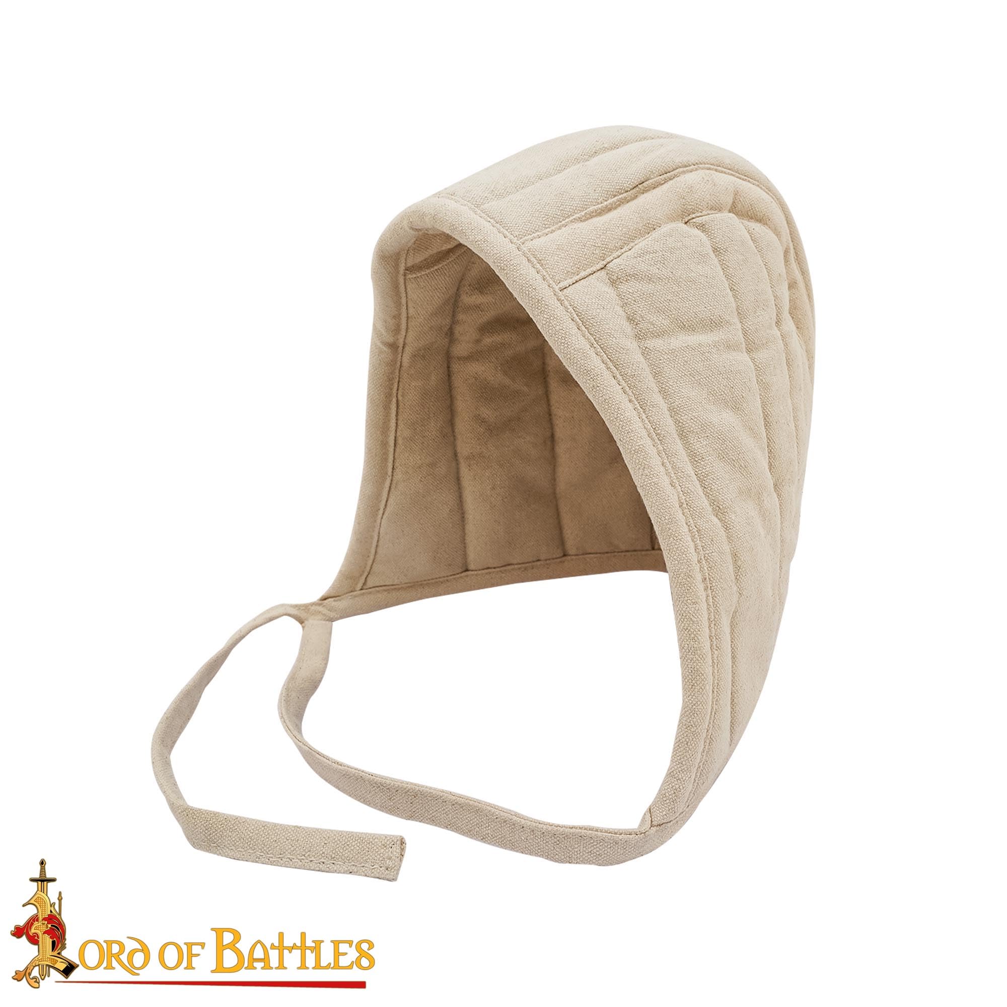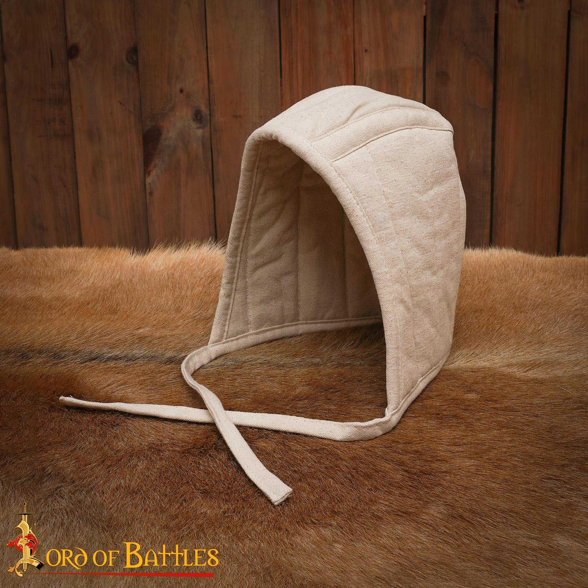 Description Genuine Lord of Battles product, handcrafted from durable quilted canvas cotton for added comfort and protection under helmets. Acts as a shock-absorbing layer, ideal for knights, soldiers, and medieval reenactors wearing helms or mail coifs. Designed in a size large to fit most adult head sizes comfortably; total length approximately 25 cm. Available in three authentic colors: black, ecru, and brown—perfect for matching different historical outfits. Ideal for medieval reenactments, LARP, cosplay, SCA events, and themed weddings