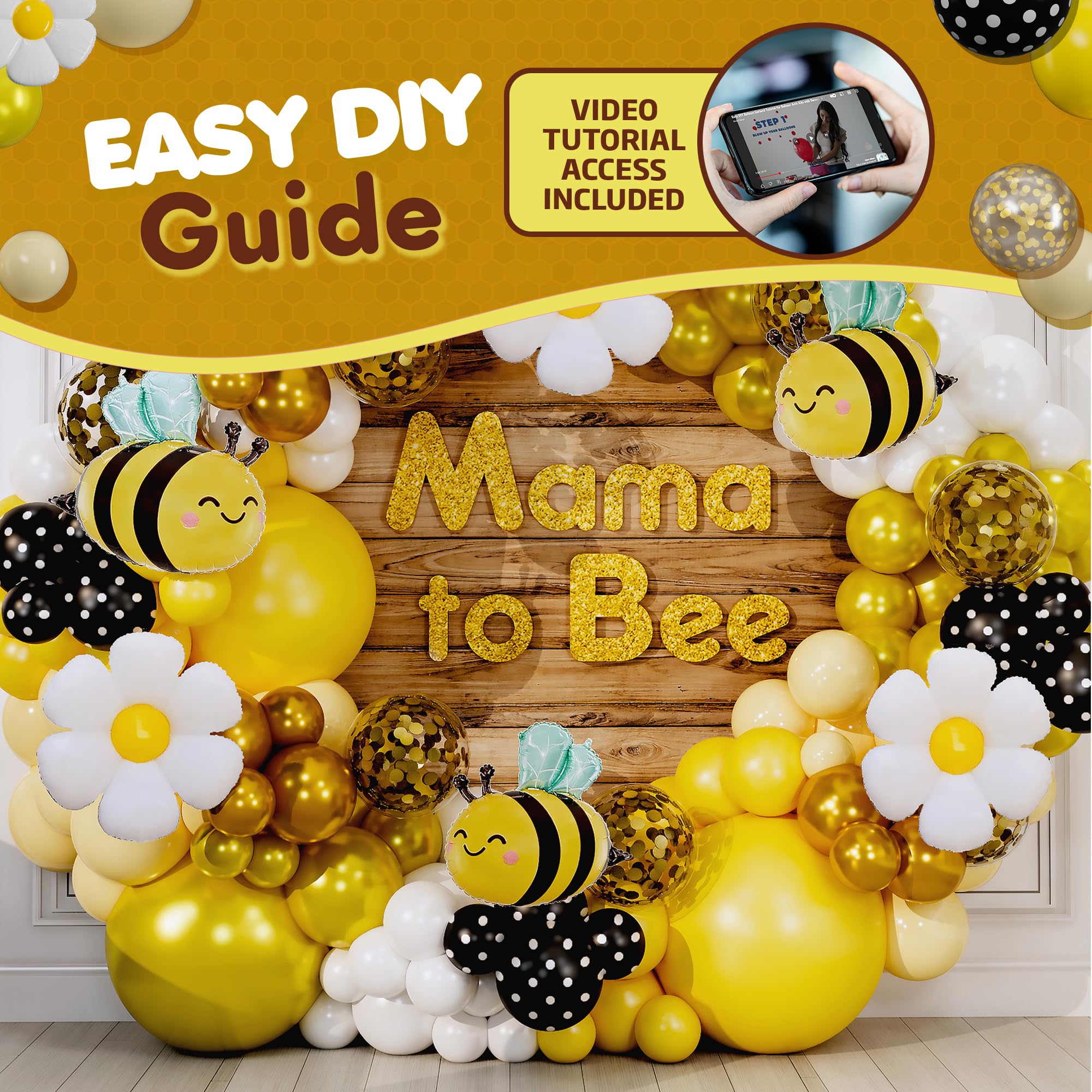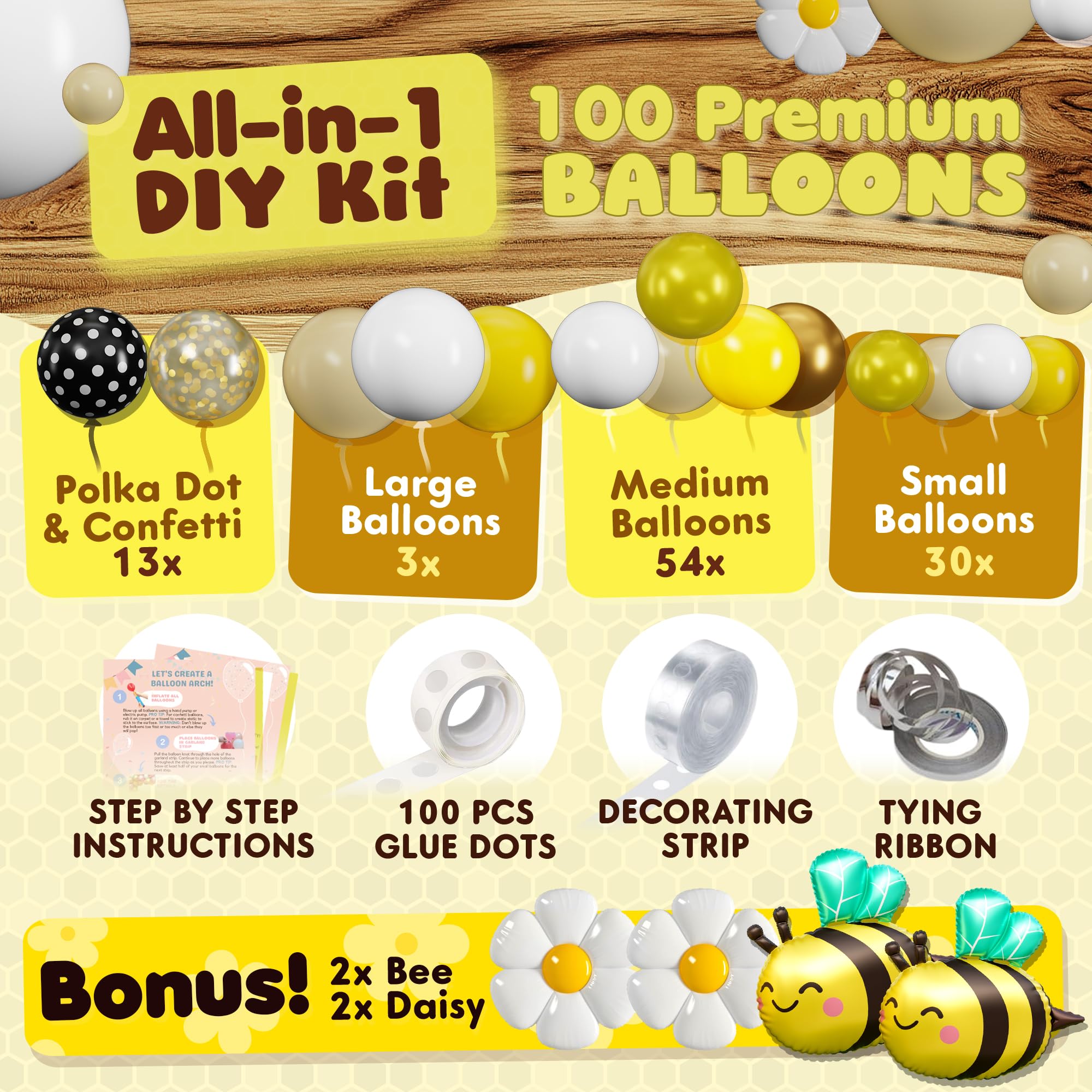 【EASY DIY】Along with all those hand-picked 100 Honey Bee Balloons in 4 sizes, you get the following: beginner-friendly instructions, 100x glue dots, 16ft balloon garland strip, and 32ft tying ribbon to securely hang your Yellow and White Balloon Garland Kit or each individual balloon. We make decorating for BUSY people fun & simple, whether it's for a Honey Bee Gender Reveal or a Honey Bee Baby Shower Decorations. Feel like an actual party planner and create YOUR own style!
