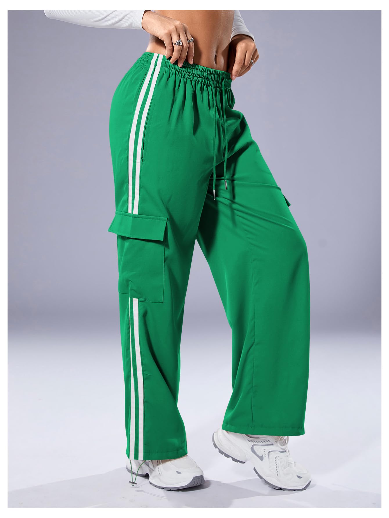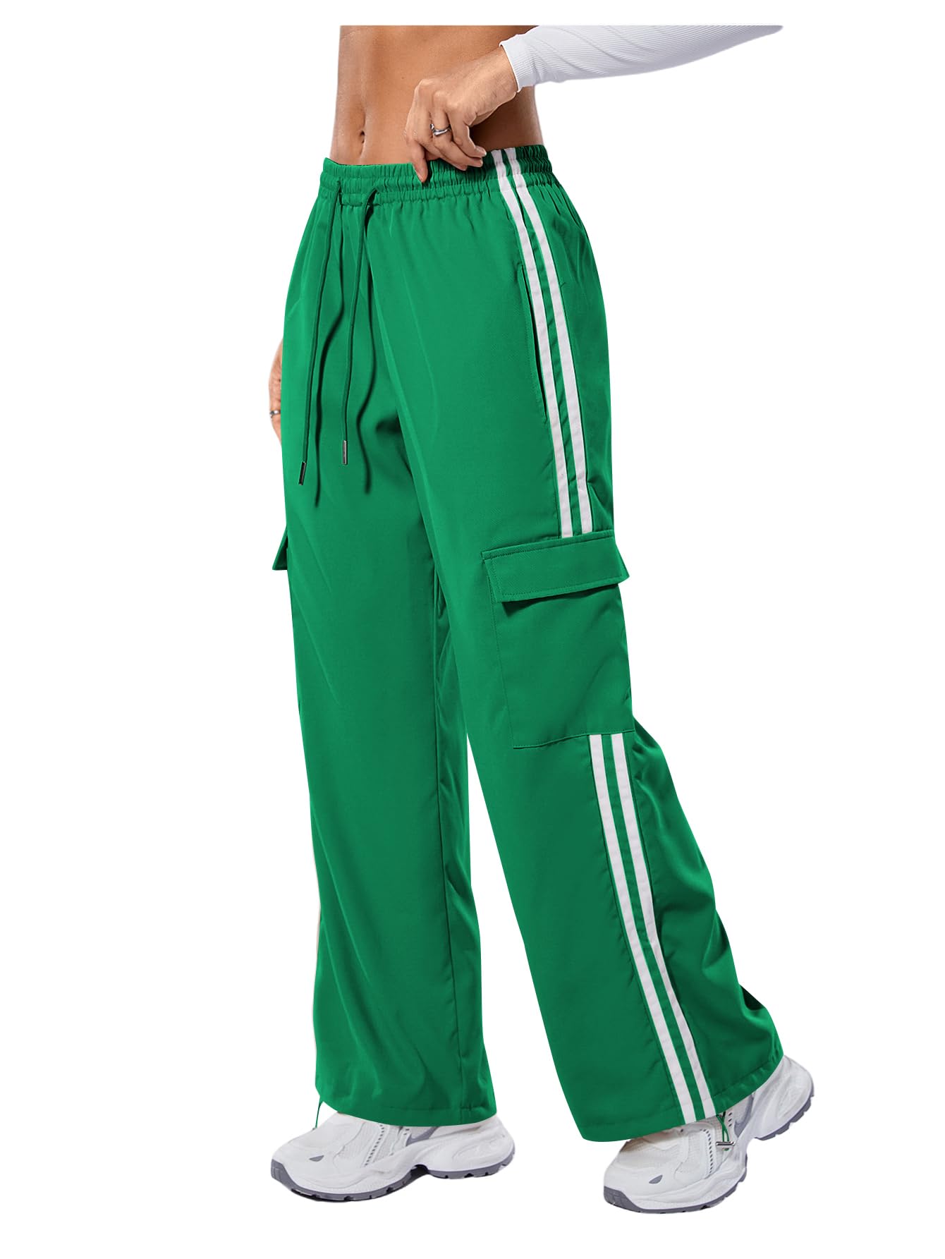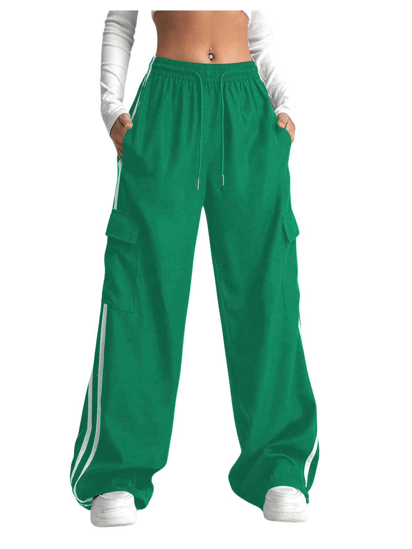 Drawstring Front and Hem, Elastic High Waist, Cargo Pocket Side, Straight Leg, Patched Stripes, Casual Long Pants
