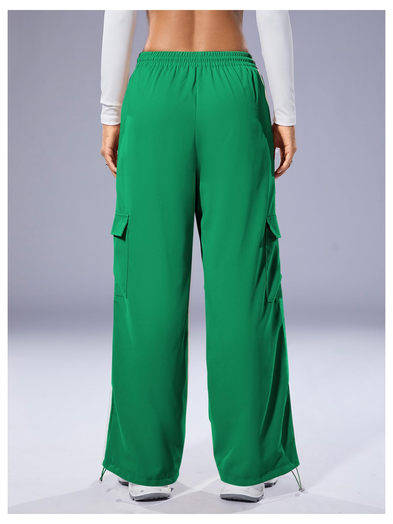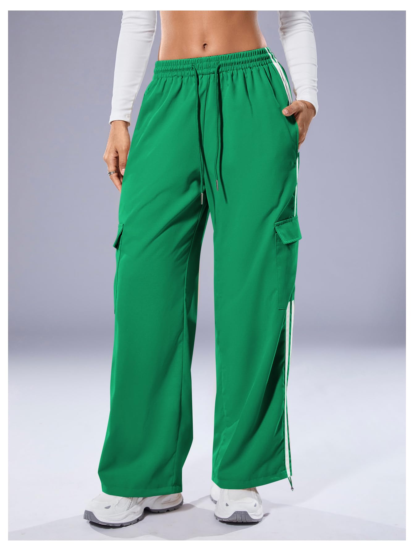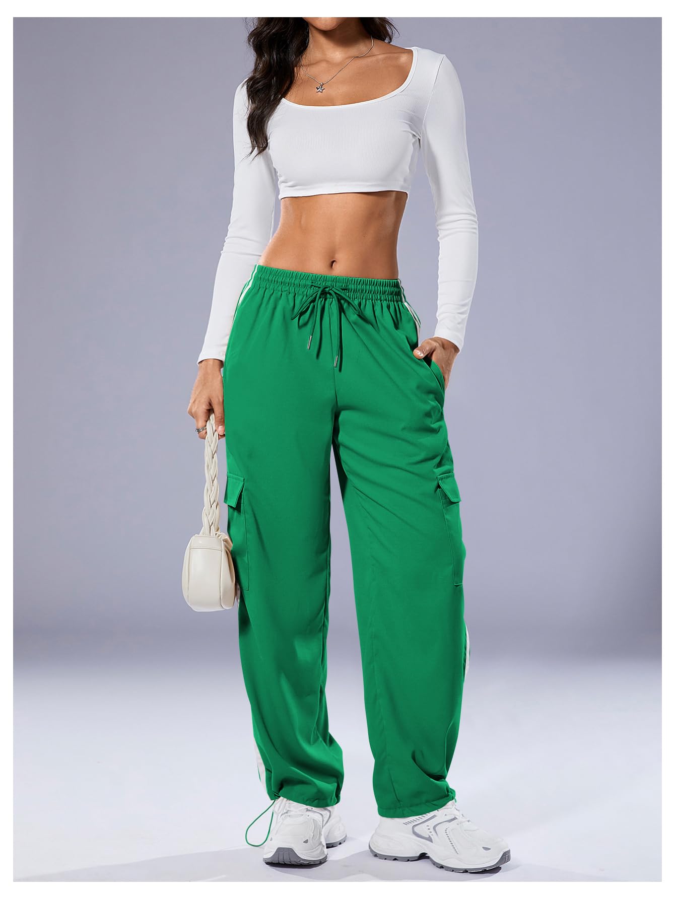 Drawstring Front and Hem, Elastic High Waist, Cargo Pocket Side, Straight Leg, Patched Stripes, Casual Long Pants