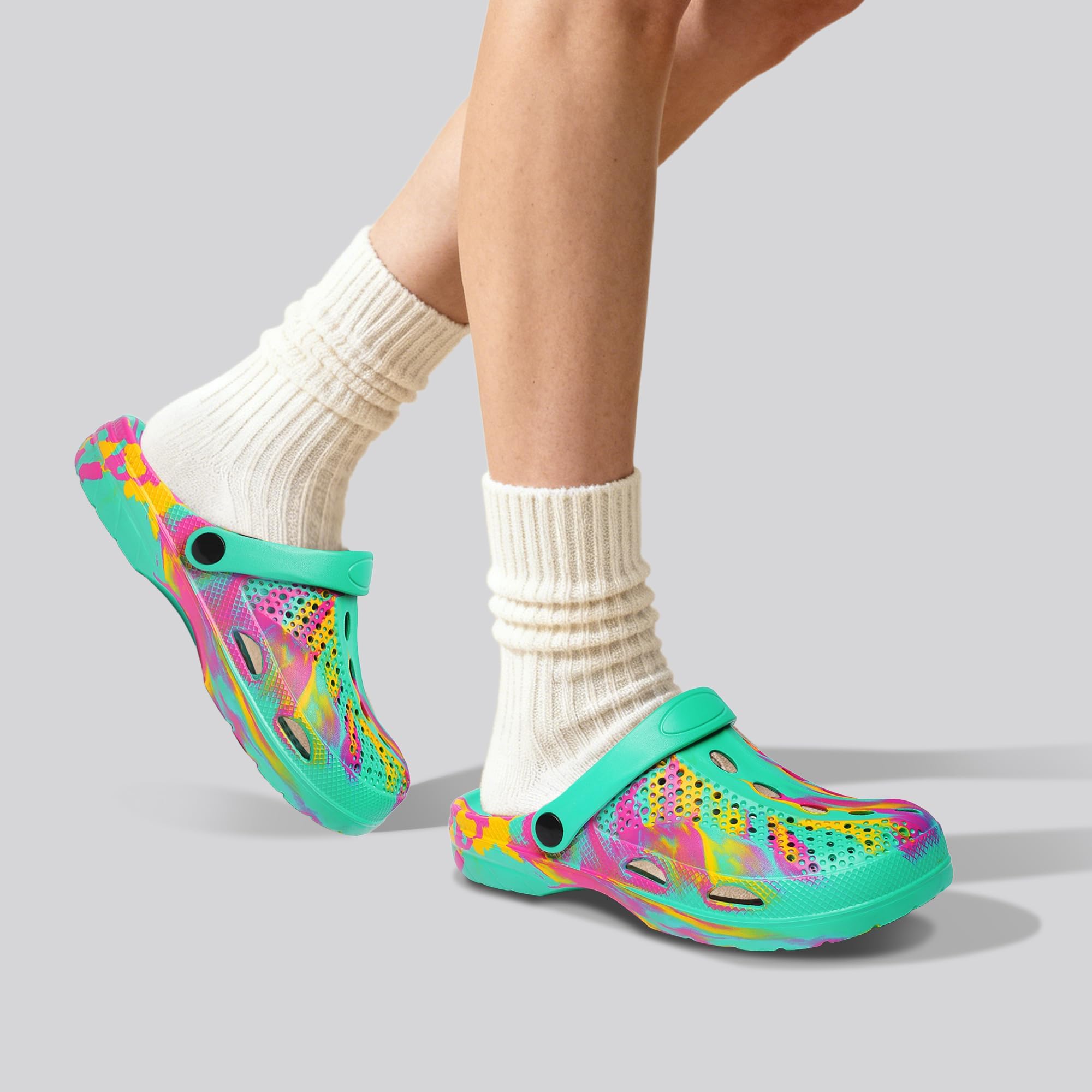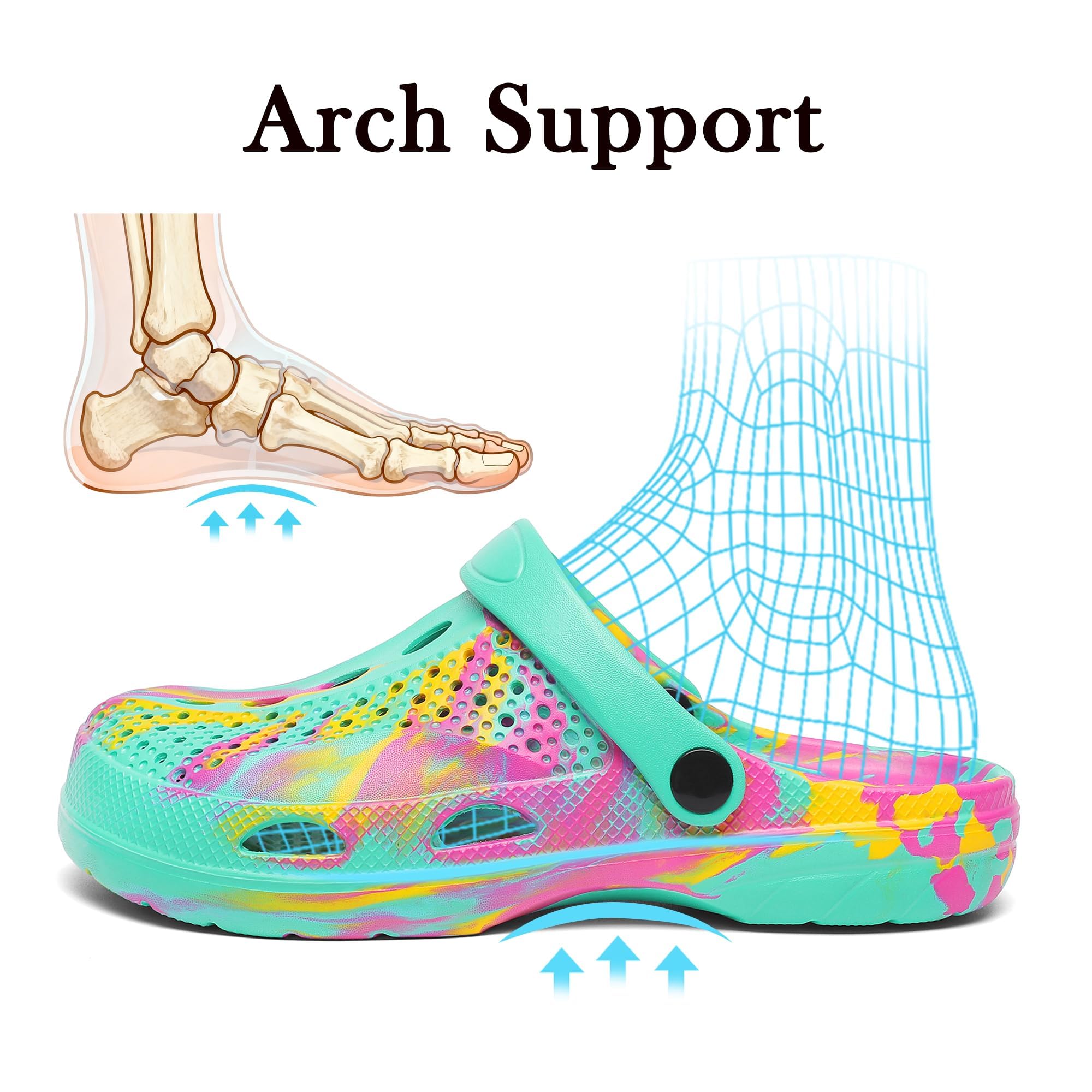 【Great Arch Support 】Womens clogs arch support, these clogs help relieve foot tired provides added stability, helping to absorb shock and reduce stress on your feet. Whether you're gardening, walking at the beach or outdoor activities, these clogs provide the comfort you need