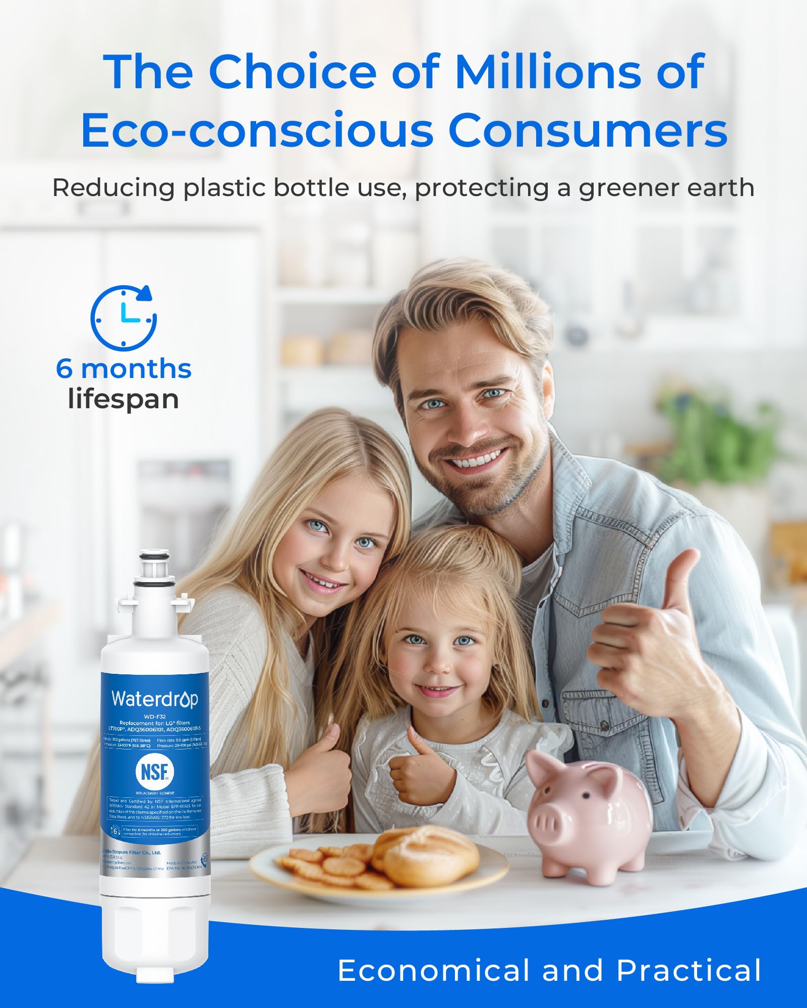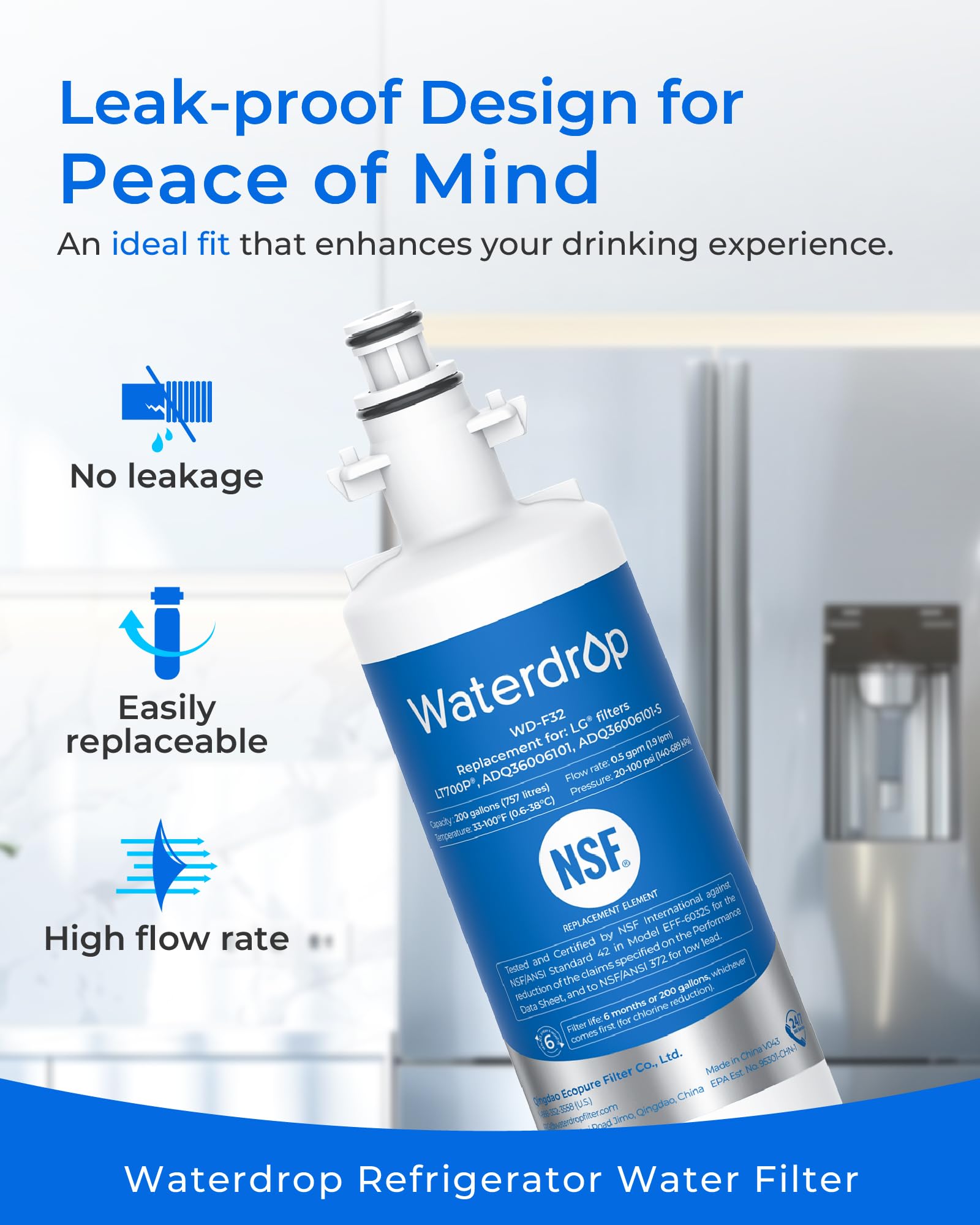 [BPA-free and food-grade materials] At Waterdrop, we prioritize your safety. This is why we have used only safe materials in this refrigerator filter, as verified by the NSF 372 certification for lead-free materials.
