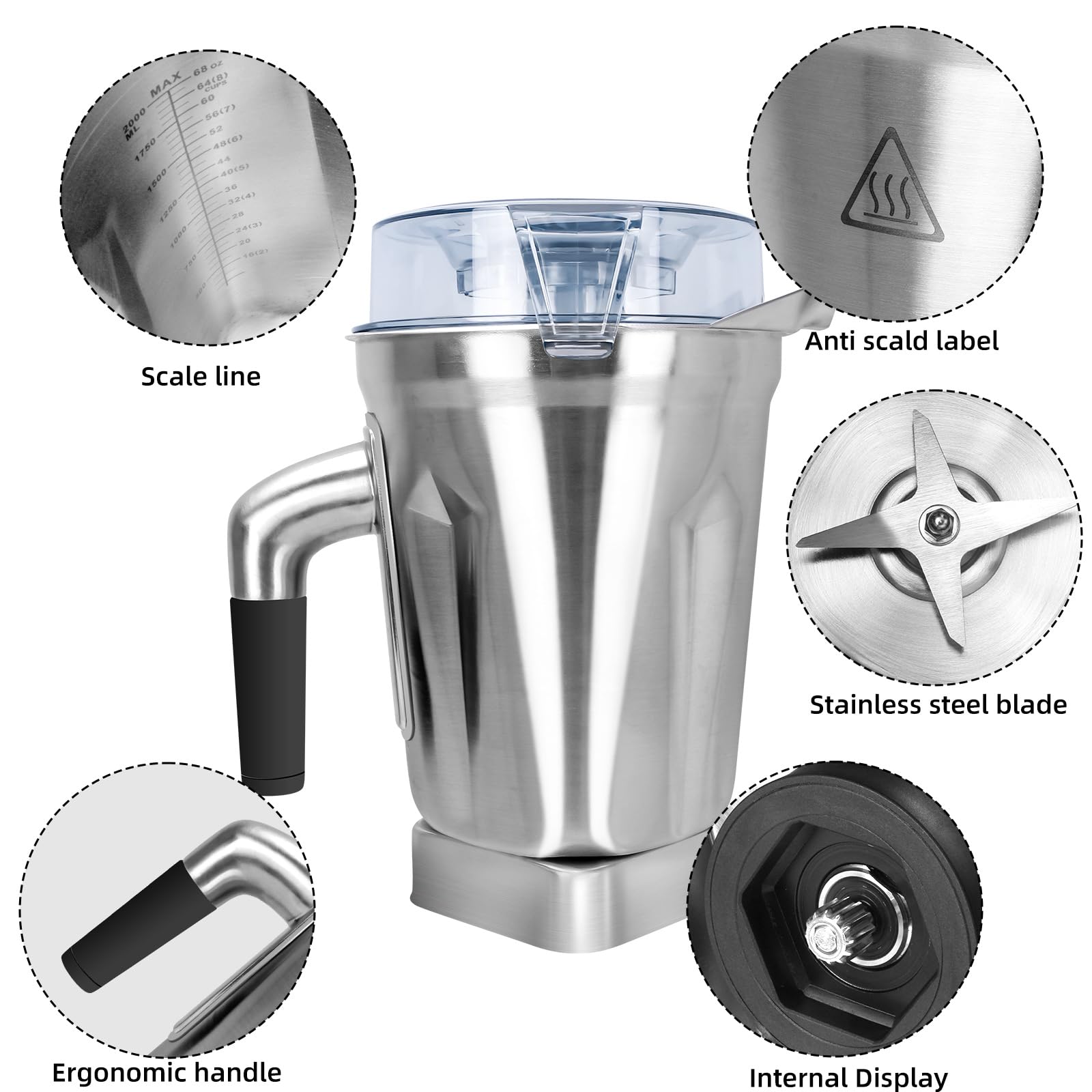 PERFECT CAPACITY AND DESIGN: The 64 ounce capacity is suitable for home or small commercial use, can hold a large amount of ingredients for daily drinks, smoothies, soups and other gourmet food preparation.