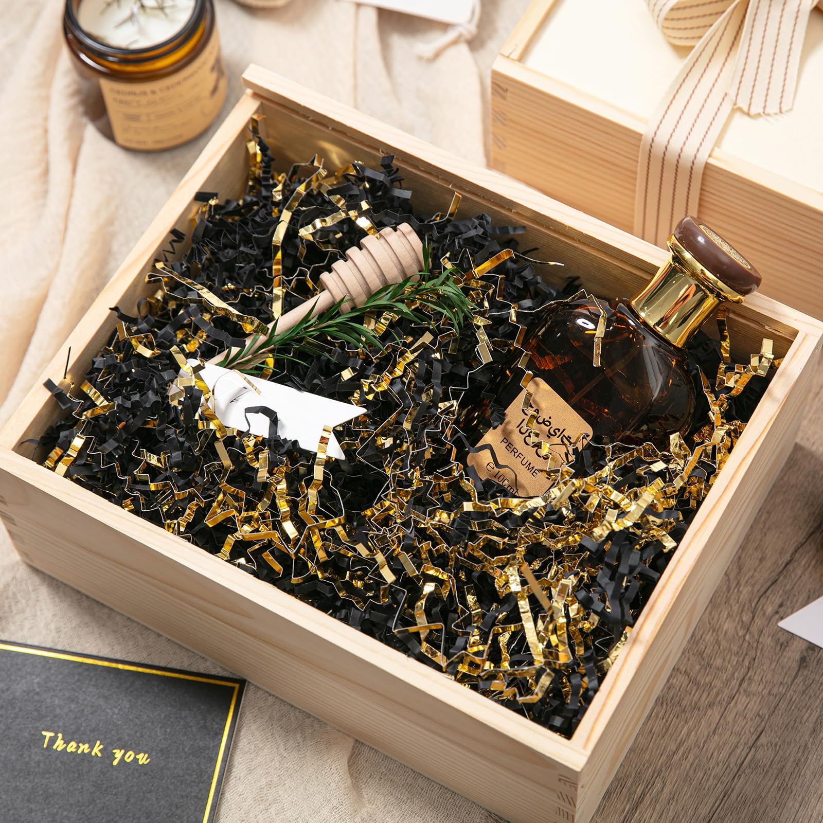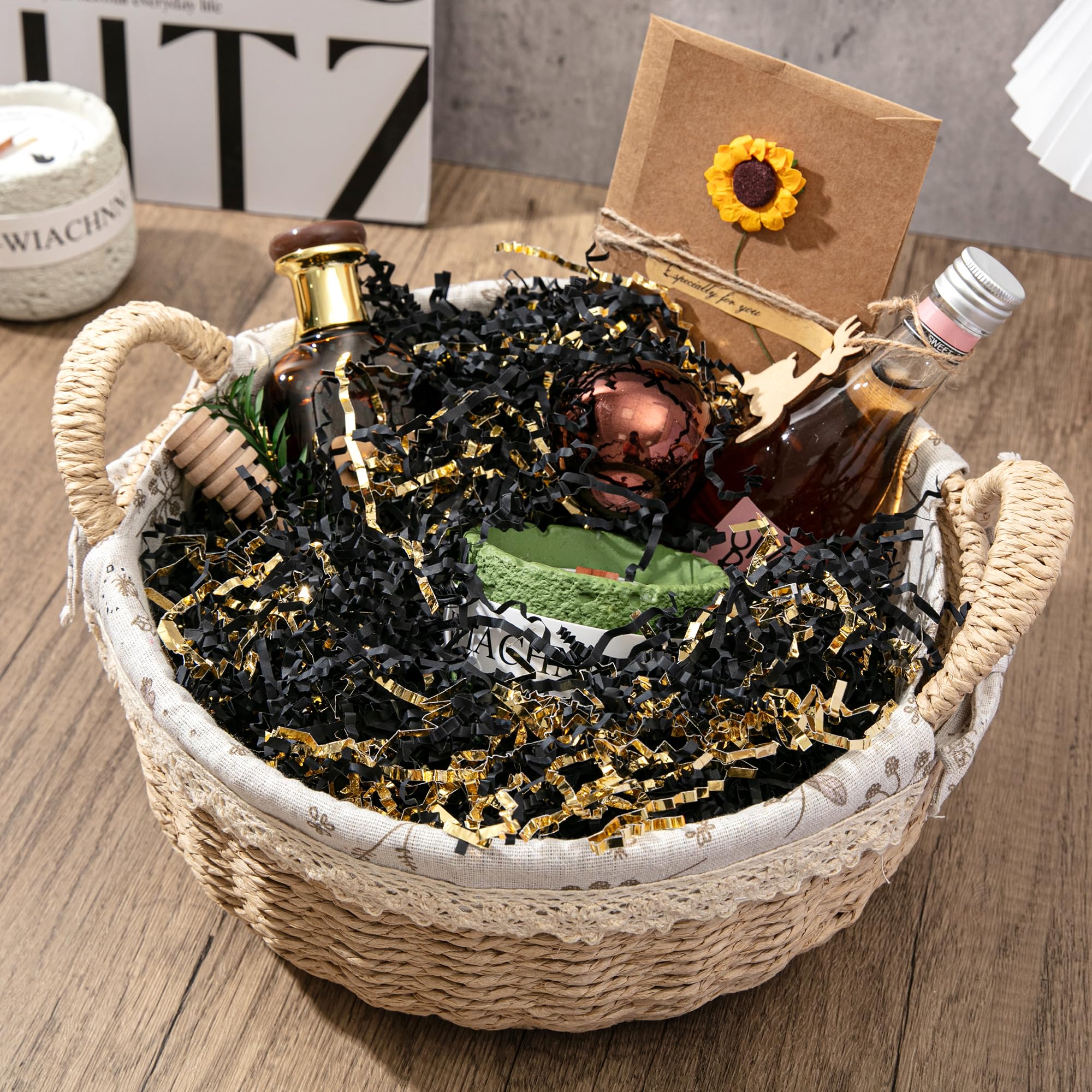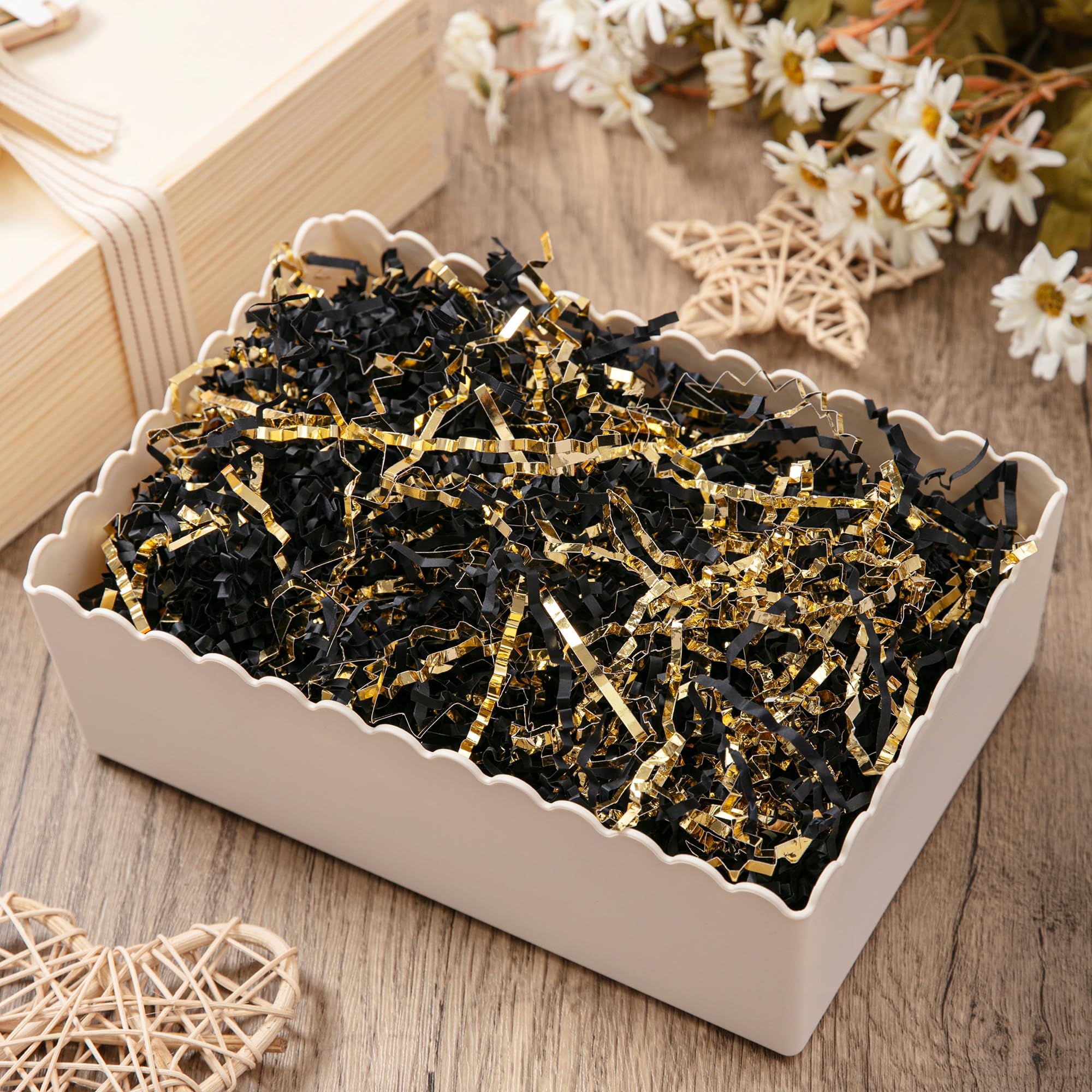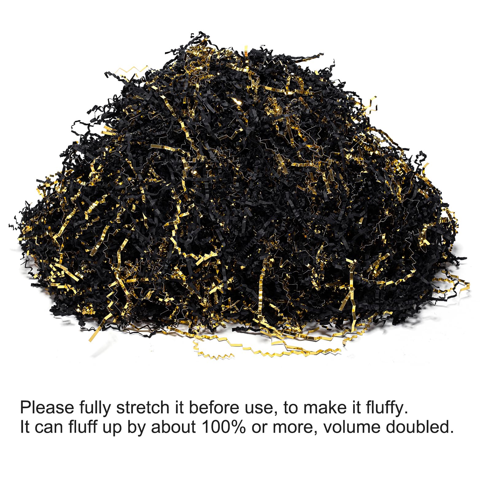 Shredded Paper for Gift Box: Decorate your gift with this black & gold crinkle paper to fully display your gift and make your gift more attractive.Perfect to fill the extra spaces in your gift boxes or basket.