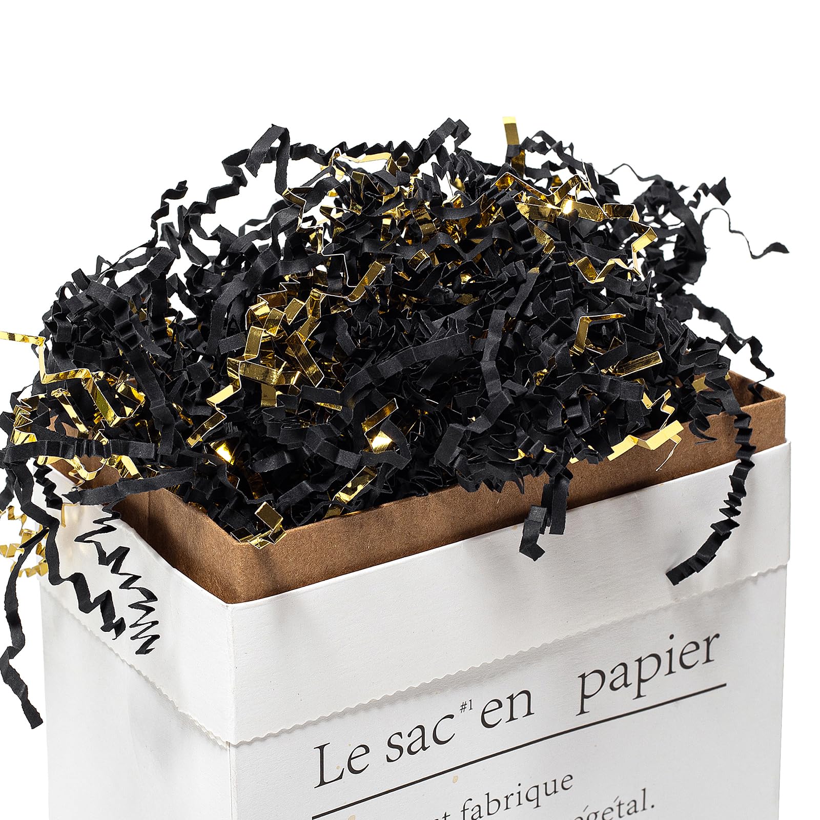 Crinkle Cut Paper Shred Filler: Pack of 1/2 LB (8oz), black & gold color. Made of 54 lb (80 gsm) paper, recycled and eco friendly.