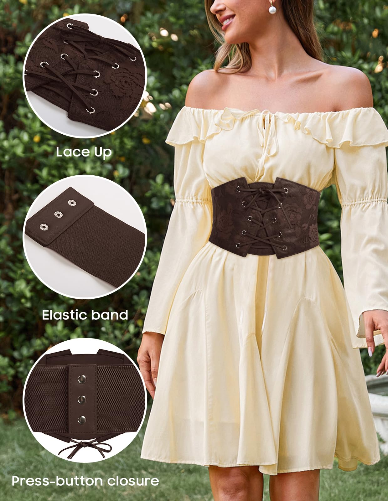 Features: Press-button closure in the back; Corset lacing style in the front; Well elastic elastic band; Floral lace fabric