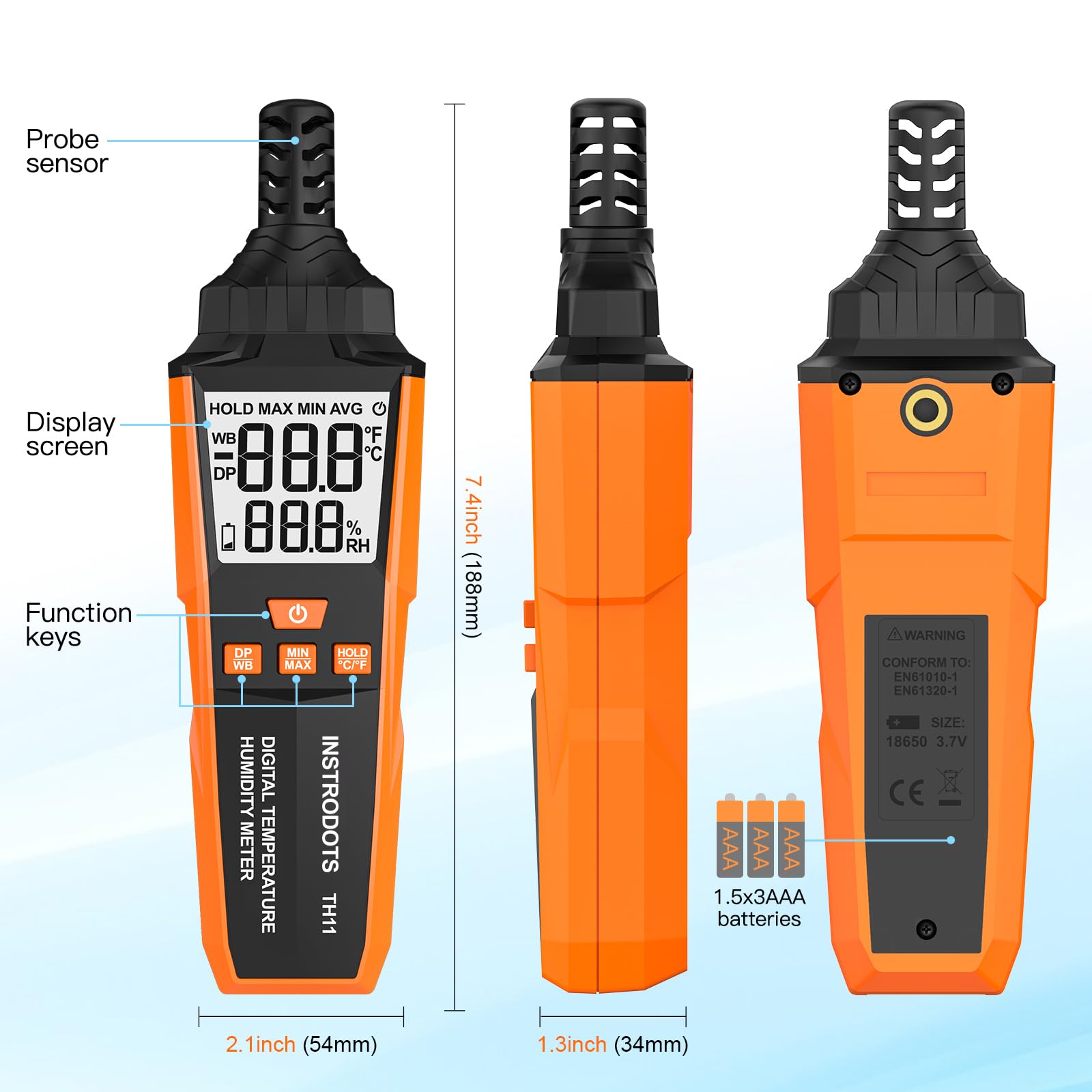 MULTIFUNCTIONAL TEMPERATURE HUMIDITY METER - INSTRODOTS TH11 is a new type of digital temperature and humidity meter with 4 professional measurement modes, which is designed to combine the functions of ambient temperature, relative humidity, wet bulb, and dew point temperature. This temperature humidity monitor is compact and portable, safe and reliable. The Dew point is a measure of how much water vapor is actually in the air.