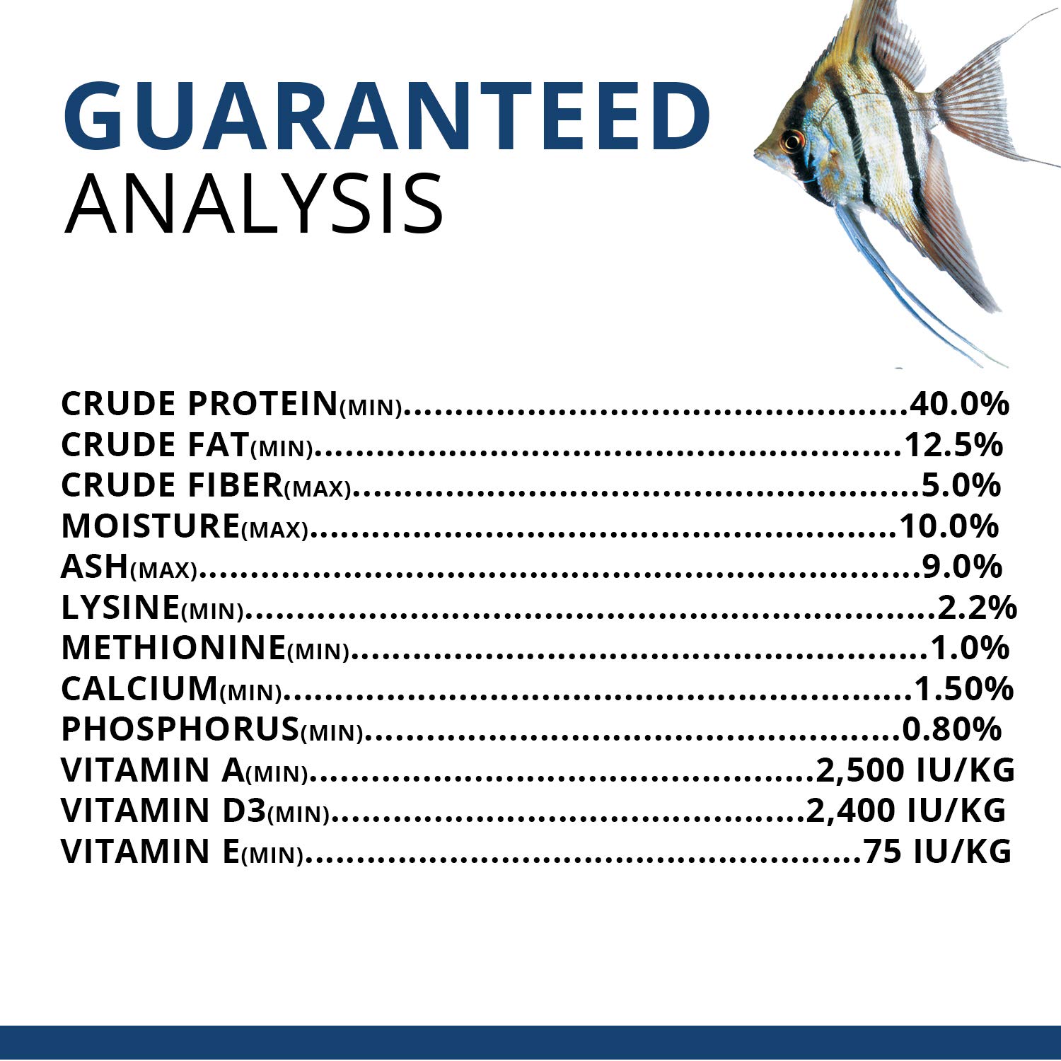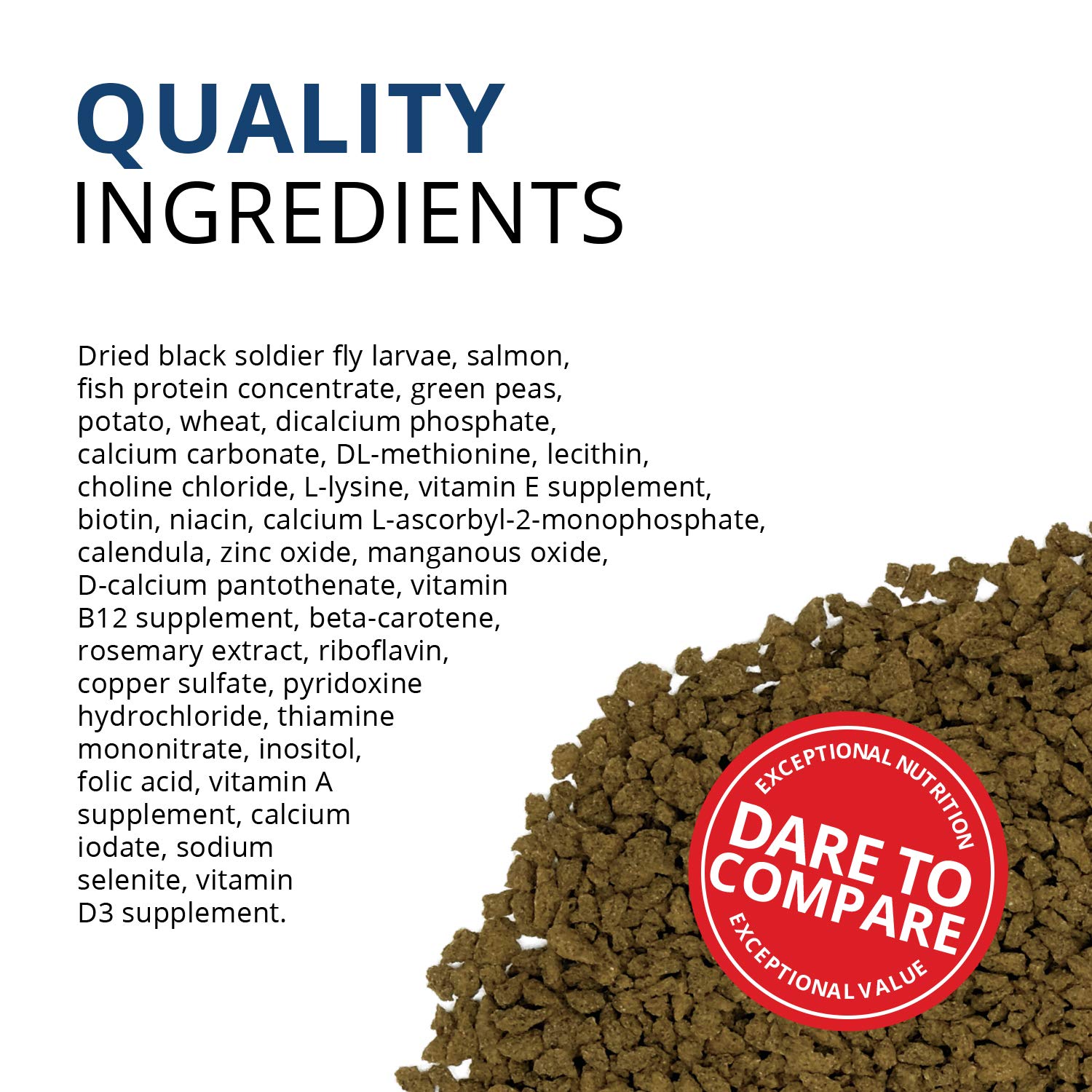 Tropical fish food that contains up to 40%, nutrient-rich Black Soldier Fly Larvae, the first ingredient
