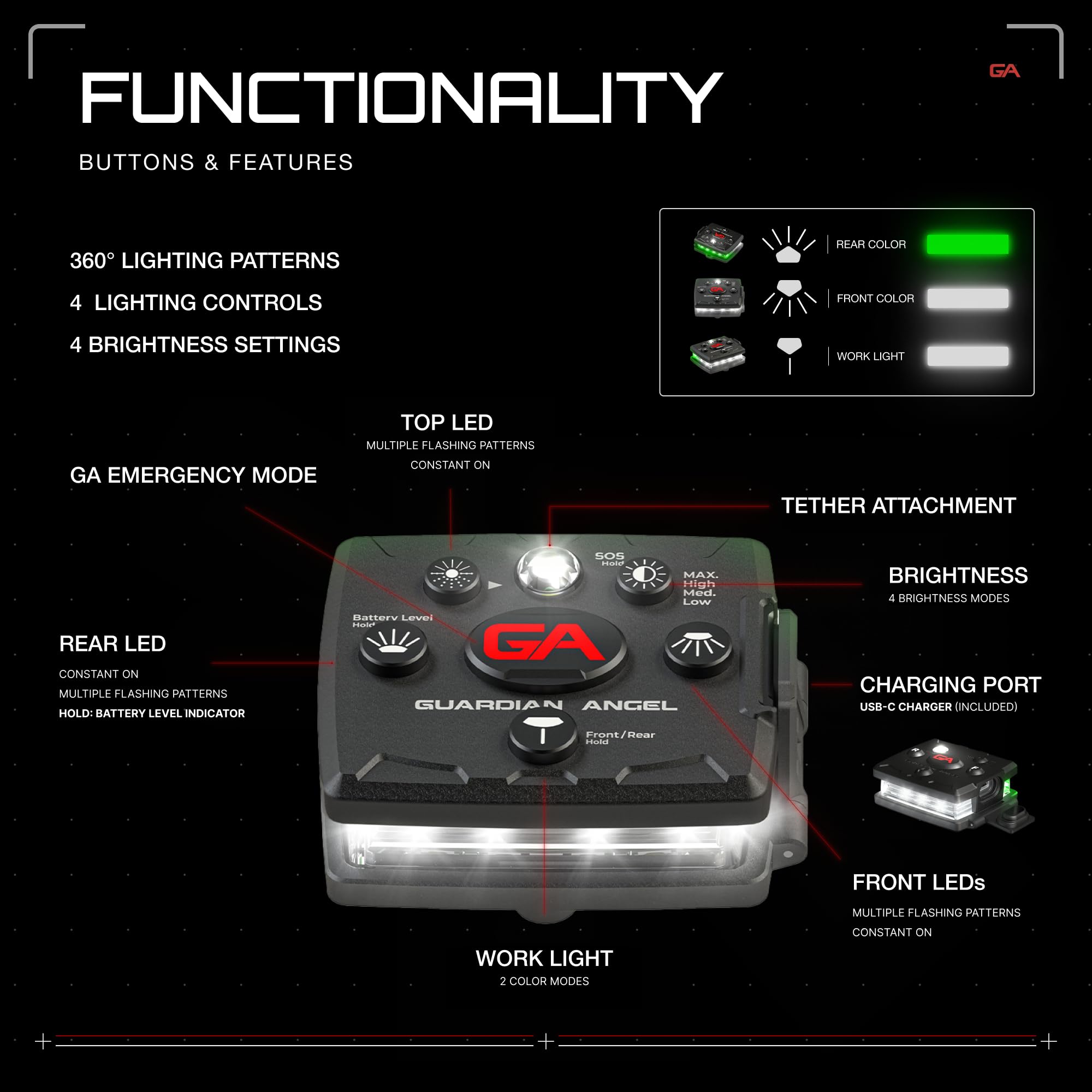 ๐ ๐ฎ๐ ๐ถ๐บ๐๐บ ๐ฉ๐ถ๐๐ถ๐ฏ๐ถ๐น๐ถ๐๐: With 13 high-output LEDs, the Guardian Angel Micro Series keeps you visible from up to 3+ miles. With 360ยฐ lighting, others can see you from all sides. Four brightness settings, multiple flash patterns, steady burn option and Emergency Mode, ensure others can see you when needed. With 6 white LEDs on the front, 6 green LEDs on the rear, this device features a hands-free white flood light, a white work light, and a white top light.