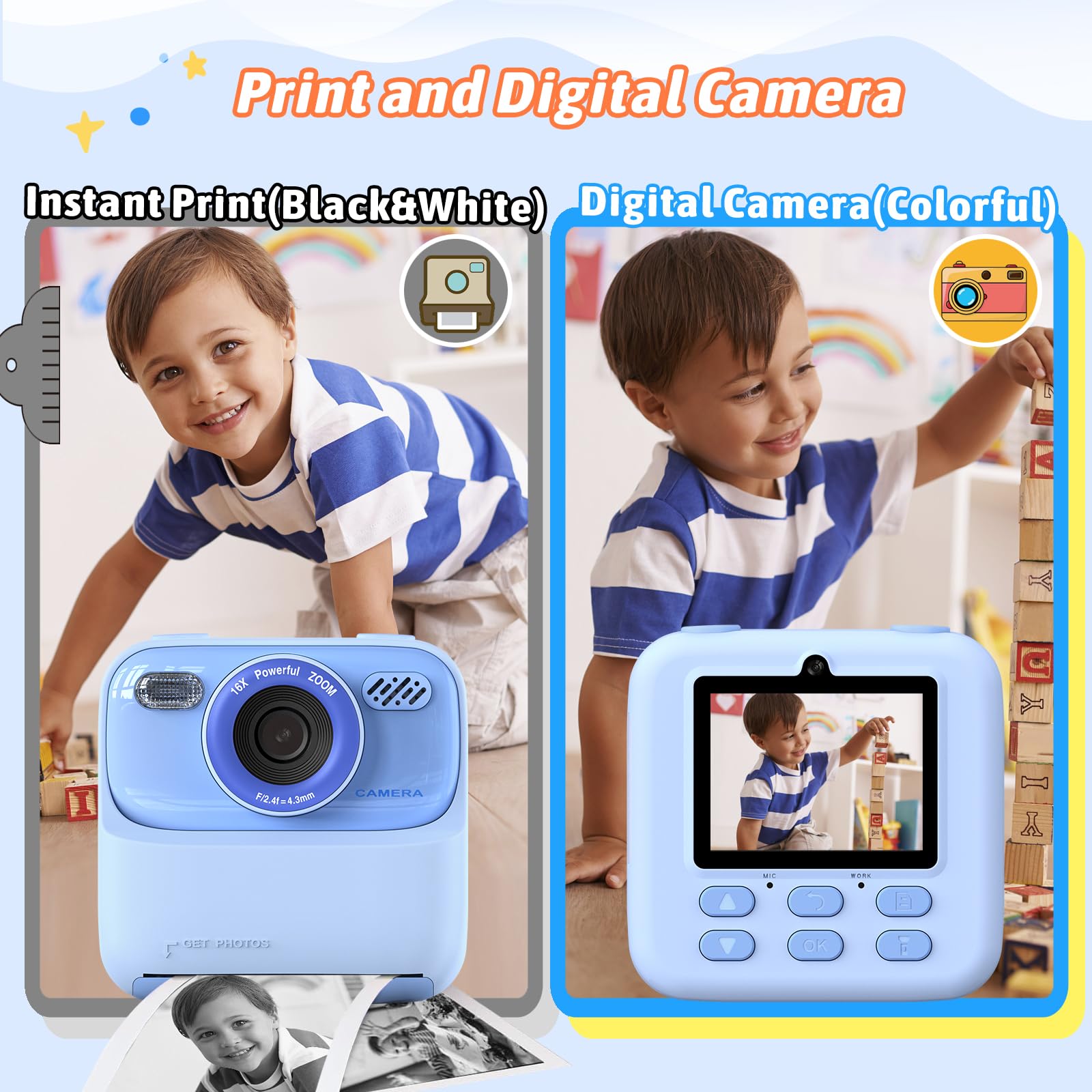 【Multi-functional Kids Digital Instant Print Camera】This digital camera has instant printing, flash, 2.4-inch large screen, 3 puzzle games, 28 cute frames and 6 filters, selfie dual cameras (Front/Rear lens), real-time video recording, time lapse capture, MP3 music player.