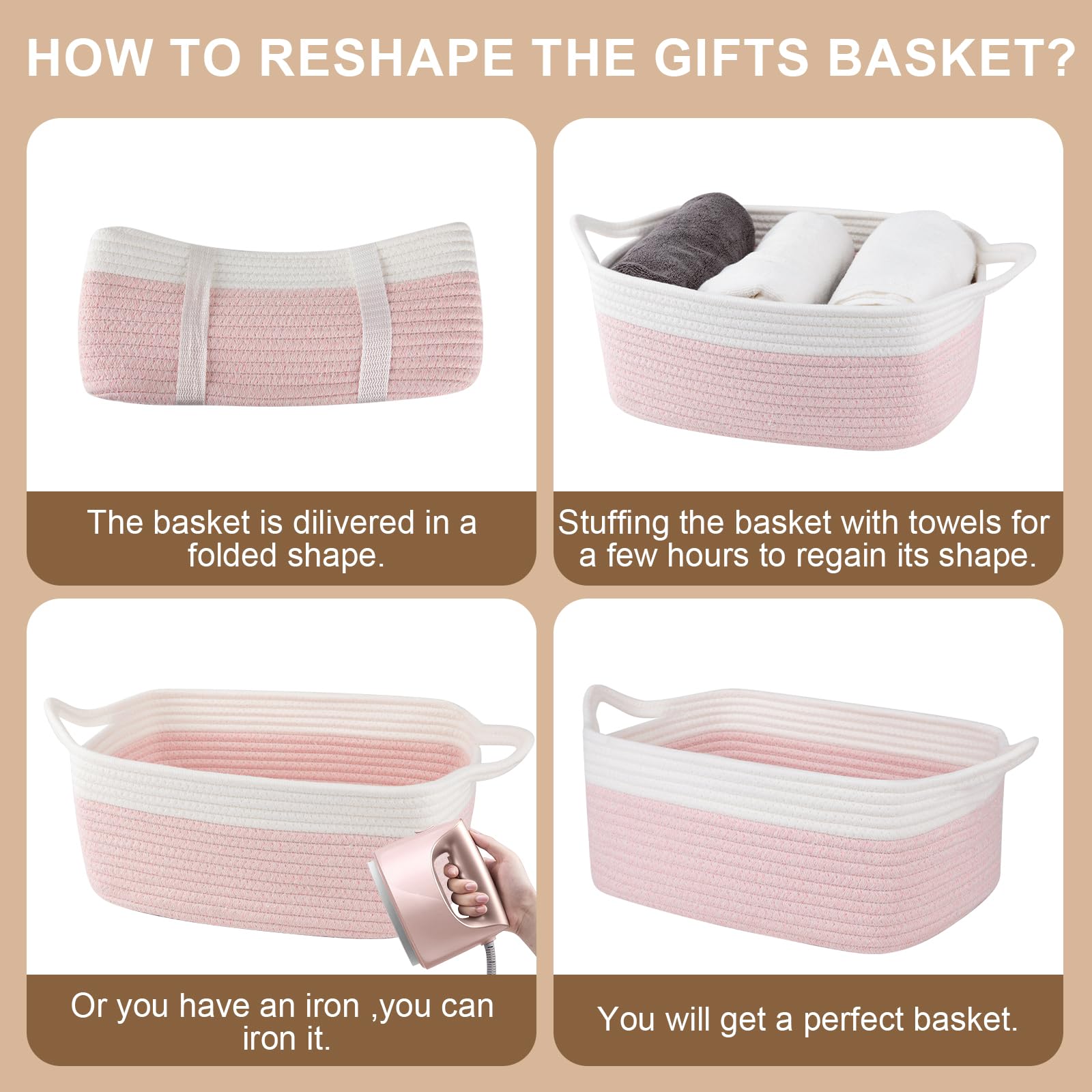Convenient recovery process: The small baskets for gifts is folded when arriving. After receiving the basket, you can easily open it and place towels or clothes to regain its shape. If you have an iron at home, ironing can also help the cute storage basket recover to its best condition faster