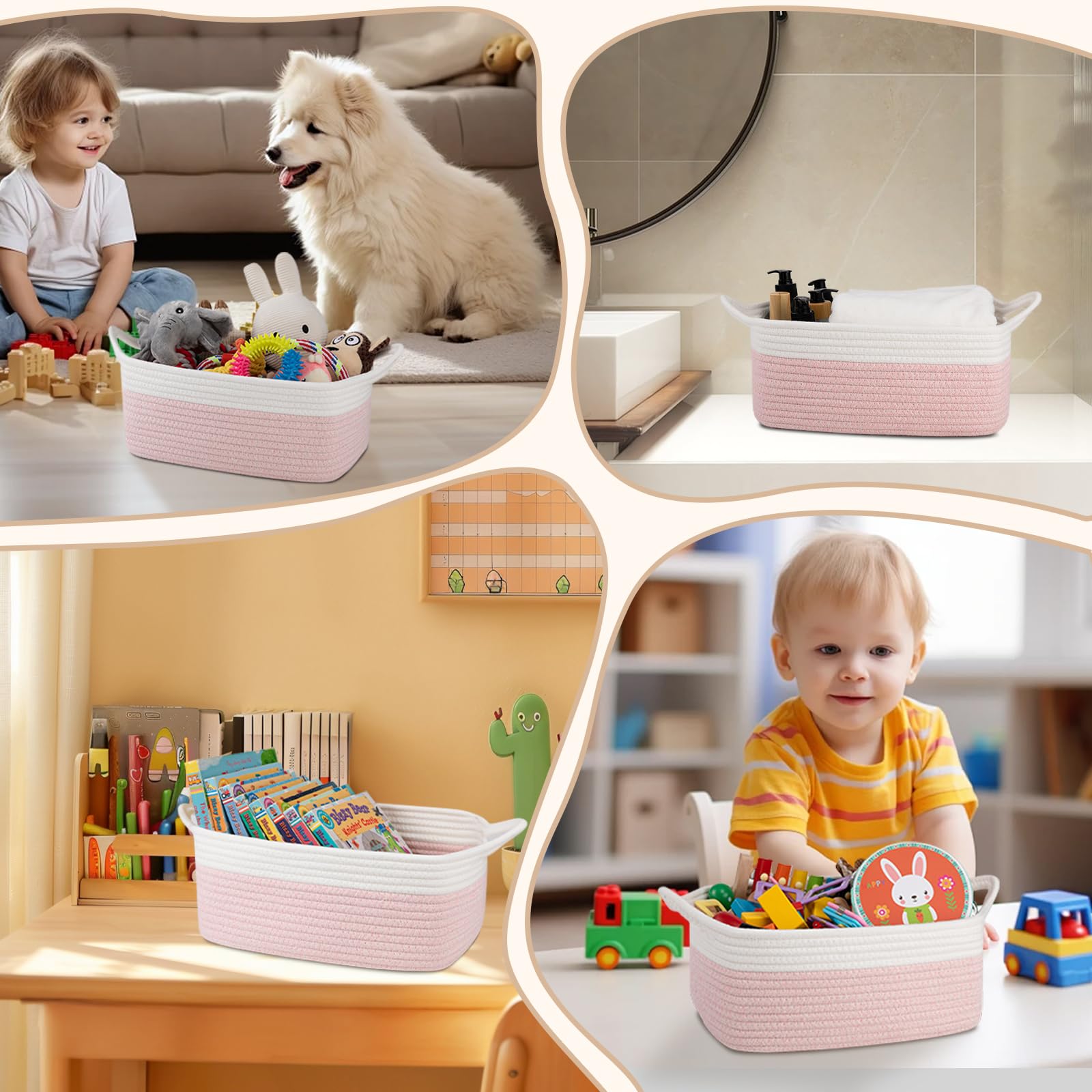 Multi functional storage: The woven basket has multiple practical functions and can store daily small items such as books, diapers, keys, fruits, snacks, etc. It can be used as a children's toy basket, dog toy basket, toiletries basket, shelf basket, or desktop organizing basket. It has a wide range of applicability and can be easily integrated into various home spaces, such as living rooms, bedrooms, children's rooms, washbasins, etc