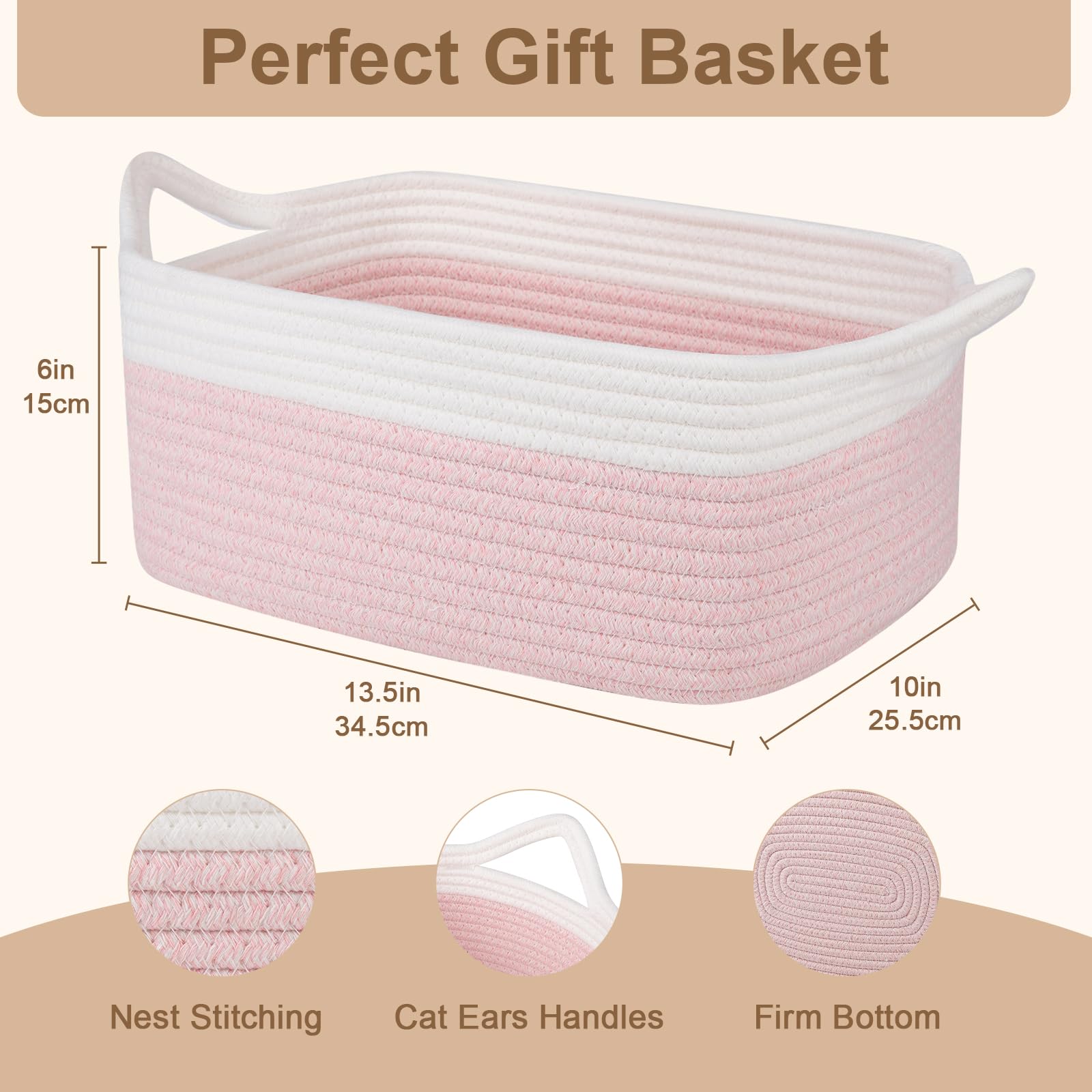 Safe Material: The basket is 13.5*10*6in and made of 100% pure cotton material, no chemical material, no odor, soft and skin friendly. It is no sharp edges that may scratch the floor, especially suitable for children and pets.We are passionate about providing you and your family with a healthy and clean home atmosphere