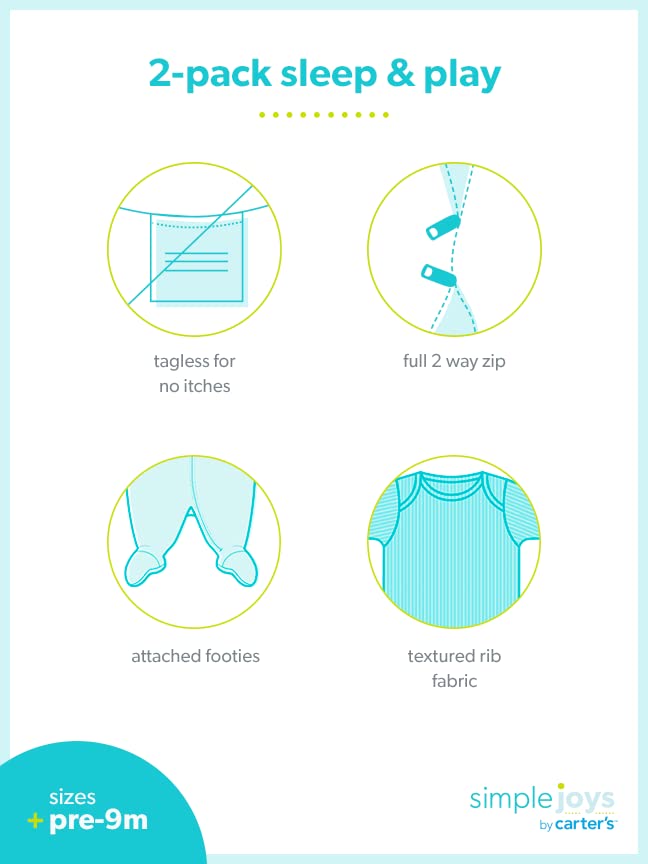 Description Keep your baby cozy and snug with the Simple Joys by Carter’s 2-Pack 2-Way Zipper Textured Sleep and Play outfits. Thoughtfully designed for everyday convenience, these versatile one-pieces are ideal for nap time, playtime, anytime moments. Each outfit features a practical two-way zipper, allowing quick and easy access for dressing and diaper changes. The safety tab at the chin ensures your little one’s delicate skin stays protected from irritation, making these outfits as comfortable as they are functional. With a selection of charming patterns and elevated textured fabrics, this 2-pack brings a touch of style to your baby’s wardrobe. From sweet prints to classic colors, these sleep & play pieces are as delightful as they are practical. Parents can trust that these pieces are OEKO-TEX® certified, ensuring that they meet rigorous standards for safety and environmental responsibility. They are also machine washable for effortless cleaning, holding up well after multiple washes. Whether it’s time for sweet dreams or lively adventures, these sleep and plays are a go-to essential for your baby’s wardrobe.
