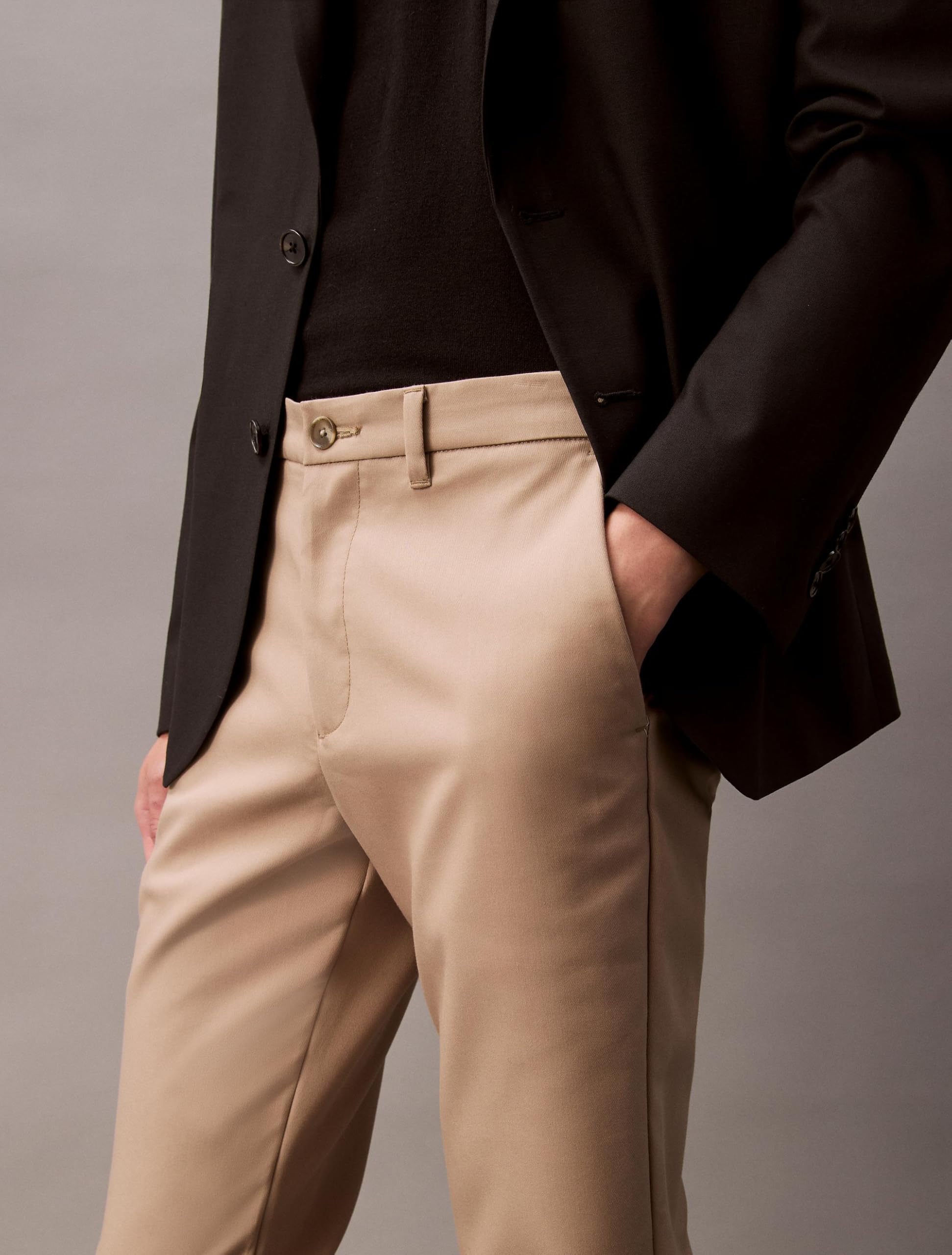 CONSIDERED DESIGN: With a zip fly, button closure, and front slip pockets, Calvin Klein’s men’s chinos feature subtle CK logo detailing at the back pocket for a signature finish.
