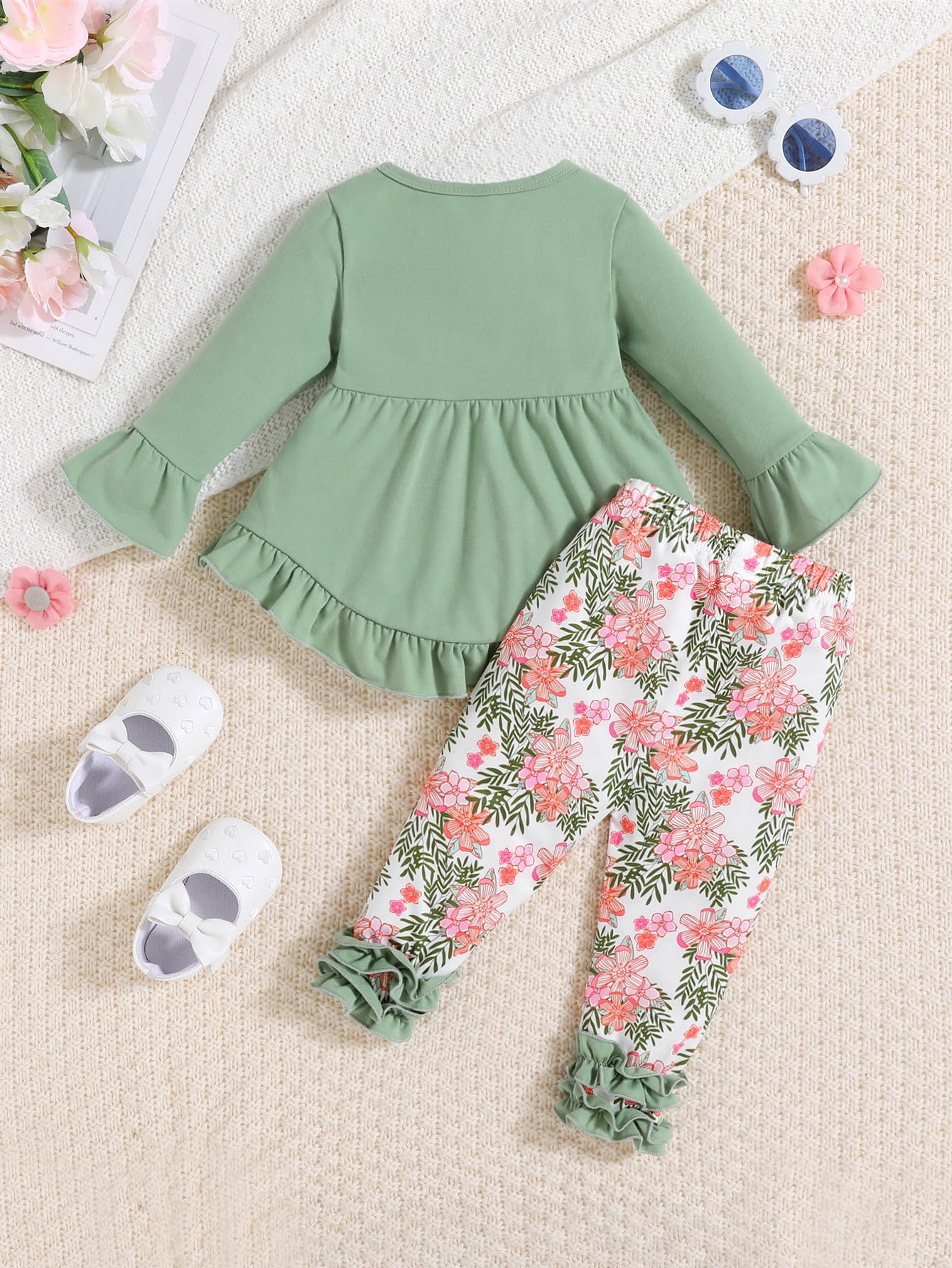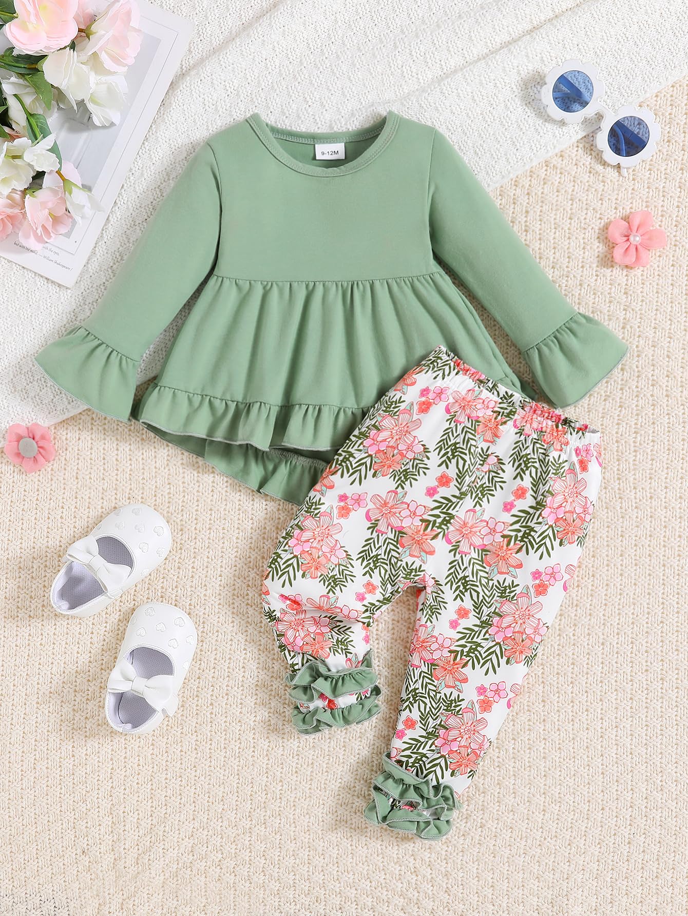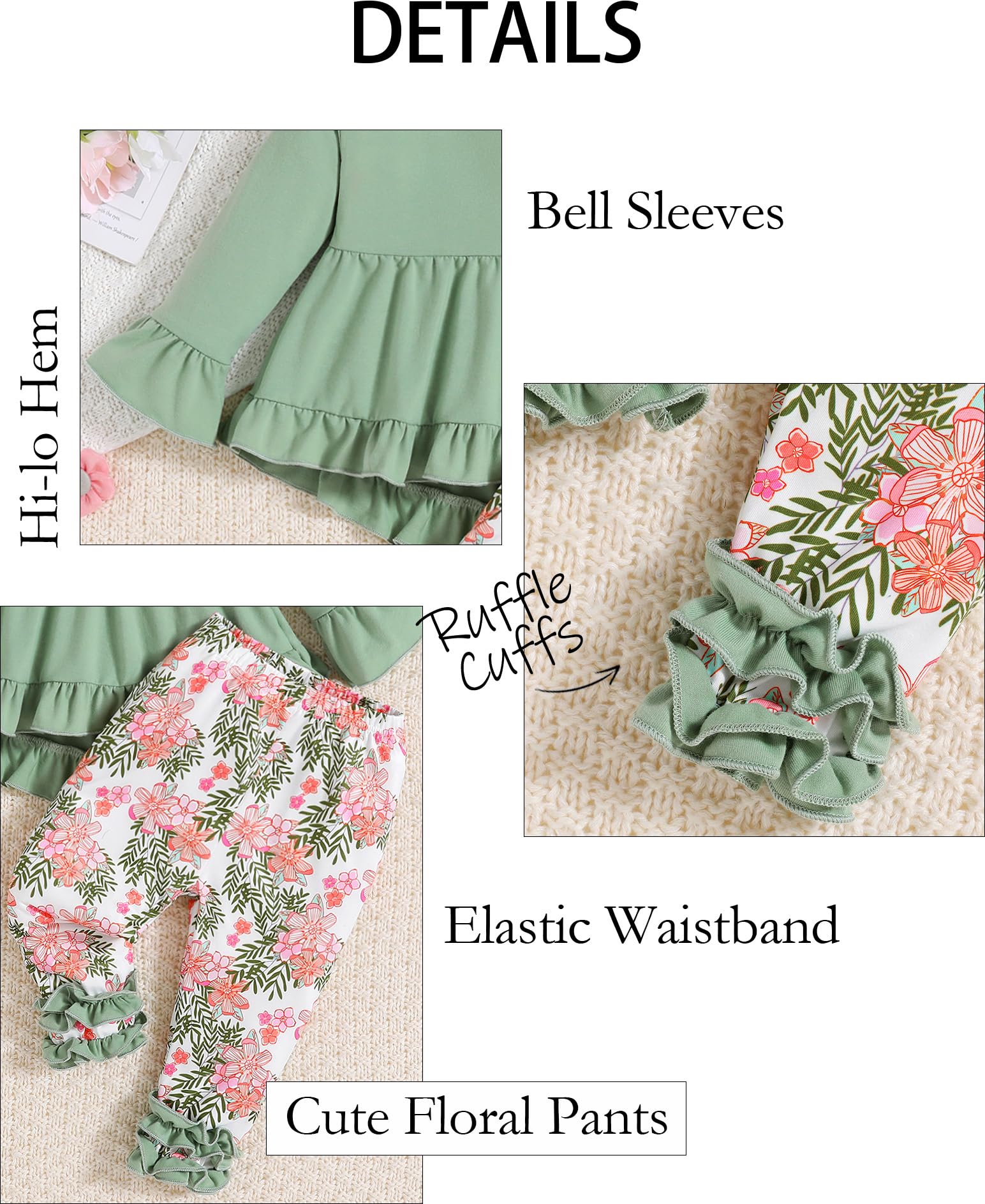 DESIGNS: The baby clothes set features long sleeve ruffle top with high low hem design, baby girls ruffle pants with a comfortable elastic waistband, floral print,and adorable ruffle detail, which accentuate the children's beauty and loveliness.