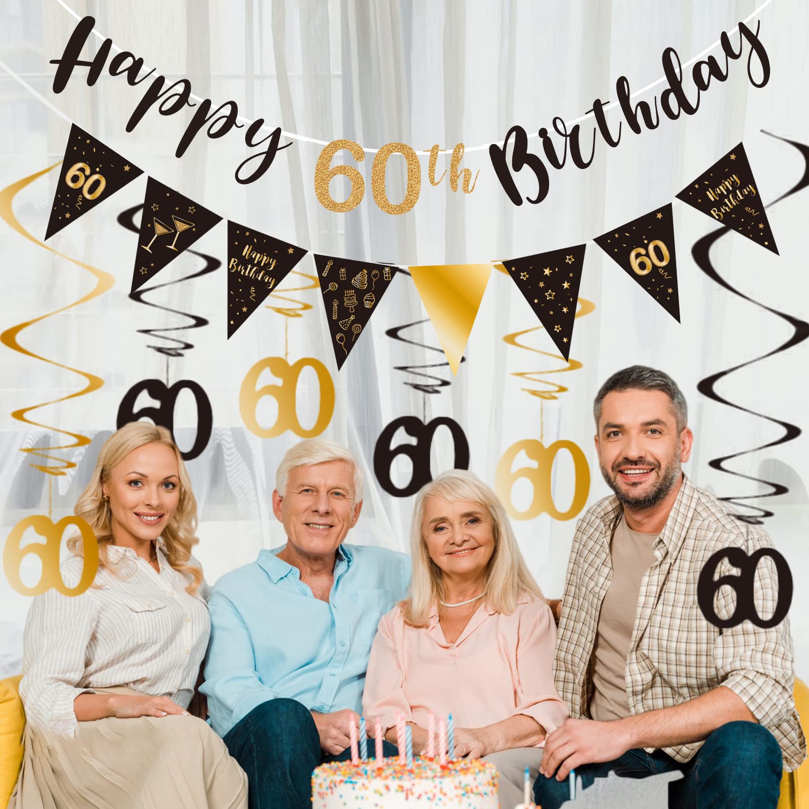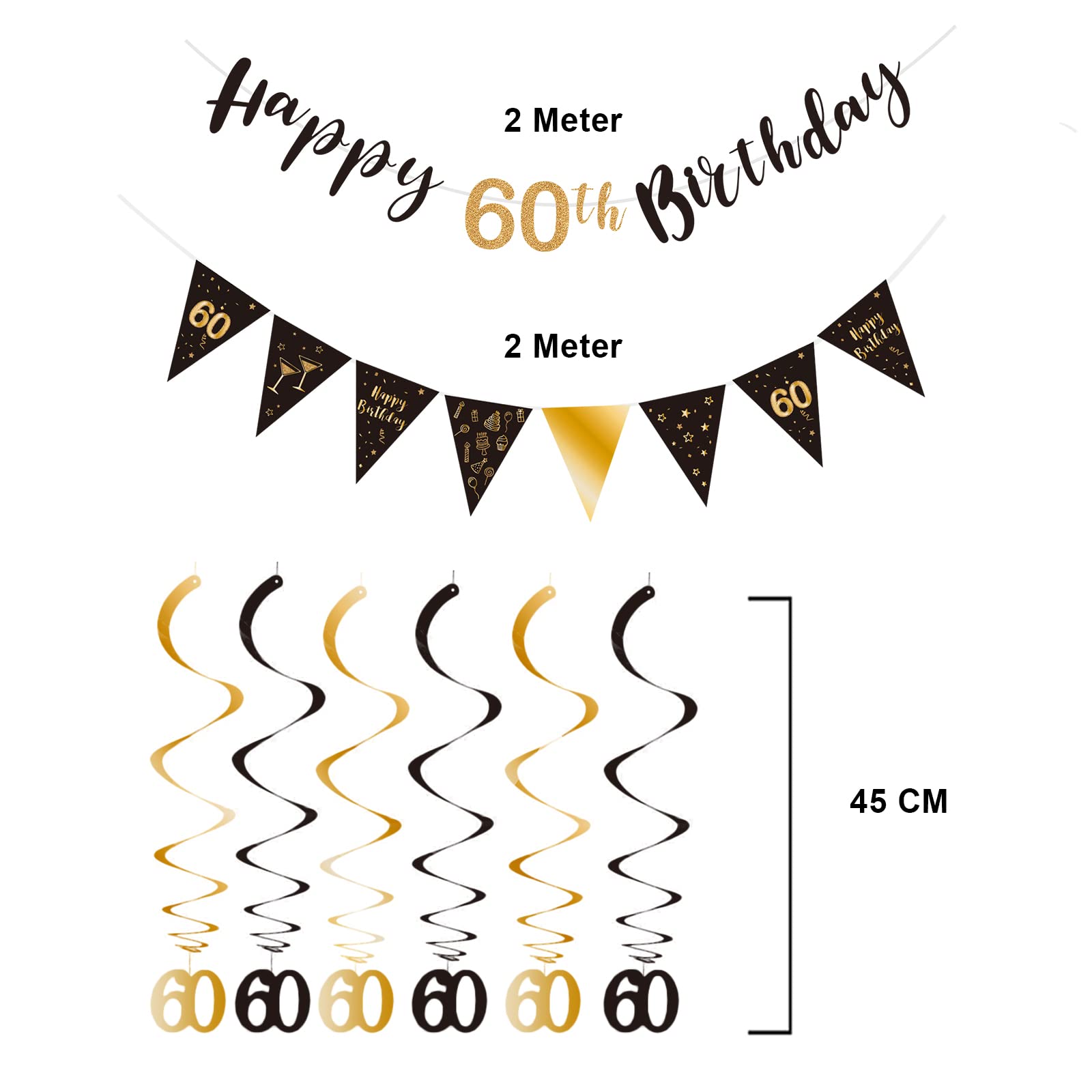The package includes: Happy 60th birthday banner(1 set), triangle banner(1 set), hanging swirls(6 pcs).