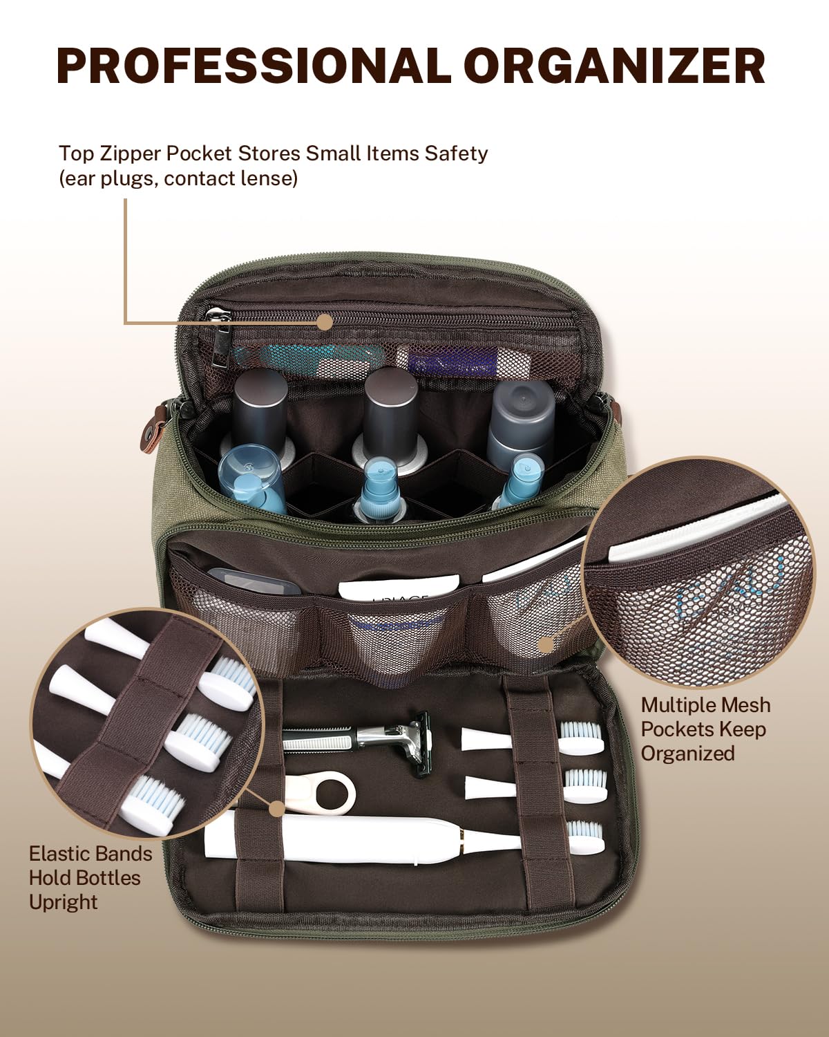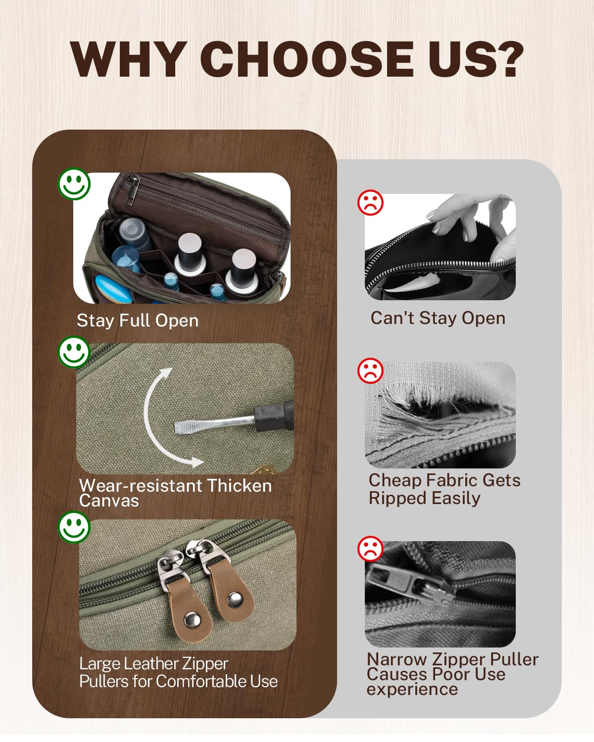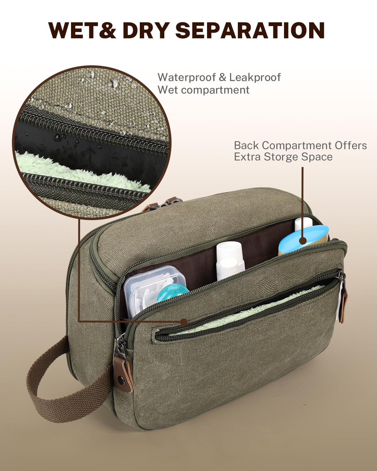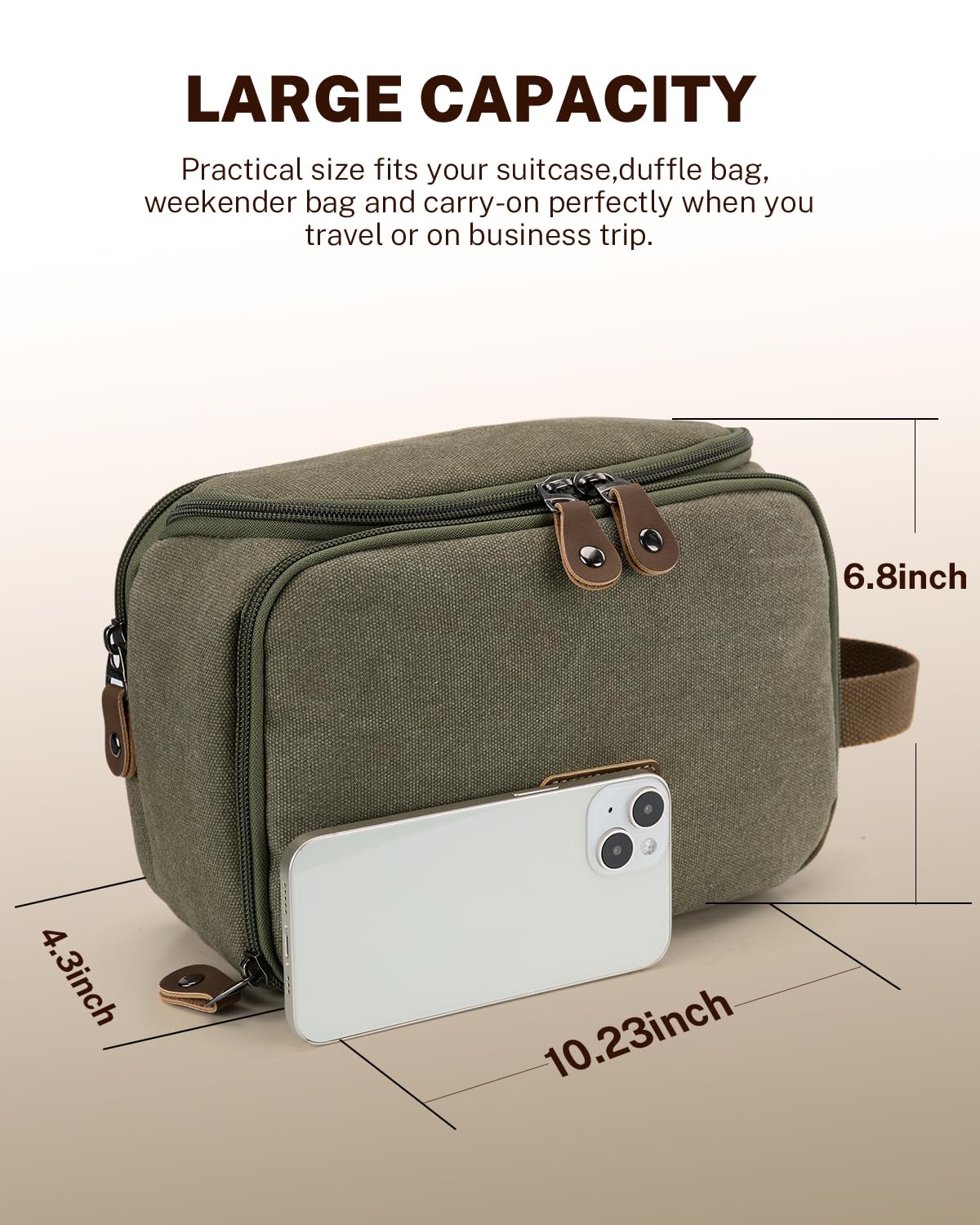 Premium Materials : Crafted from durable water resistant canvas, our mens toiletry bag is built to last, ensuring long-term use without wear and tear. Equipped with durable zippers with comfortable leather zipper puller, it ensures secured closure and comfortable access to your toiletries.