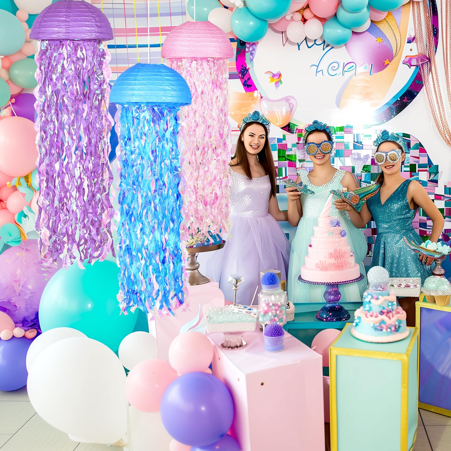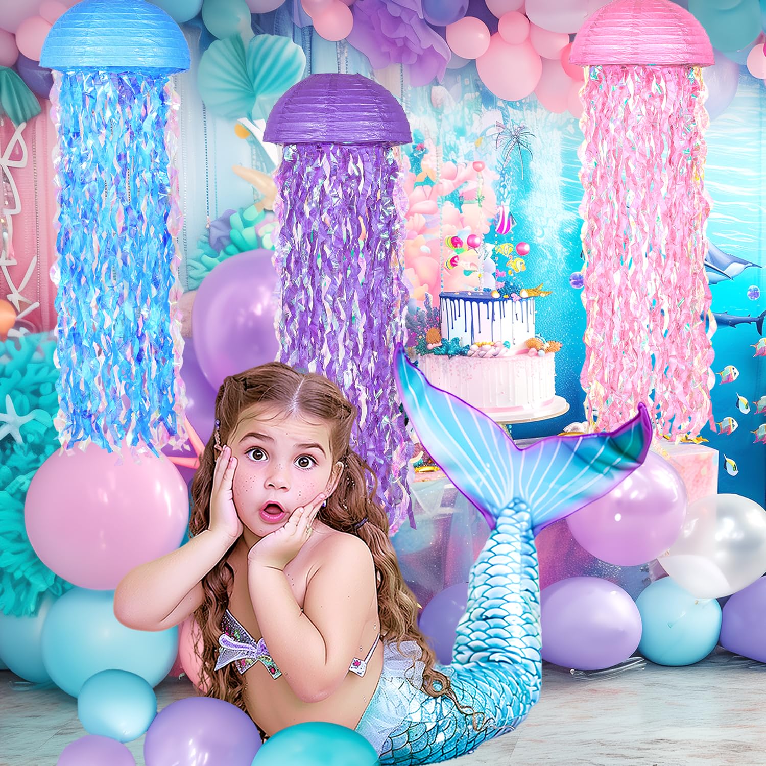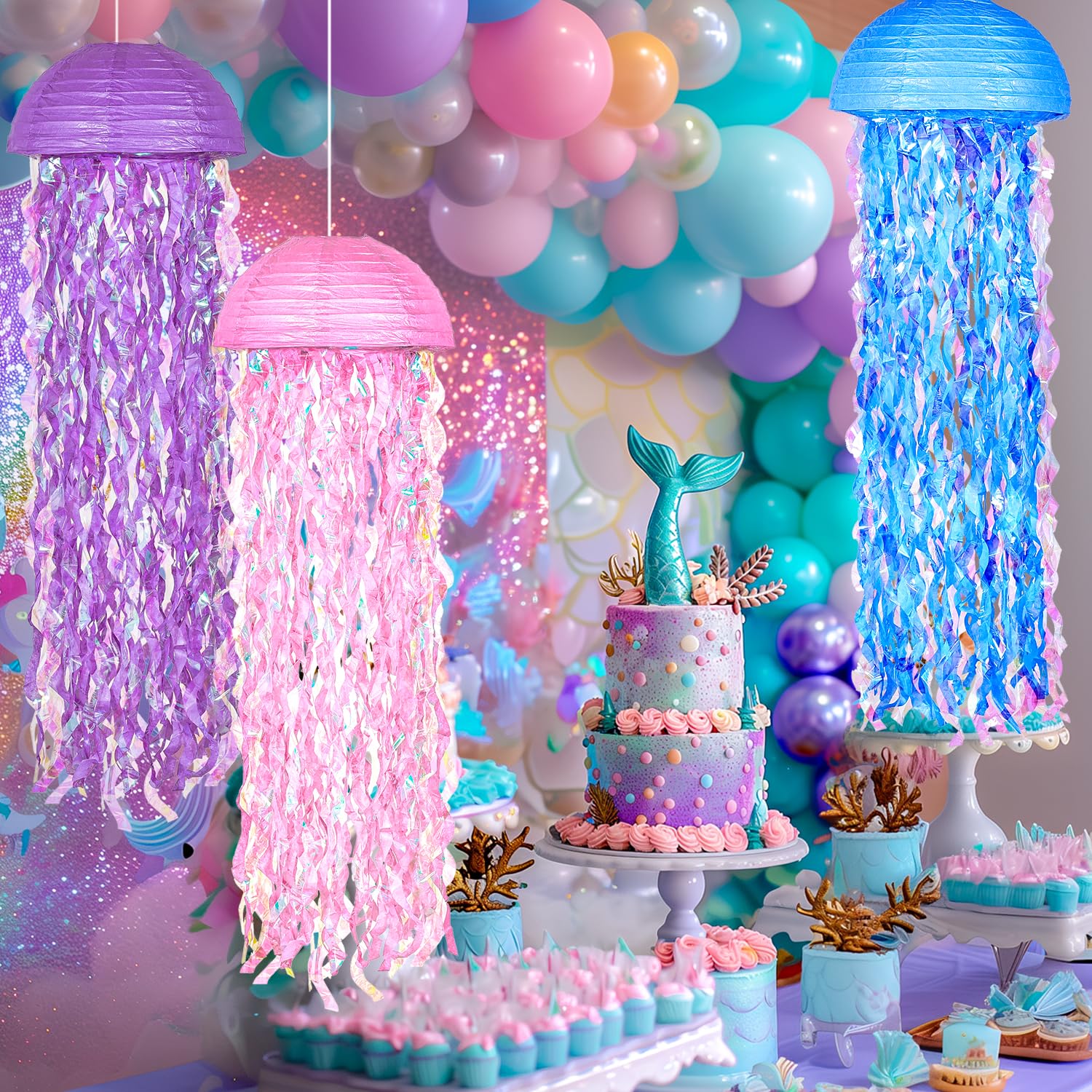 đăComplete Set & Coordinates with Other Party DecorăIncludes six (6) 10-inch jellyfish paper lanterns in coordinated mermaid colors. Whether used for ceilings, tents, or backdrop displays, they pair beautifully with balloon garlands, banners, and other mermaid-themed supplies to create a cohesive, photo-ready under-the-sea setup.