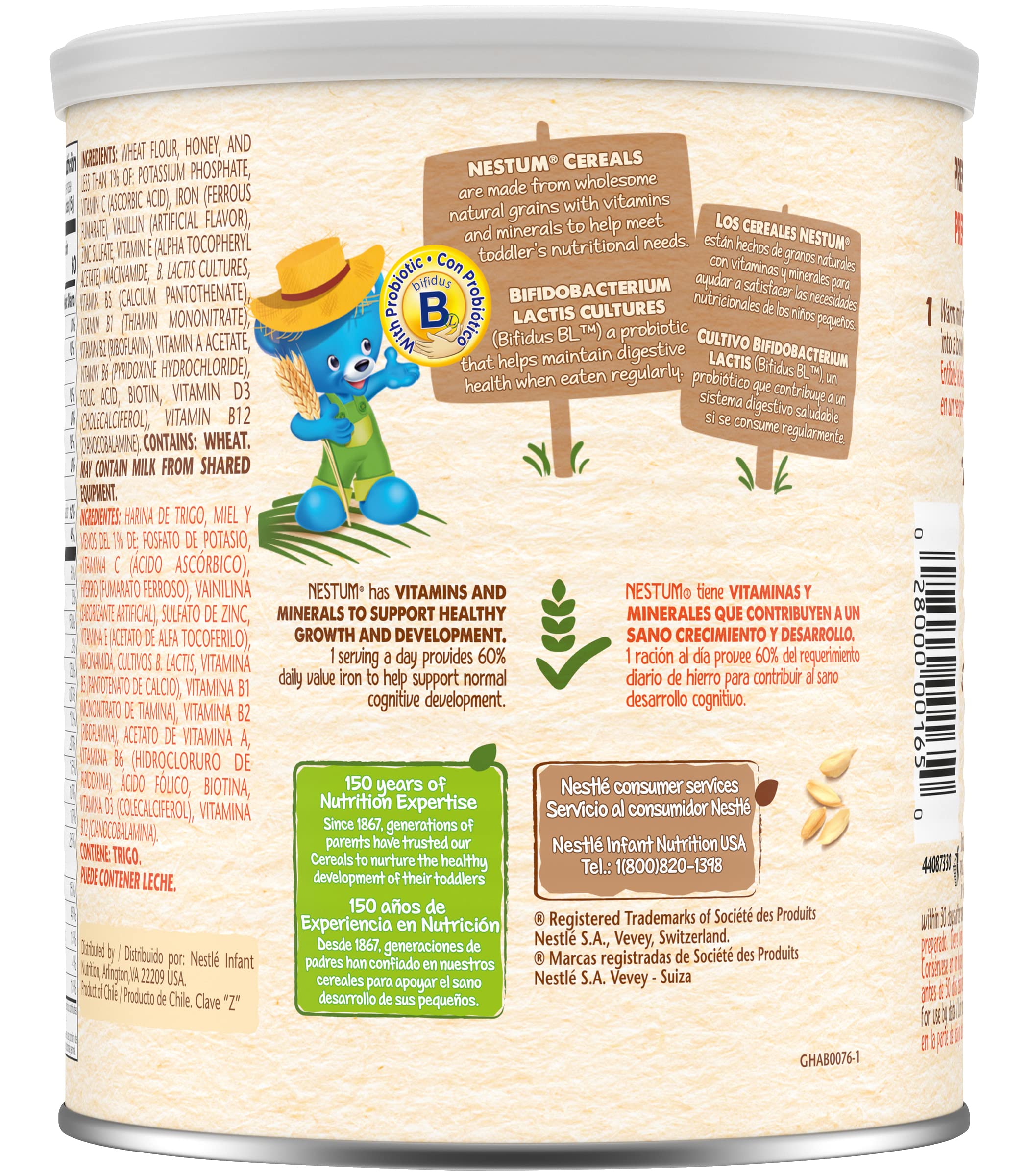 Nestle Nestum Infant Cereal, Wheat & Honey, 10.6 Ounce Canister: Crafted with delicious ingredients to help your little one blossom. This Nestum cereal contains carefully selected grains with 12 vitamins and minerals and 60% daily value of Iron. Great to help support healthy development for your baby. Nestum is made with wholesome grains and vitamins and minerals to support healthy growth, including iron to help support brain development and learning ability. Our cereals are made with wholesome ingredients. Also, they are easy to prepare for a satisfying cereal for your little one. With a range of cereals made for little ones from 6-12+ months, there’s a Nestum product to help nourish little tummies of all ages. This Nestum cereal is made for babies 12+ months.