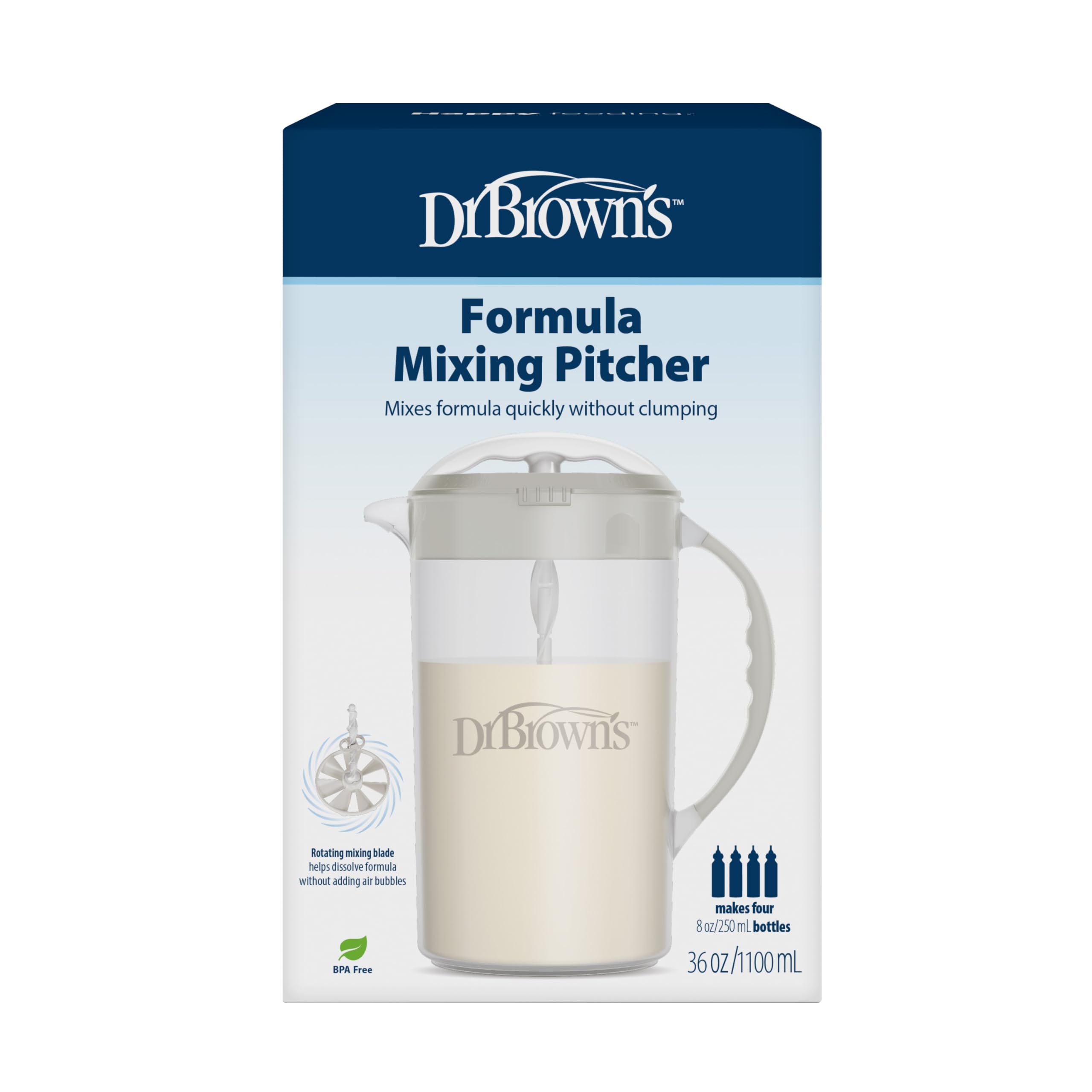 Dr. Brown's Formula Mixing Pitcher offers fuss-free bulk formula preparation for up to four (4) 8 oz/250 mL baby bottles at once. The mixing pitcher's unique blade quickly dissolves and blends up to 36 ounces of formula with no leftover clumping. An adjustable stopper keeps the mixing blade from lifting above the liquid, reducing the amount of air that enters baby's formula to help minimize air-swallowing during feeding and reduce gas. The locking lid prevents spills, and the less-mess spout offers easy and convenient pouring. Available in an array of stylish colors including olive, orange, teal, blue, and black. The Formula Mixing Pitcher is easy to disassemble, and all parts are dishwasher safe (top rack only).