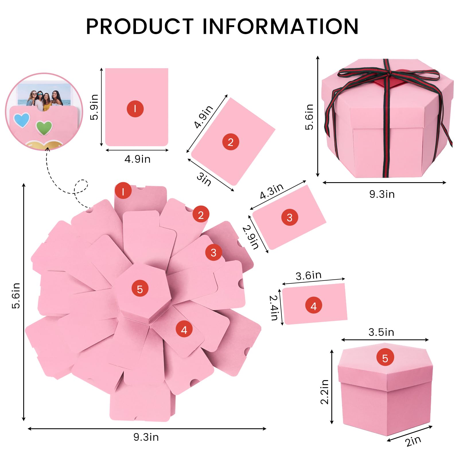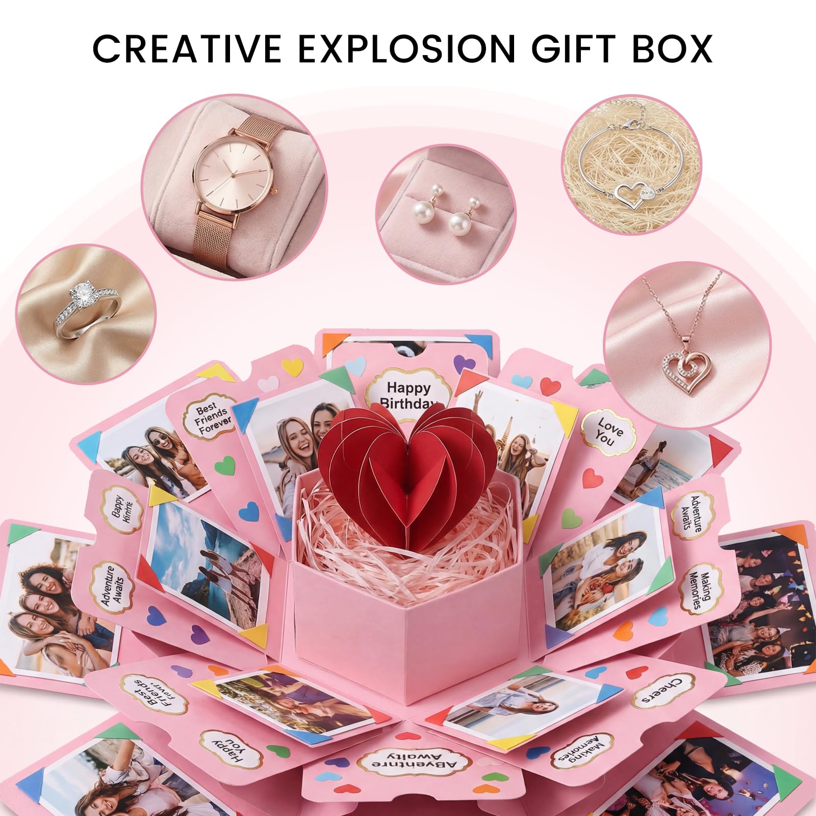 Unfold Surprises, Cherish Memories - You'll find a super surprise when this pink gift box opens. 4 layers of cards will explode. You can paste carefully selected photos on every layer, up to 36 pieces. The smallest gift box can hold gifts like rings, lipstick, necklace, watch, earrings, chocolates, perfume, etc., creating an unforgettable memory for your loved ones
