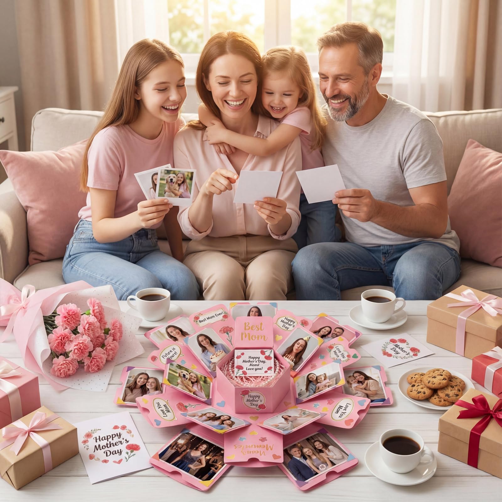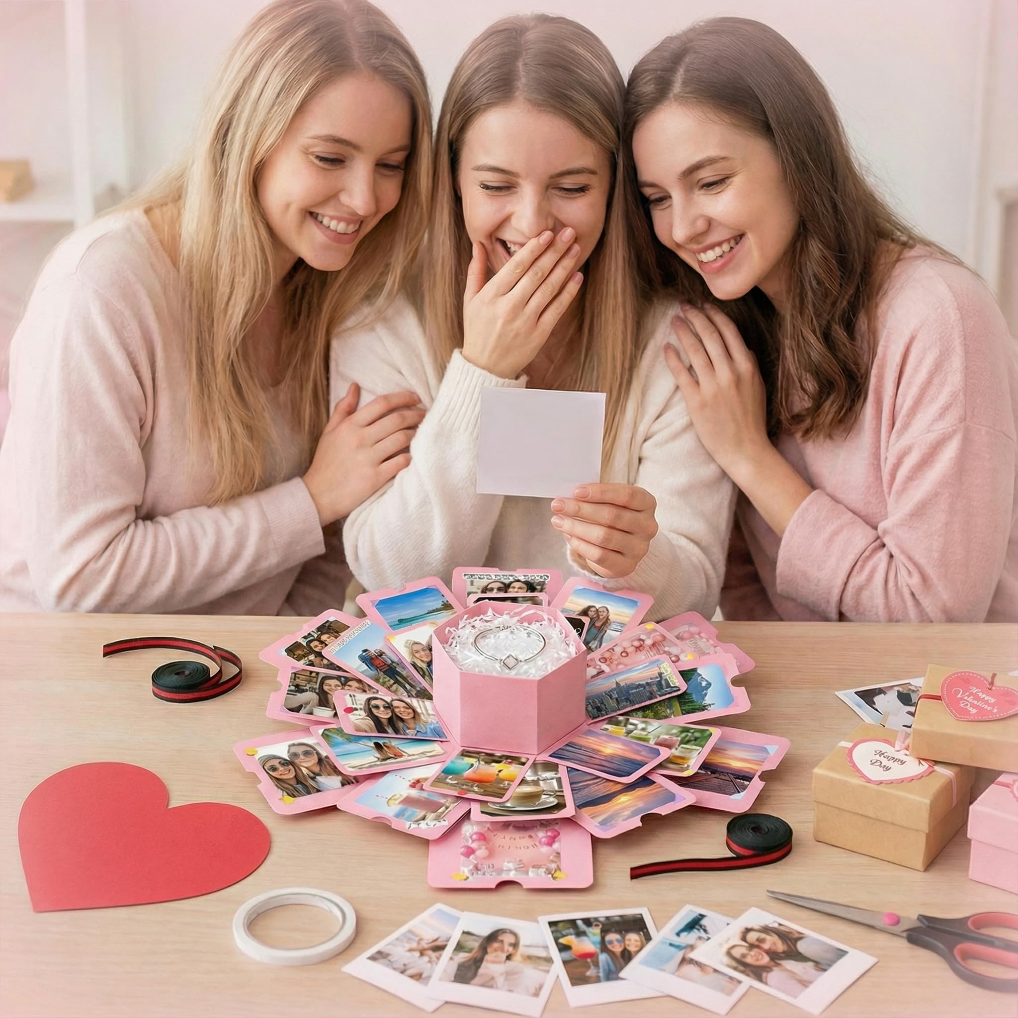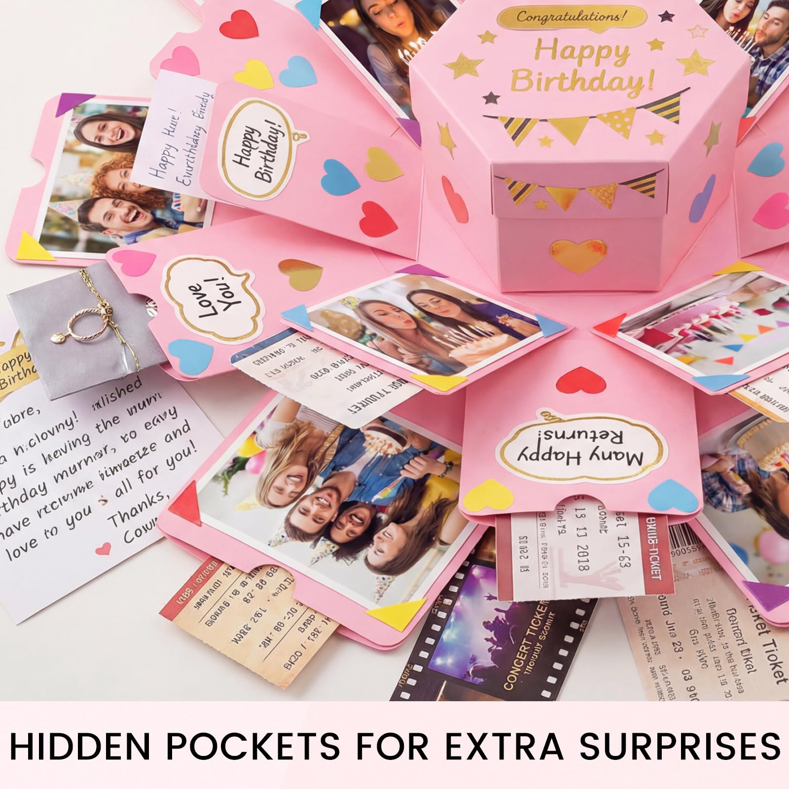 Selling Point | Hidden Pockets for Extra Surprises——The explosion box includes hidden pockets, perfect for storing small gifts, love notes, or keepsakes. You can place items like rings, earrings, tickets, or handwritten messages inside. Each layer reveals a new surprise, adding an extra touch of thoughtfulness and excitement to the gift. These pockets make the unboxing experience even more special, creating unforgettable moments with every reveal