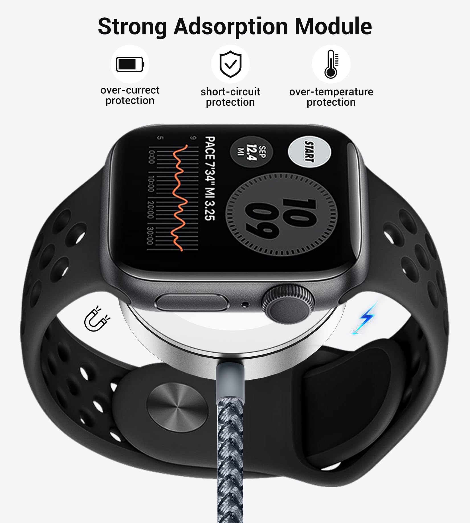 【Magnetic iWatch Charger】With auto-alignment magnetic technology, this charger effortlessly snaps into place, ensuring a secure and efficient charge as it automatically aligns with the back of your Apple Watch.(please note: for optimal charging, avoid using an Apple Watch protective case)