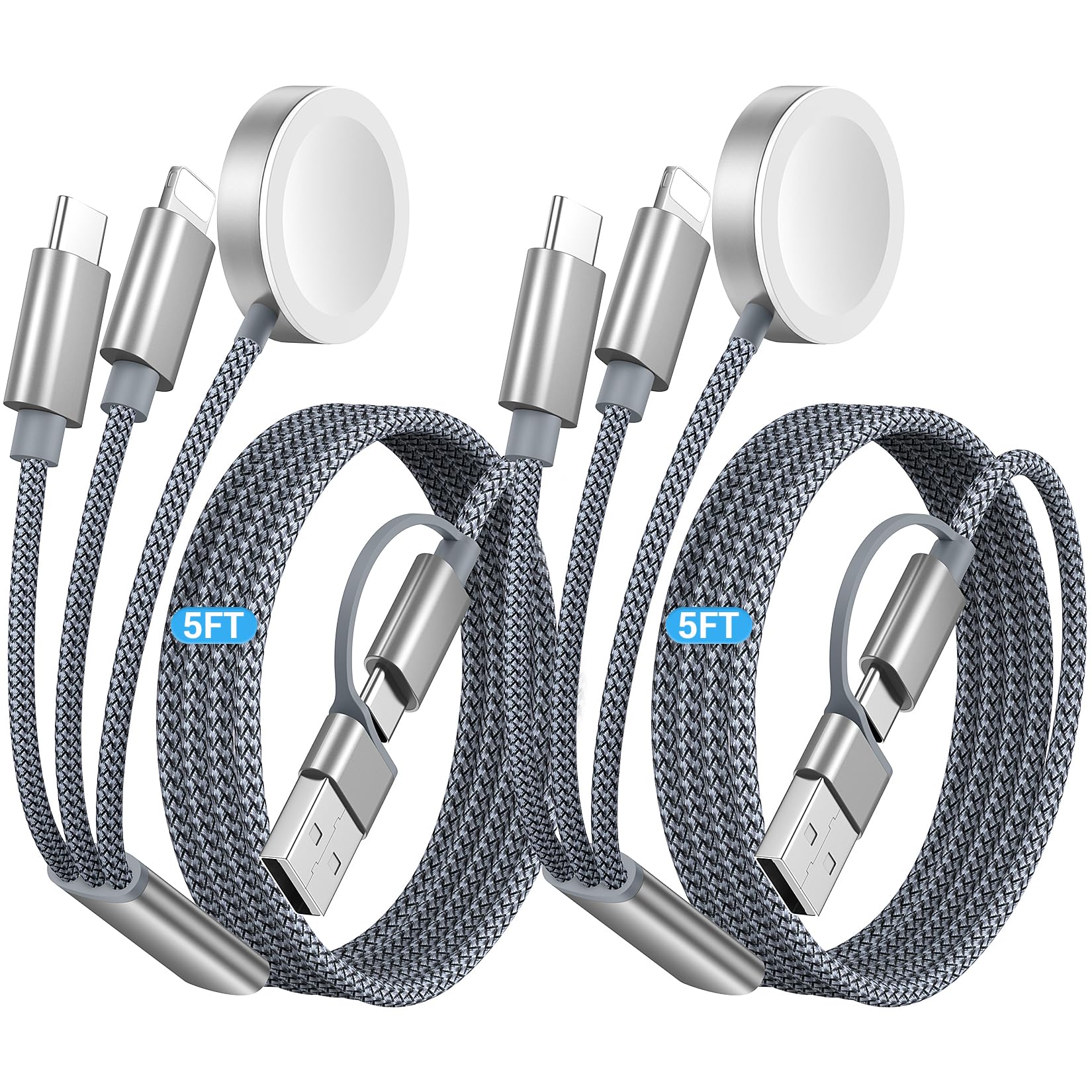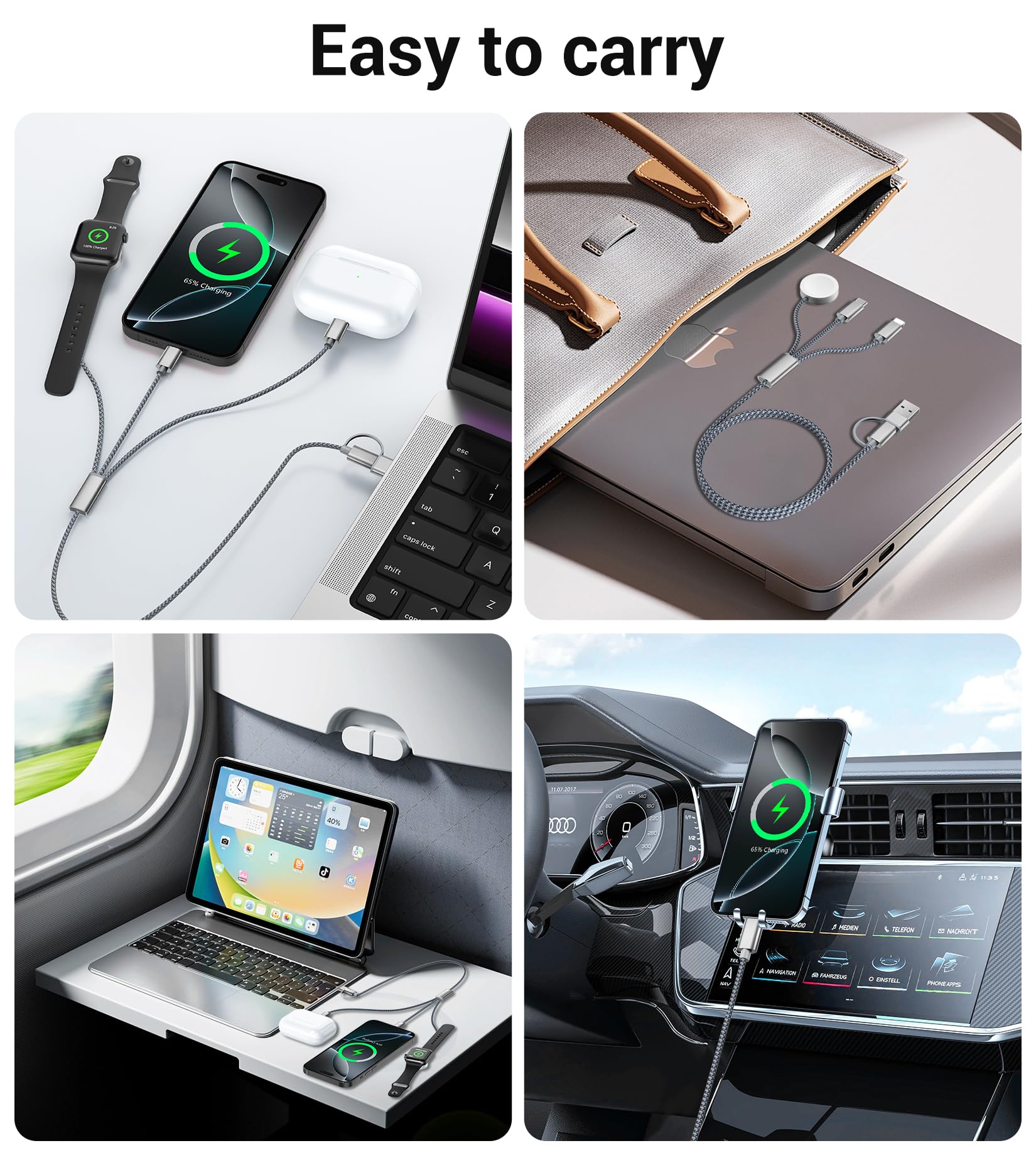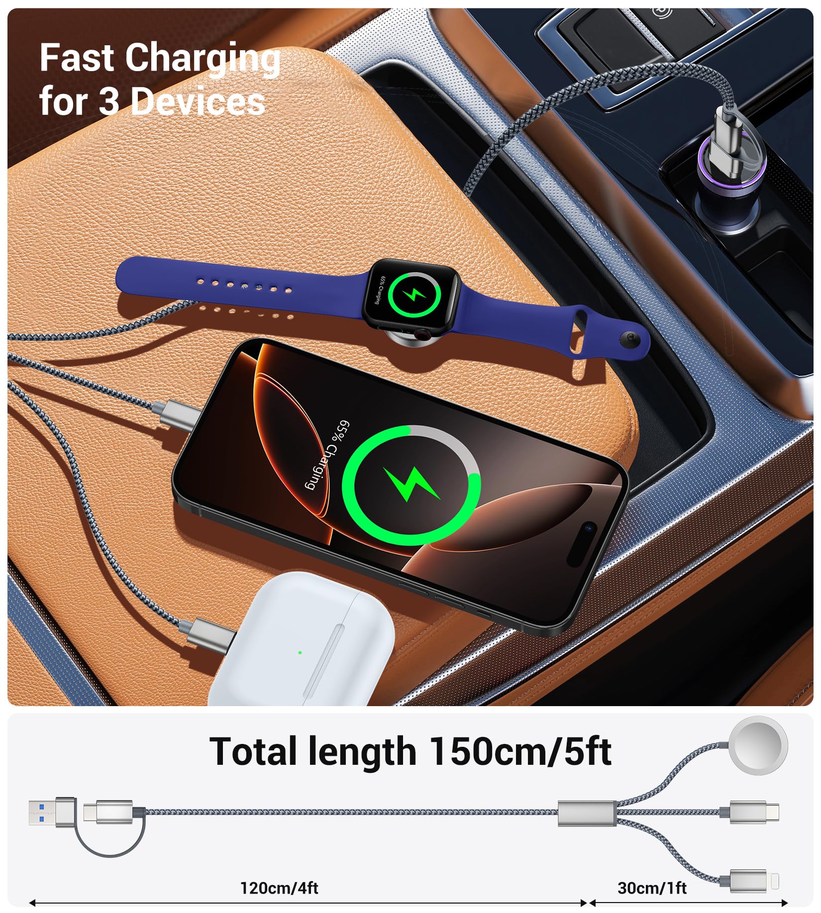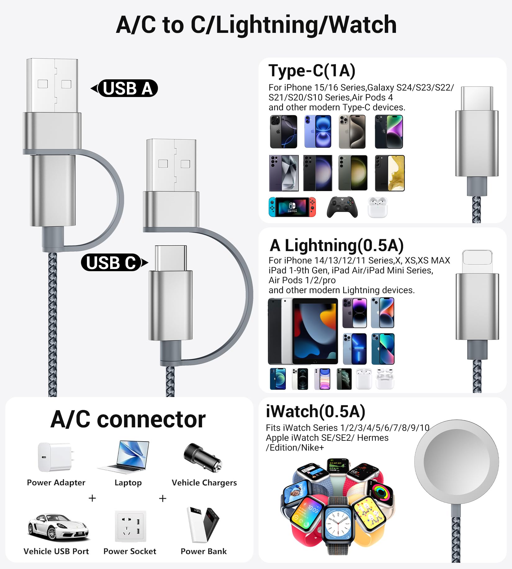 【2-Pack & 3-in-2 Multi Charging Cable】 3-in-2 multi charging cable provide 6 charging modes (USB-C/A for Apple Watch charger, Lightning, and Type-C),which compatible with all iWatch Ultra series 11/10/9/SE/8/7/6/5/4/3/2/1, compatible with iPhone 12-17/iPad (Lightning/USB-C).A portable travel charger for multiple devices,designed for simultaneous charging of multiple devices