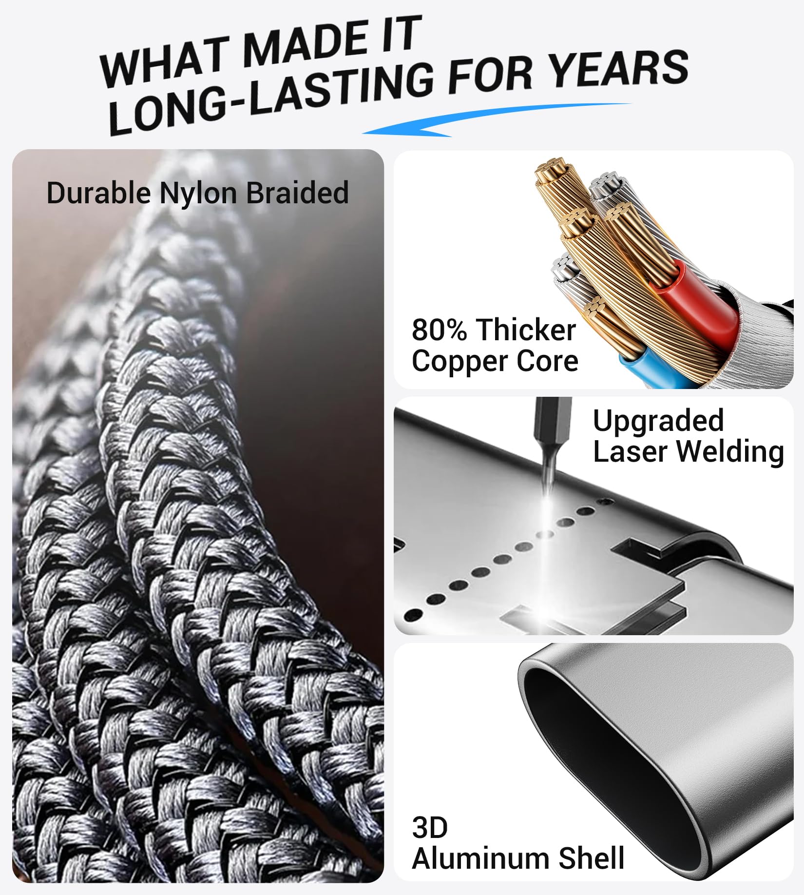 【High-Quality Materials】Crafted with durable nylon braid and a laser-welded 3D alloy connector, this multi-charging cable withstands 45,000+ stretch tests while offering Long-term limited warranty support for iPhone charger cord or multi-device charger replacements