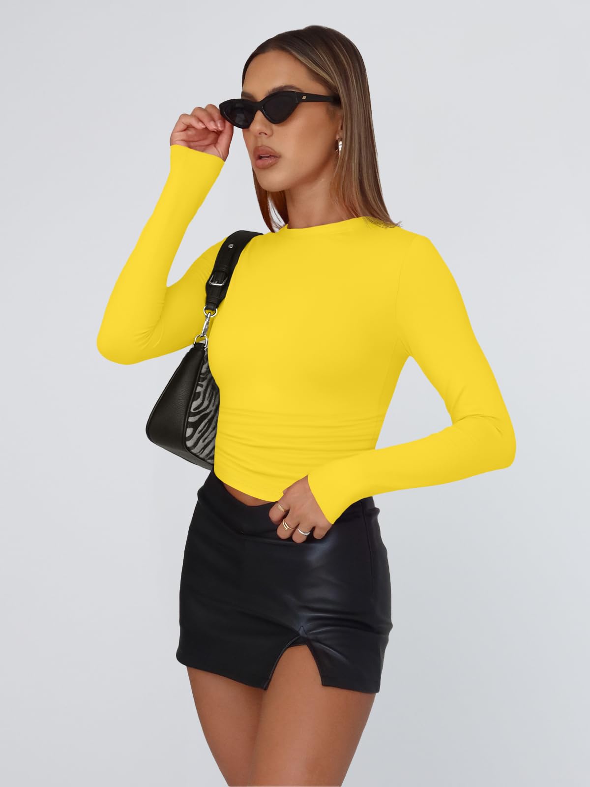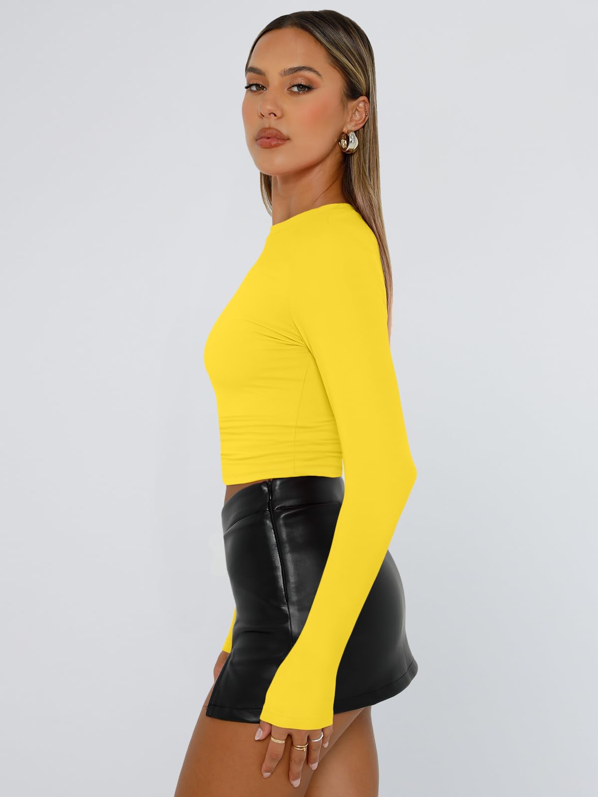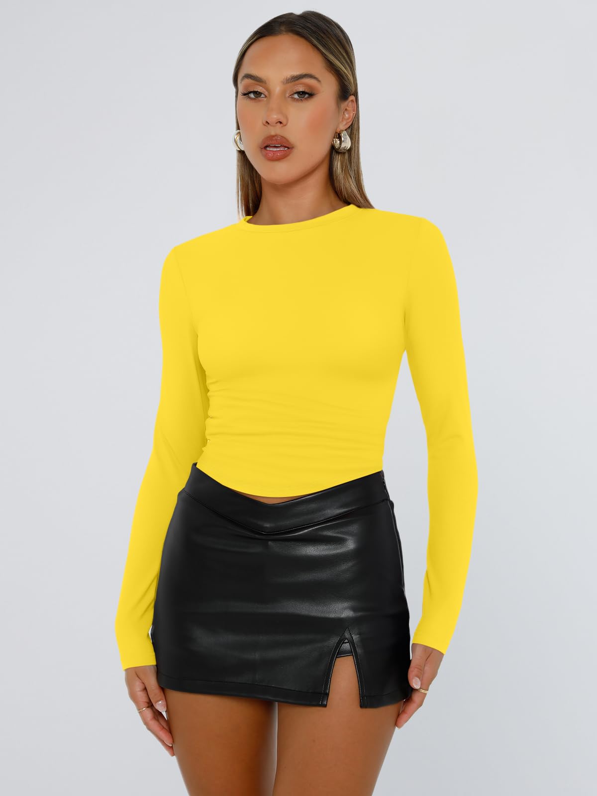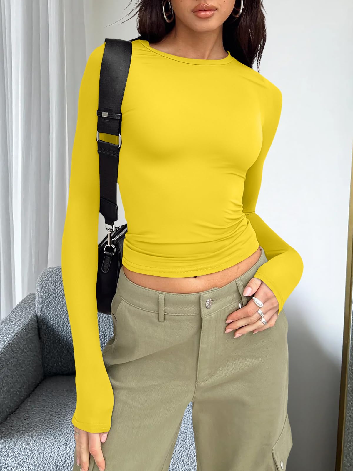 Design: Cropped and stretch fitted style,crew neck, tight underscrubs layer,you can wear it regularly or fold it up like a crop top,cute,slim fit,casual y2k style fashion