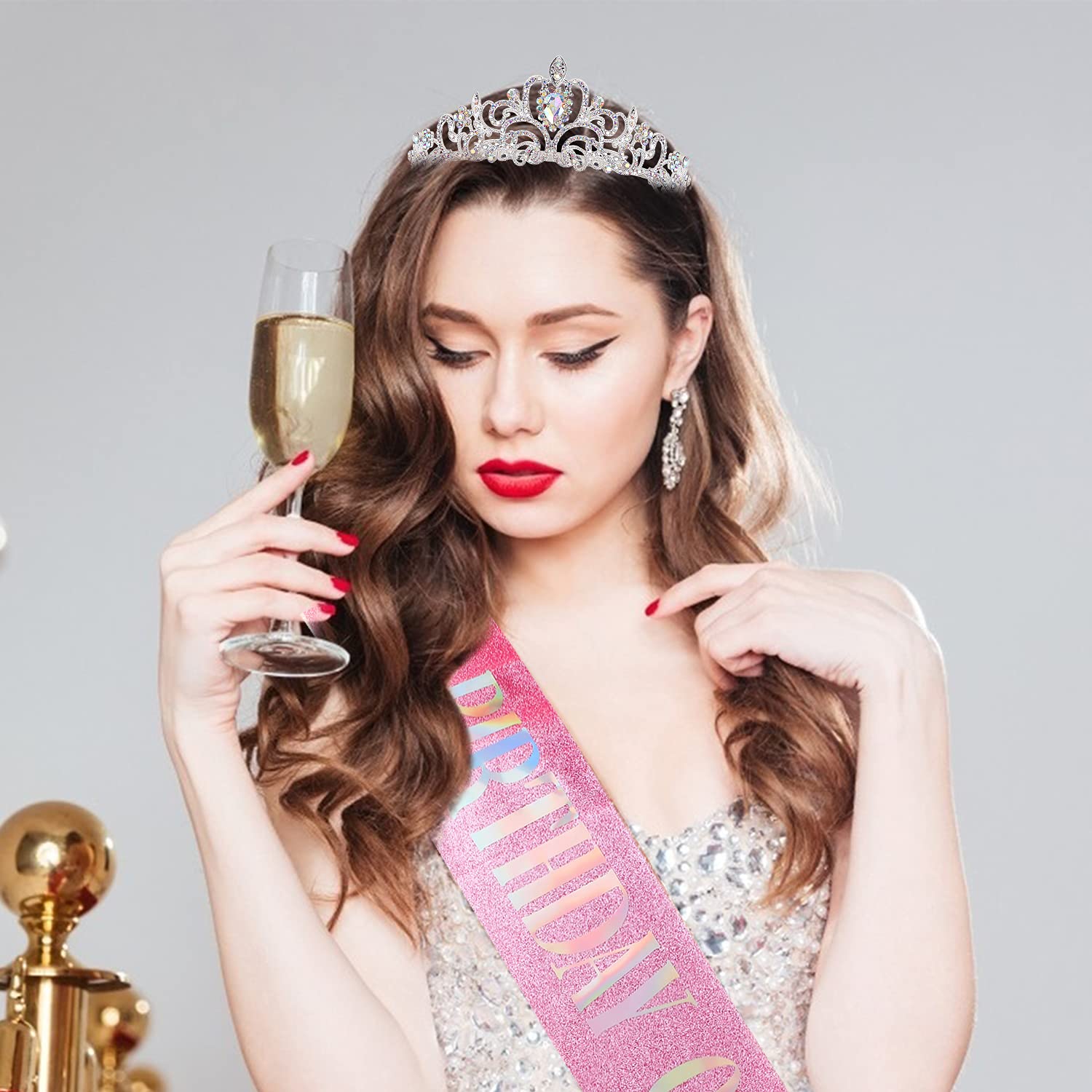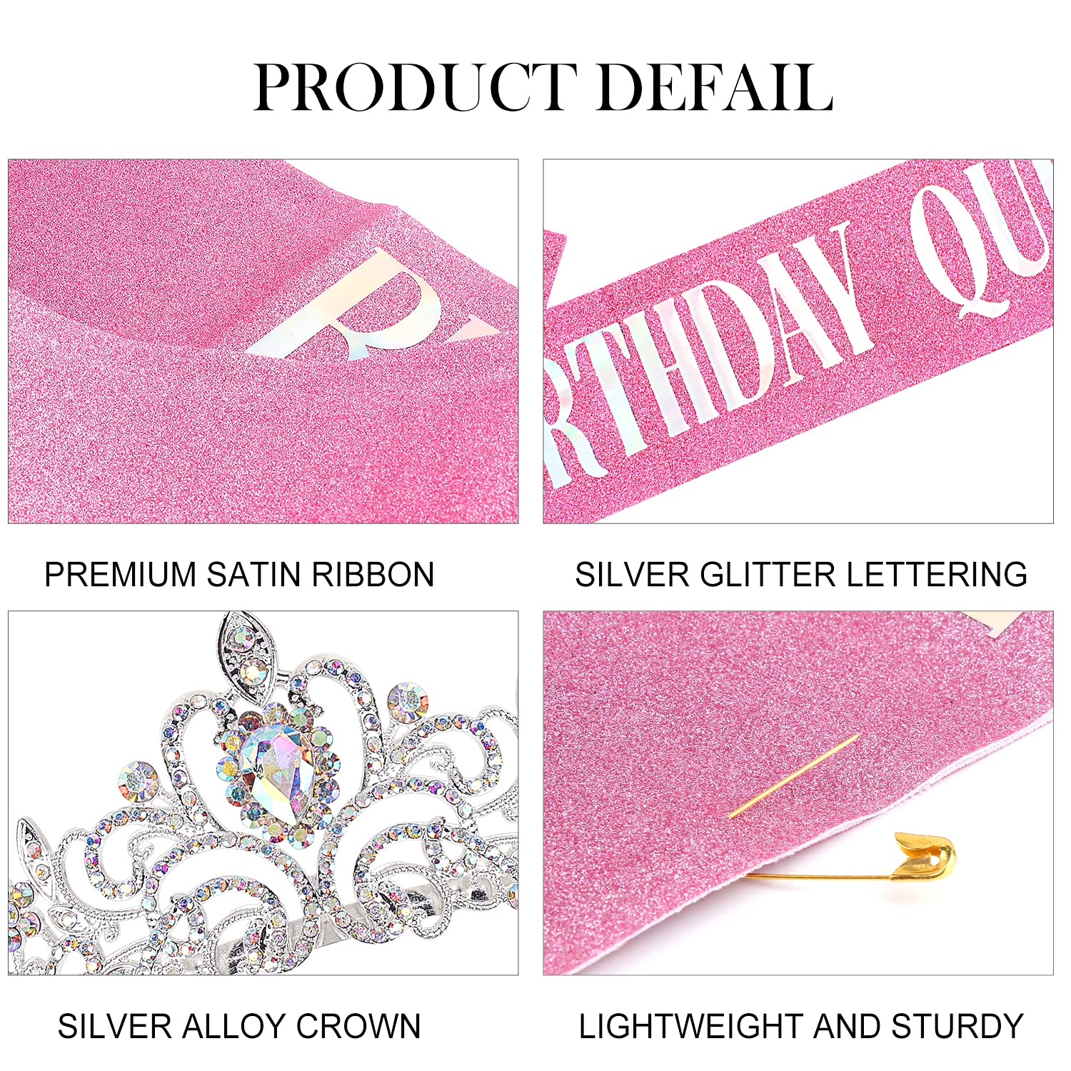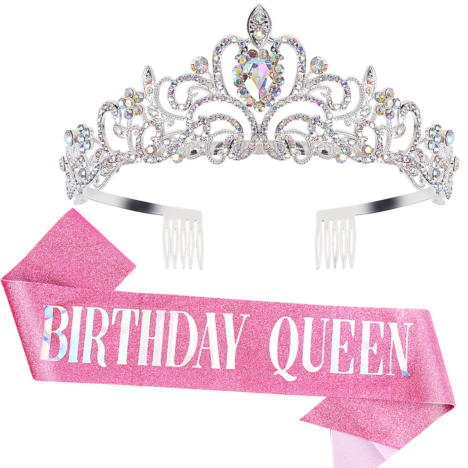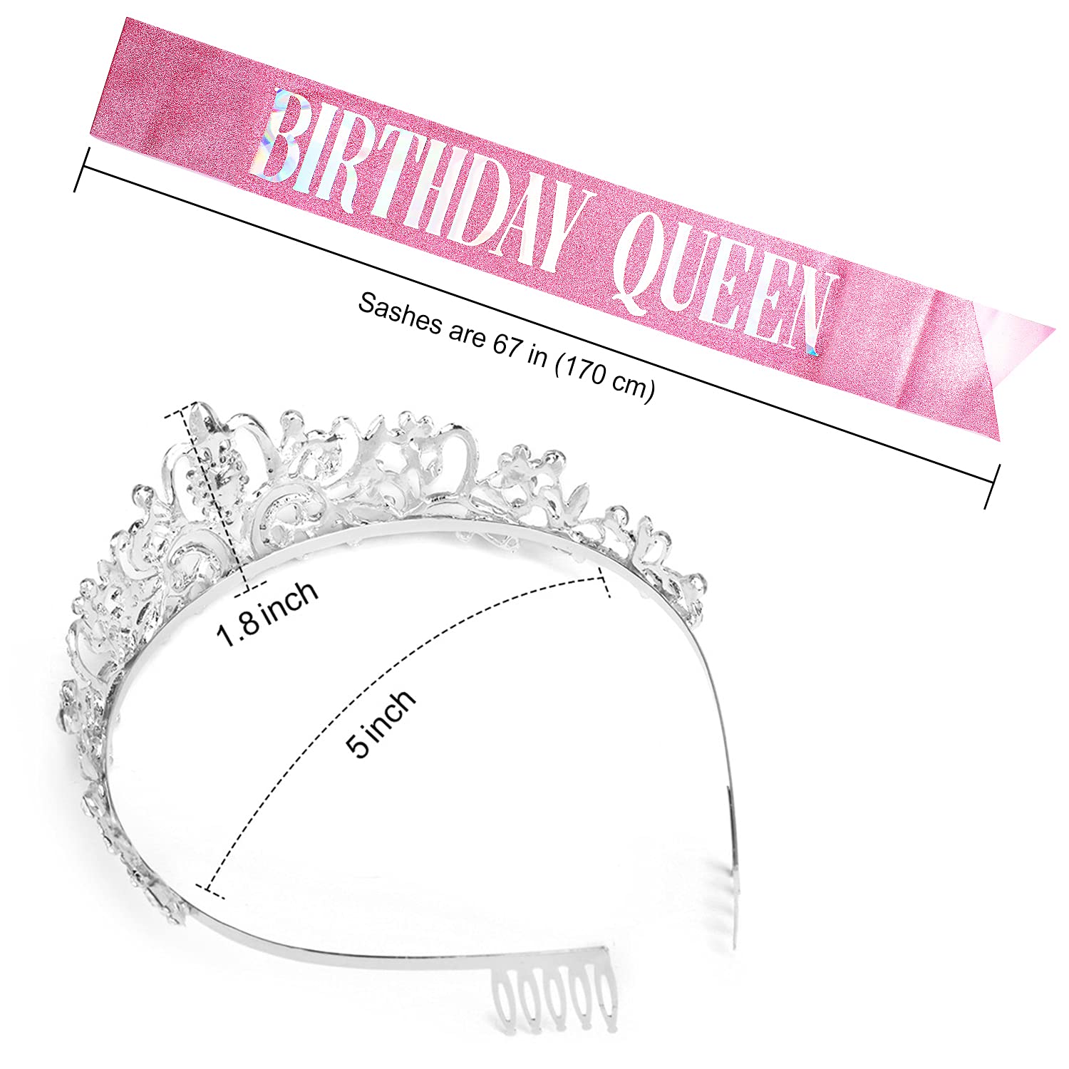🎁SASH + CRYSTAL TIARA - Our sash is constructed of the most beautiful glitter material and hand pressed foil that reads "BIRTHDAY QUEEN" - each sash measures 3.5 inches wide and 33 inches long. The birthday tiara is made of rhinestone and alloy, sparking and beautiful make you more charming and eye-catching. Each tiara measures 4.92 in (12.5 cm) in diameter, 1.57 in (4 cm) in height.