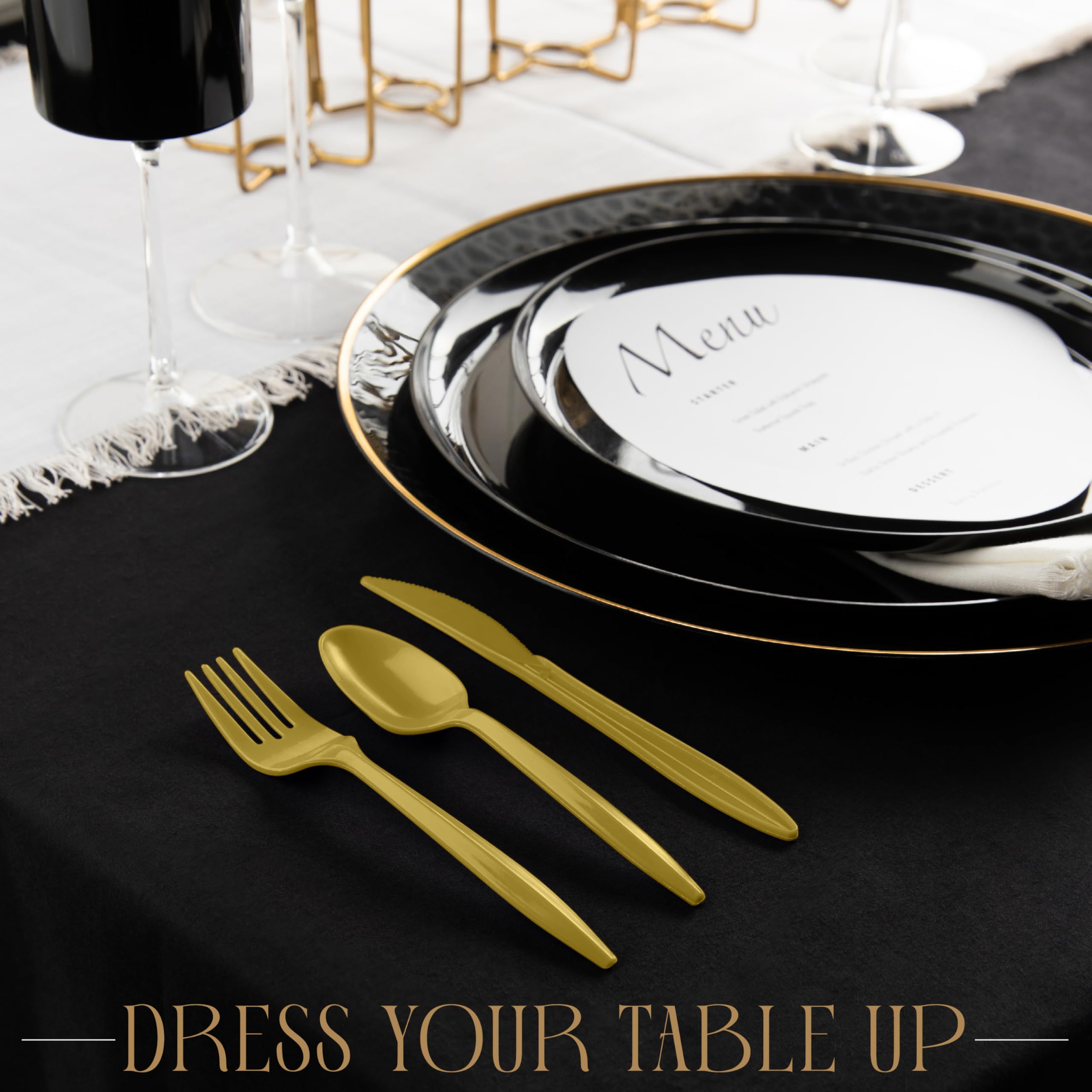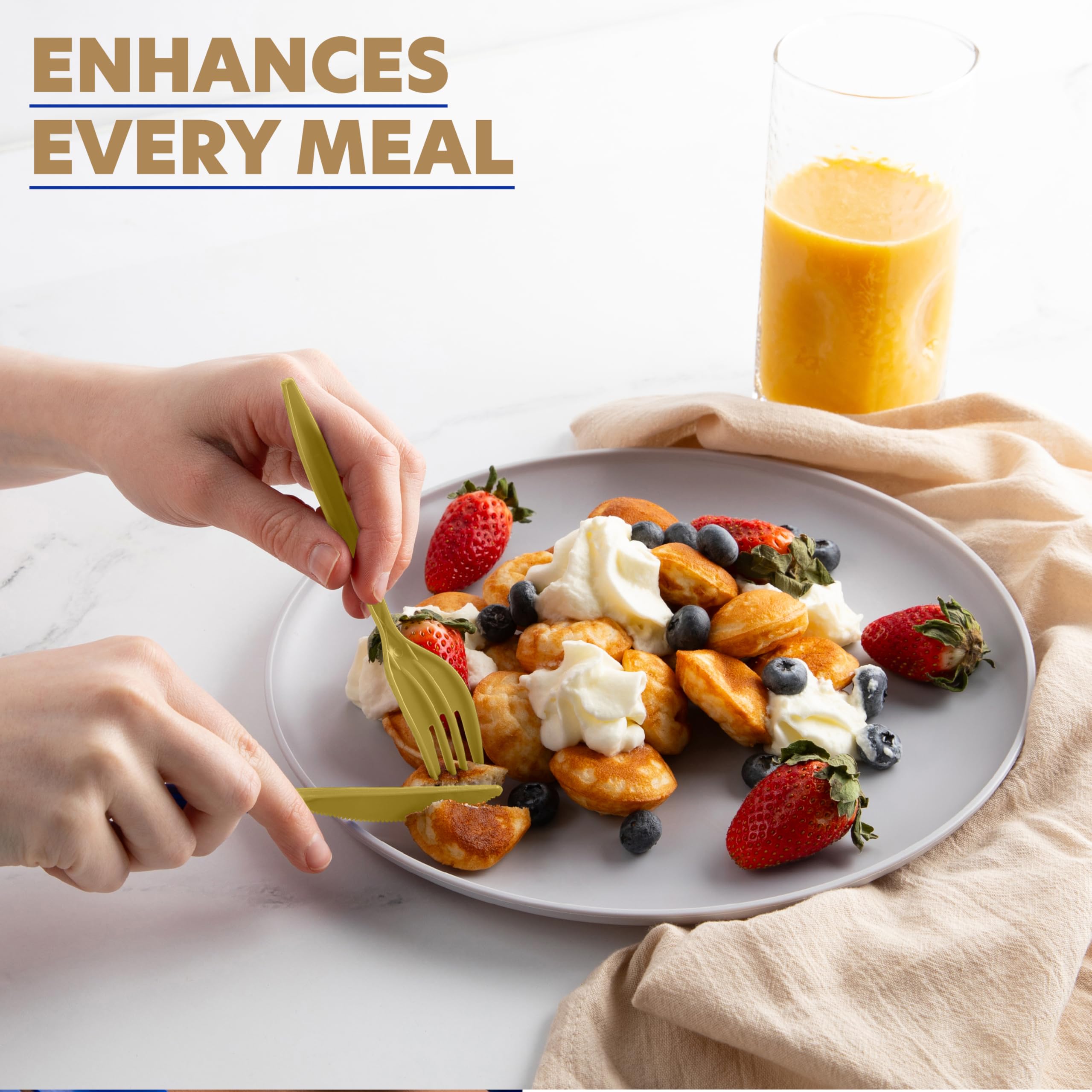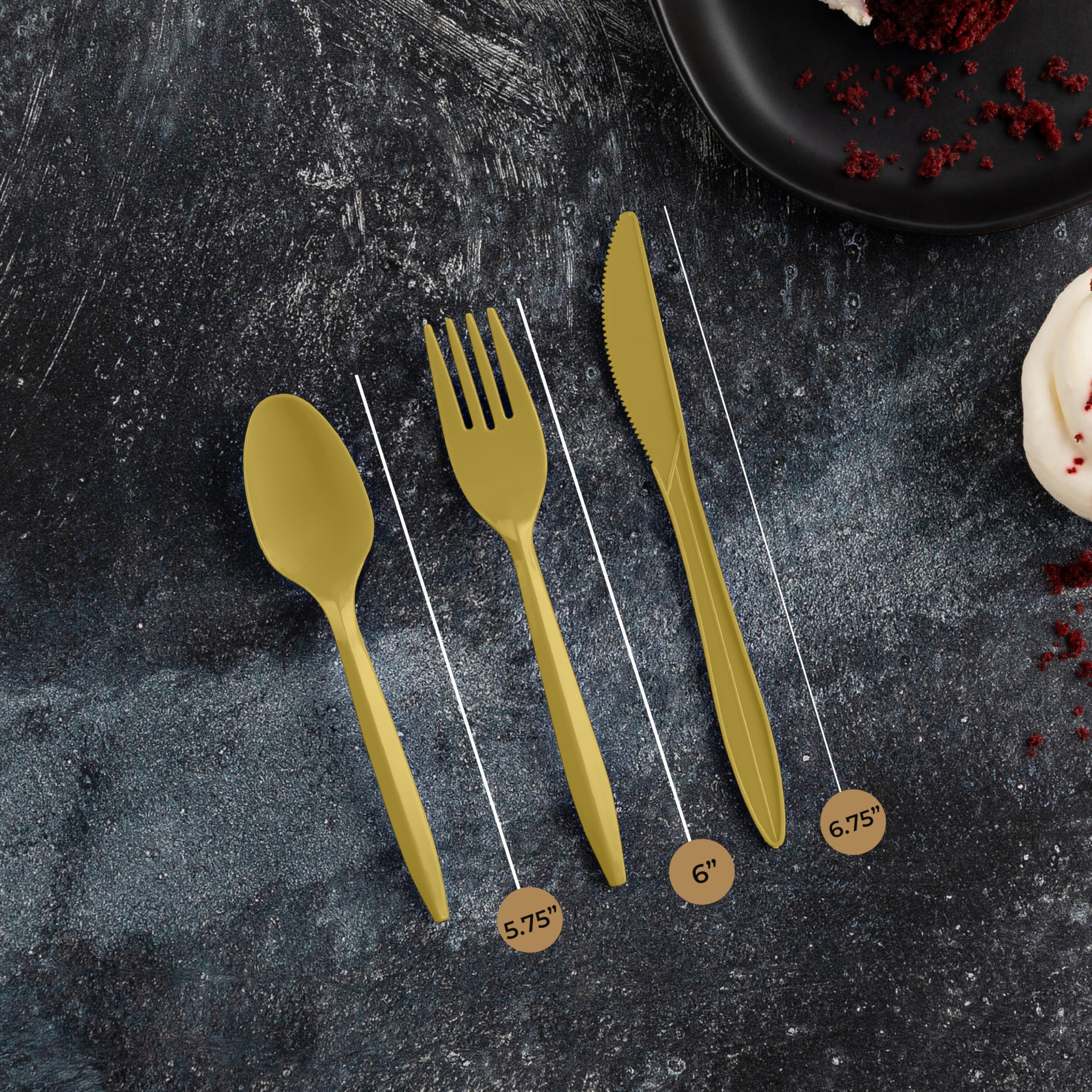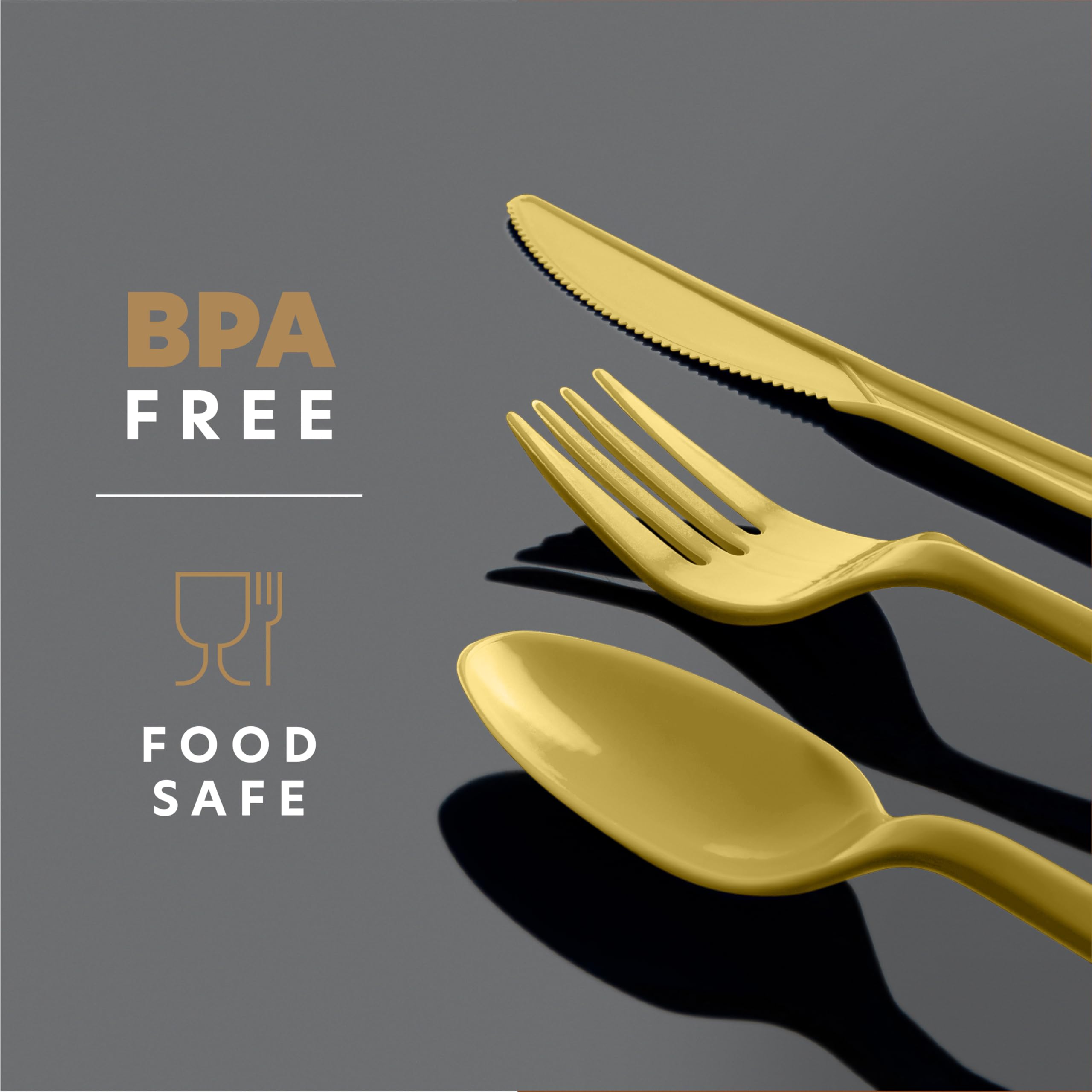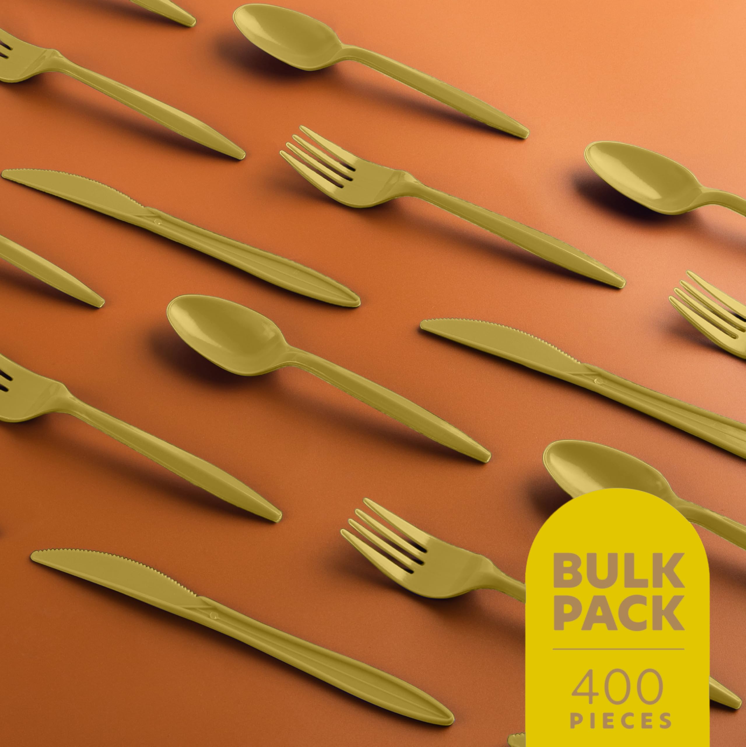Bulk Pack disposable cutlery includes 400 pieces: 160 gold plastic tea spoons, 160 gold plastic forks, and 80 gold plastic knives.