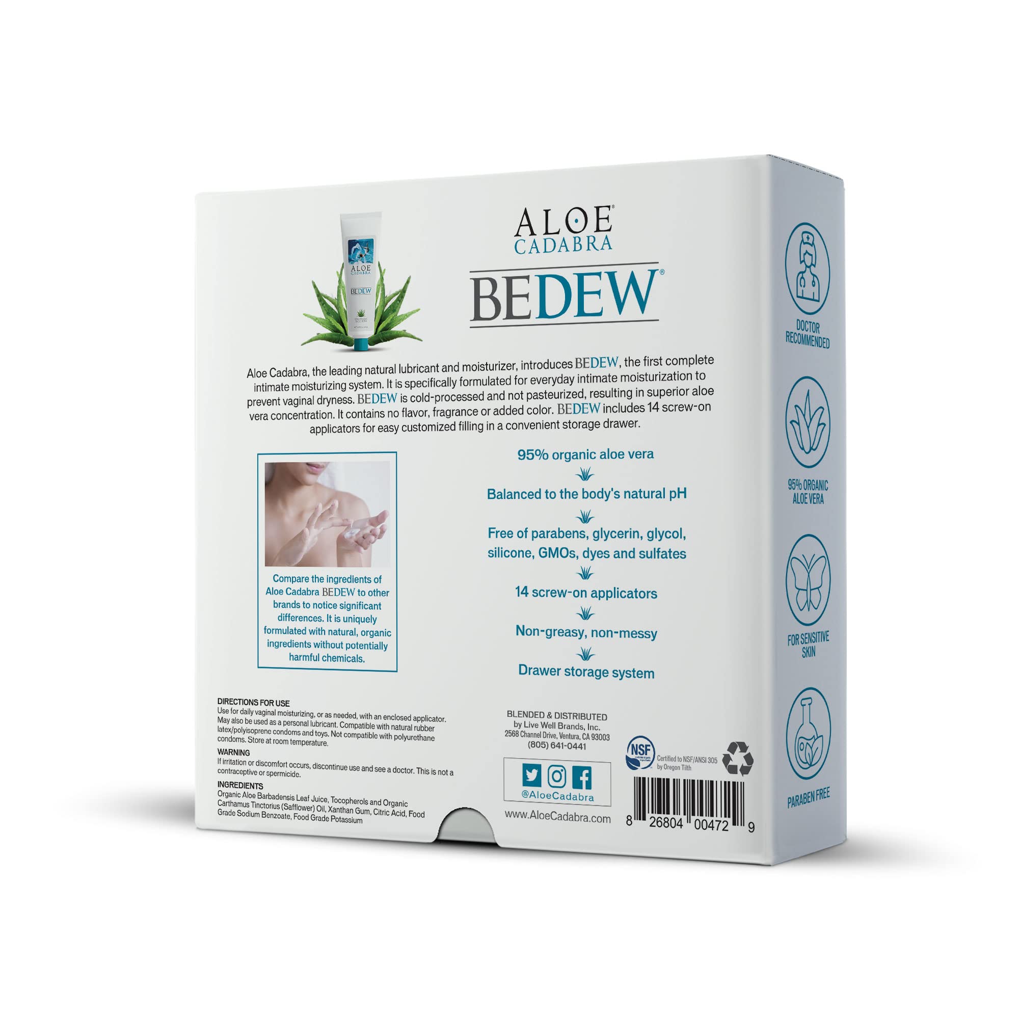 Cold-Processed product resulting in higher efficacy. Premium Organic Feminine Moisturizer: Aloe Cadabra 2.9 ounce tube of Bedew Intimate Vaginal Moisturizer System with 14 screw-on applicators in convenient storage drawer.