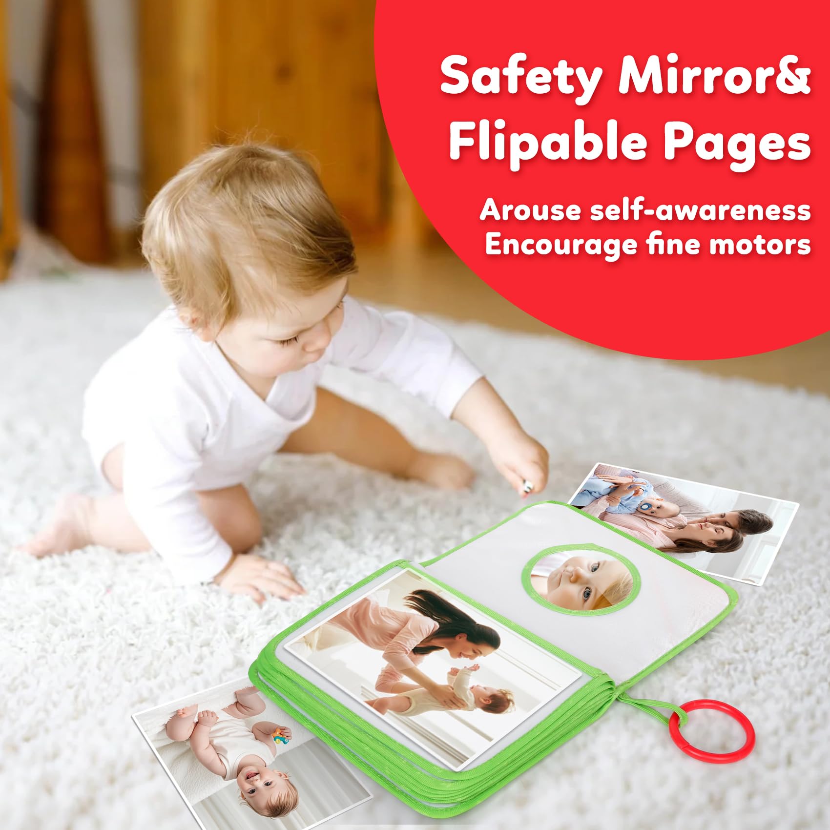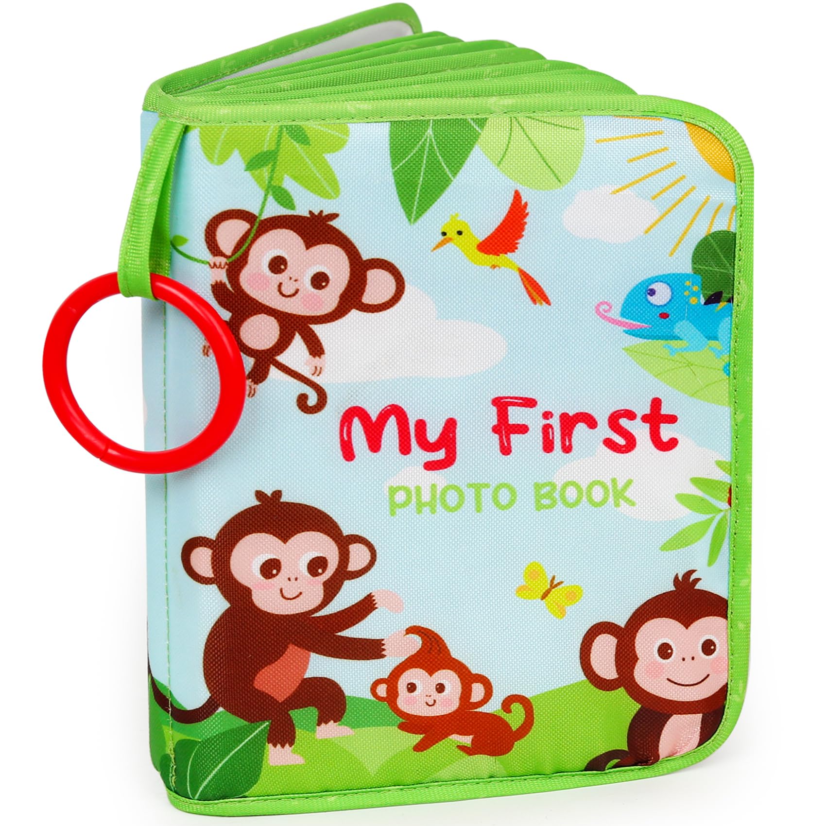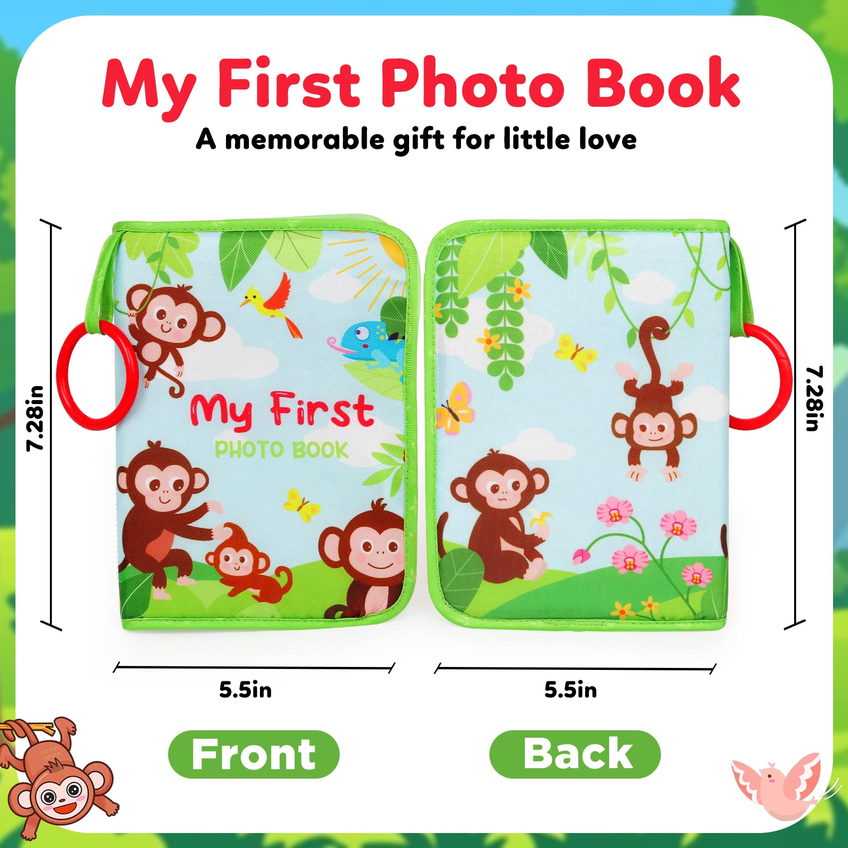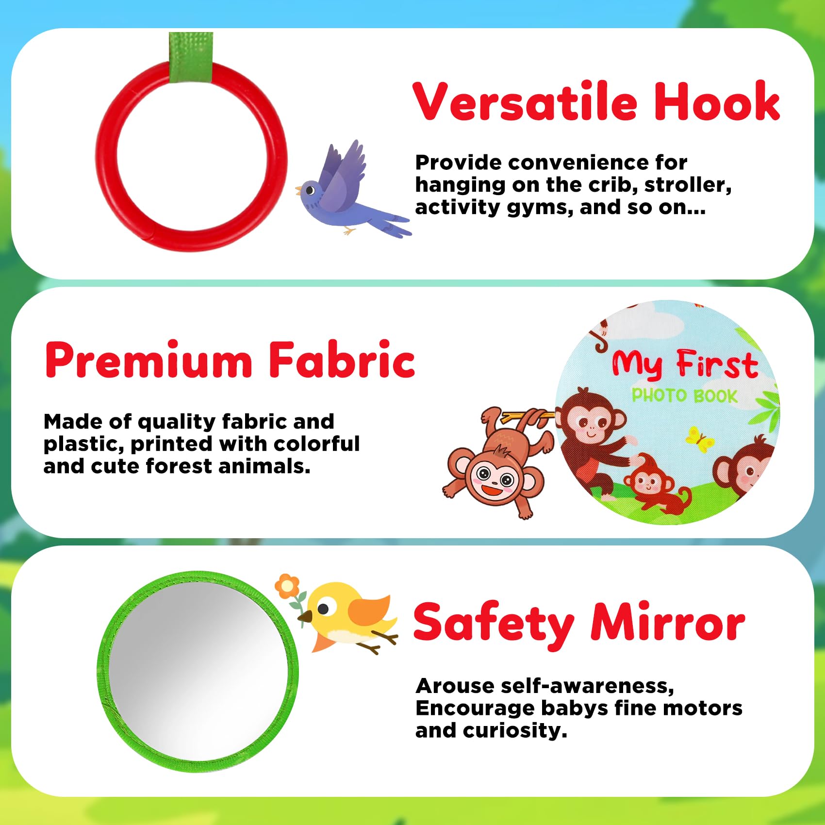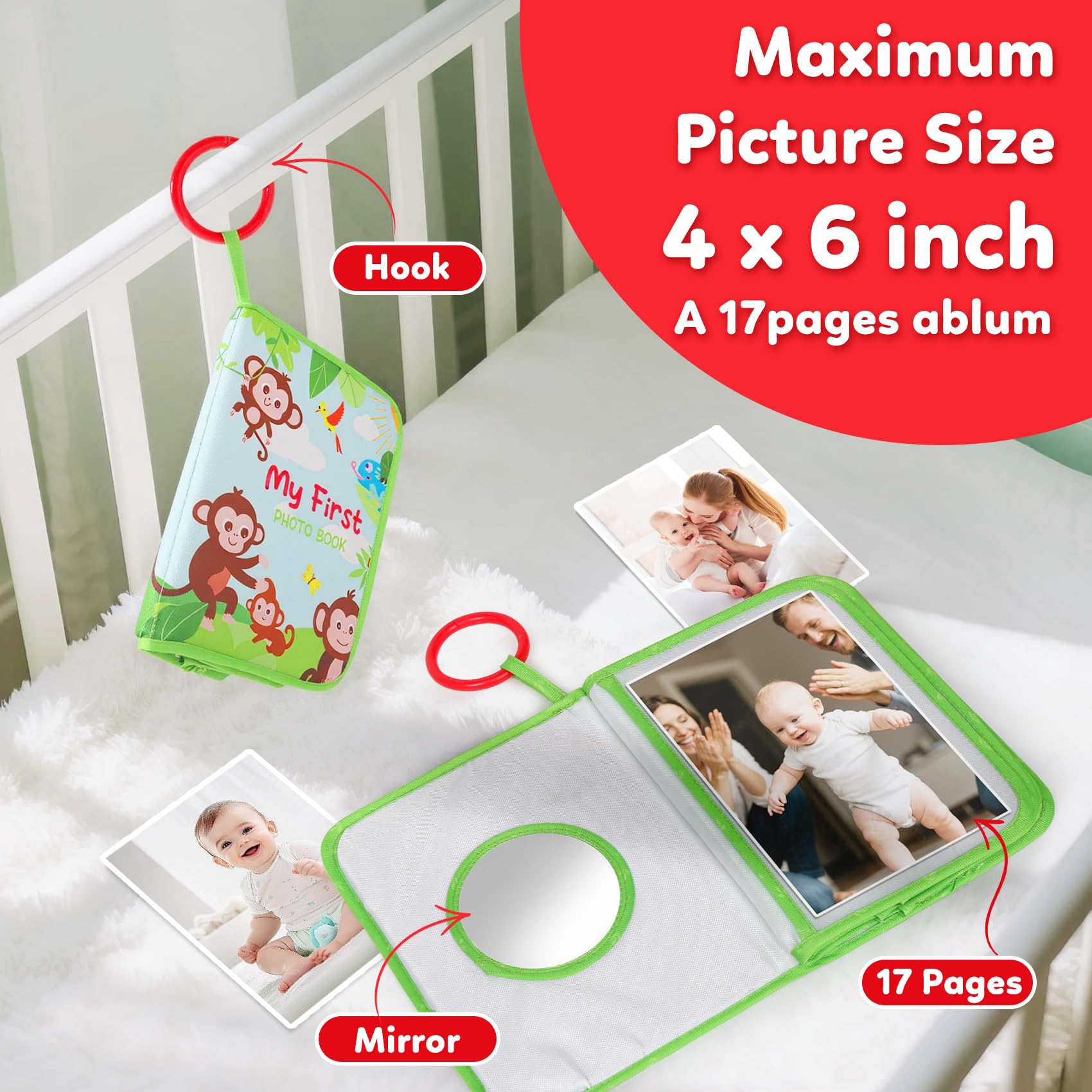 A 17pages Album: Can hold 17 pictures with max size of 4 X 6 inch. Hangable for strollers and excercise gym and so on. Good for indoor play as well as travel and outgoing