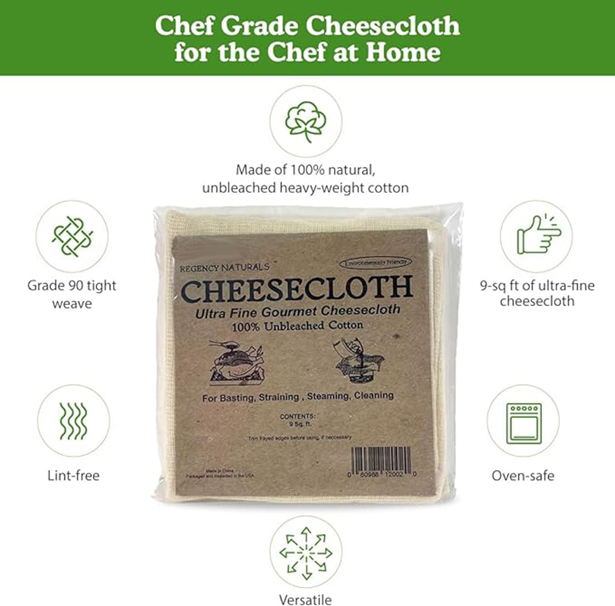 Regency Wraps 100% Cotton Ultra fine Cheesecloth is great for hundreds of uses in the kitchen and around the home. It’s the perfect addition to your cooking arsenal. This natural, cheese cloth is made of 100% unbleached cotton and is lab-tested food safe with no metals, bleach, or dyes. With a tight weave of grade 90, it's ideal for straining soups and sauces, basting turkey and poultry, steaming vegetables, and making cheese, yogurt, nut milk, and kombucha. It's also great for canning, poaching, and steaming, as well as for cleaning, crafting, and decorating. This cheesecloth is oven-safe, but be sure to keep it away from open flames. It's also lint-free, making it perfect for cleaning windows, mirrors, and more. this versatile cooking cheesecloth is a must-have for any cooking enthusiast. Get yours today and take the stress out of straining, cooking and cleaning!