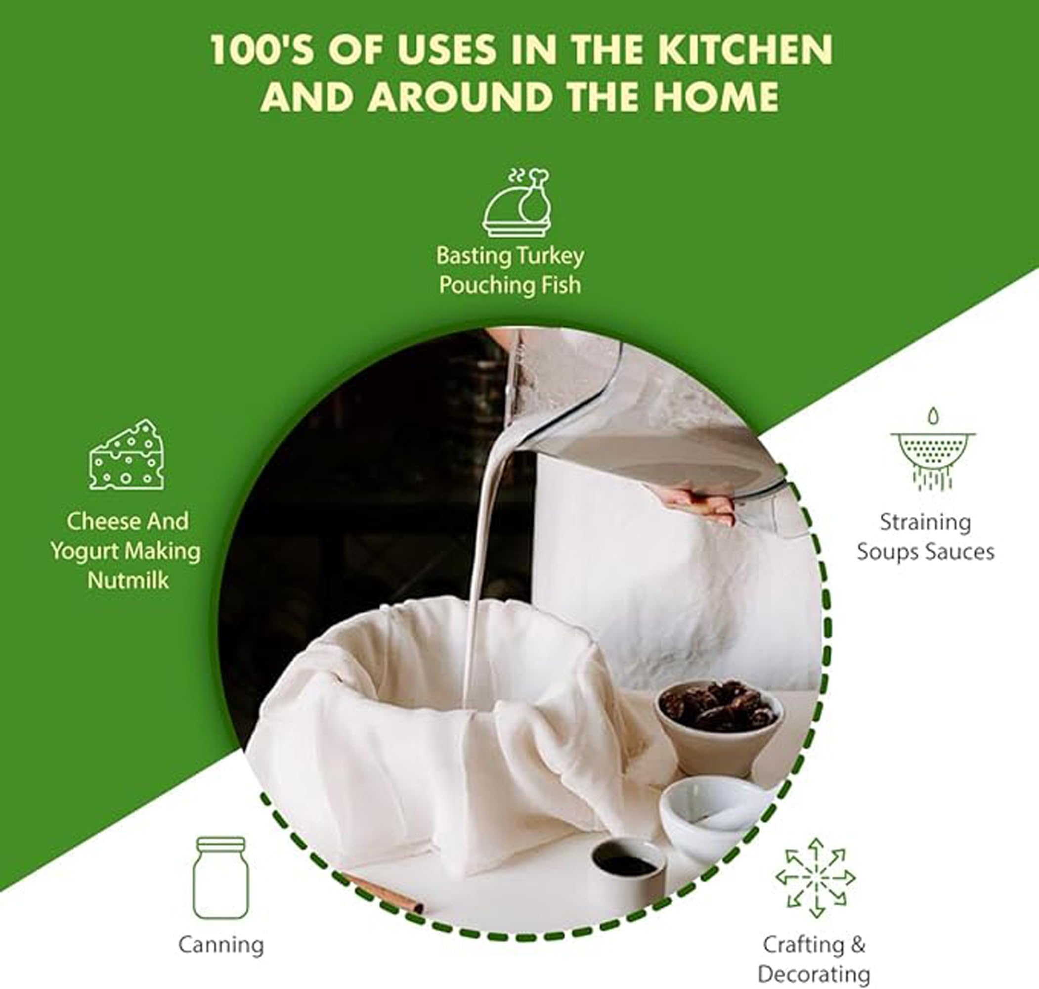 VERSATILE CHEESECLOTH: This cheese cloths is not only great for cooking but also for canning fruits, jams or veggies, decanting wine, poaching fish, steaming food & wrapping citrus , even protecting plants and finishing furniture