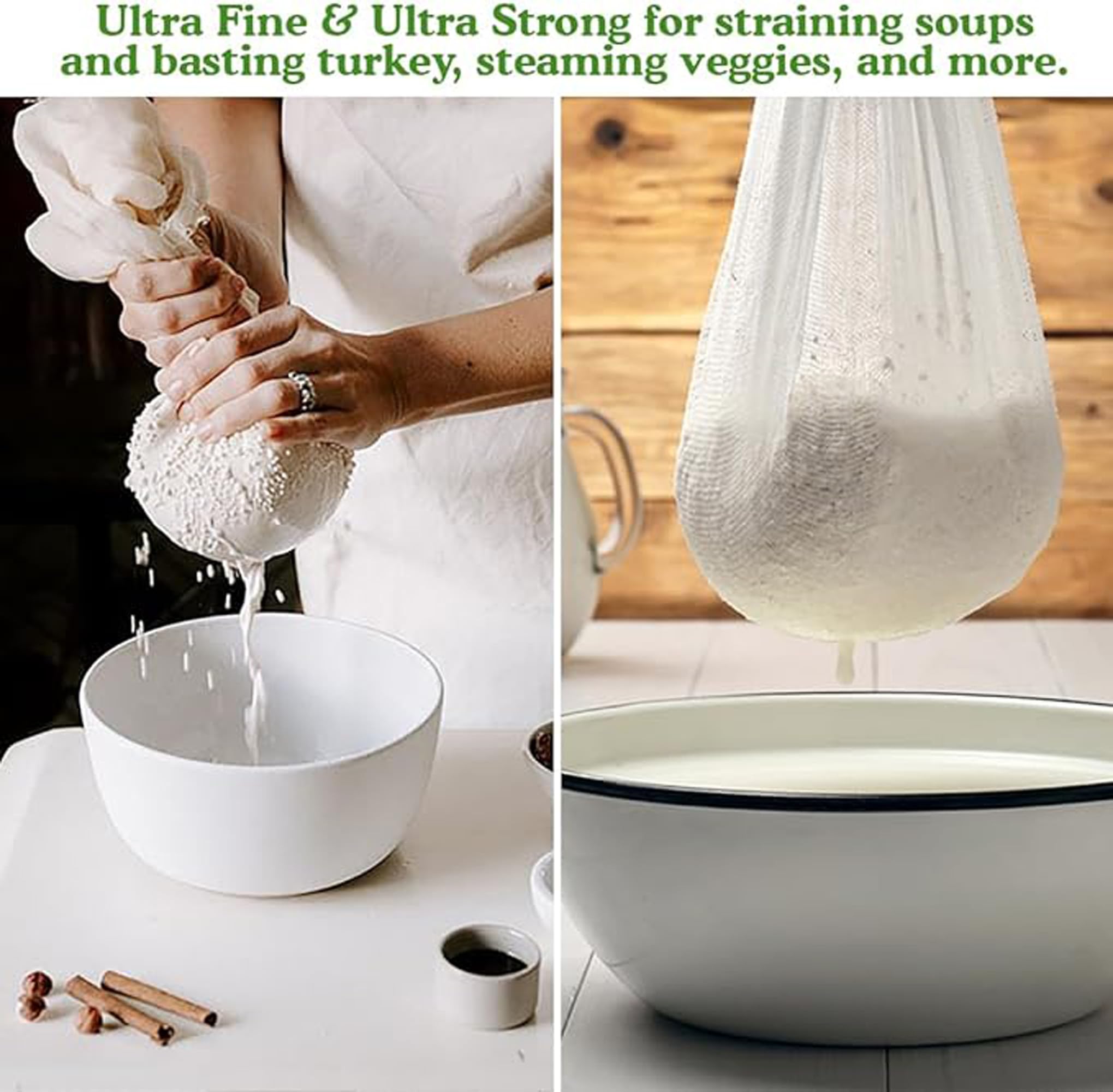 NATURAL ULTRA-FINE CHEESECLOTH: Made of 100% unbleached heavy-weight cotton, this chef-grade cheese cloths is lab-tested food safe with no metals, bleach, or dyes. Pack of 3 with 9 sq ft for all your food prep needs