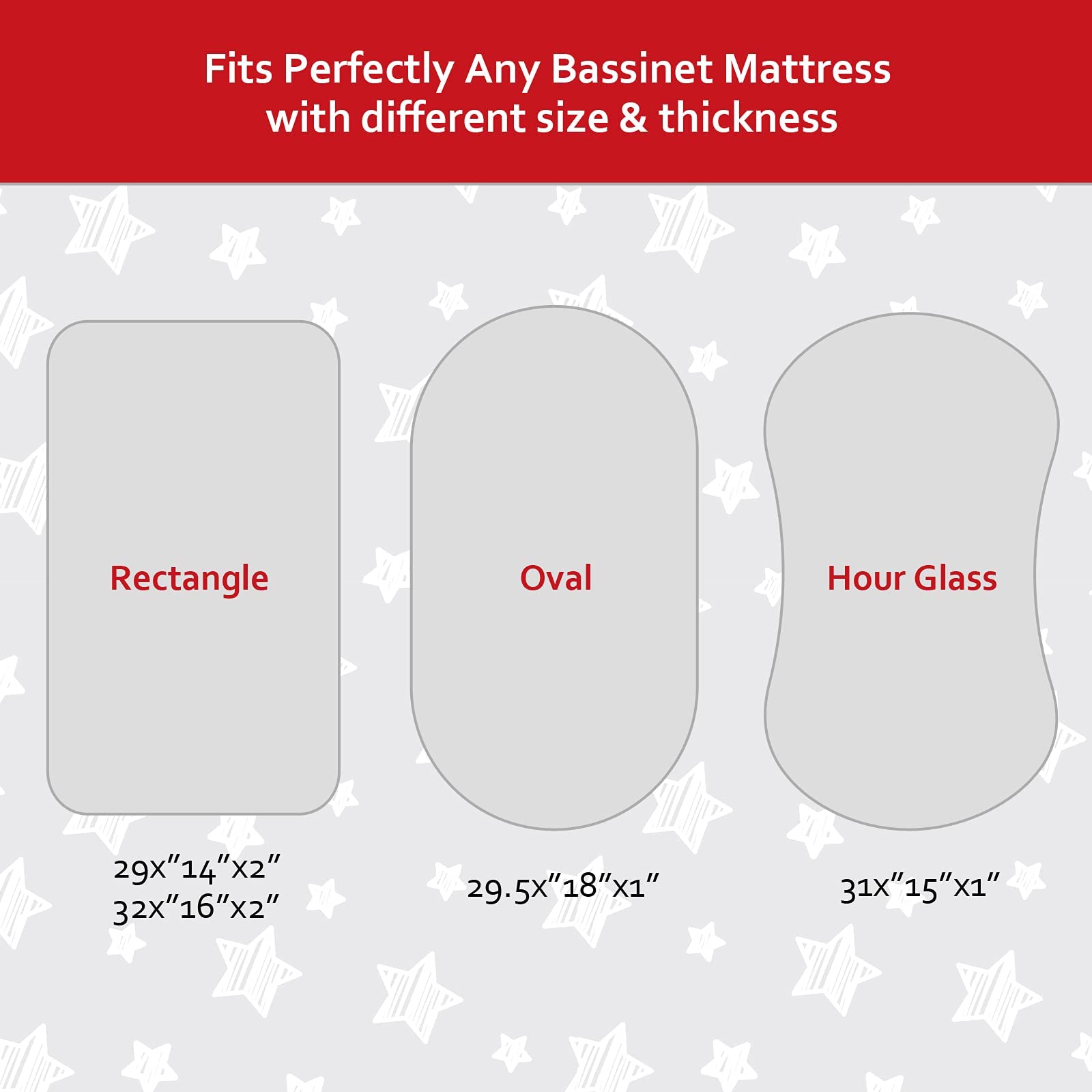 FLEXIBLE FIT: 33" X 17" Our bassinet sheets fit almost all standard oval, round, rectangle, hourglass shaped bassinet mattress. Each sheet comes with an elastic band encased at the bottom for safety.