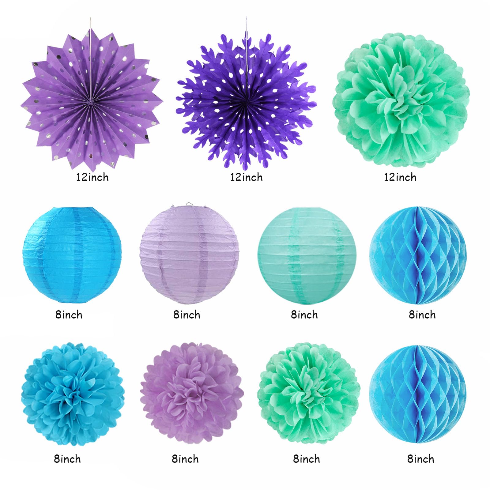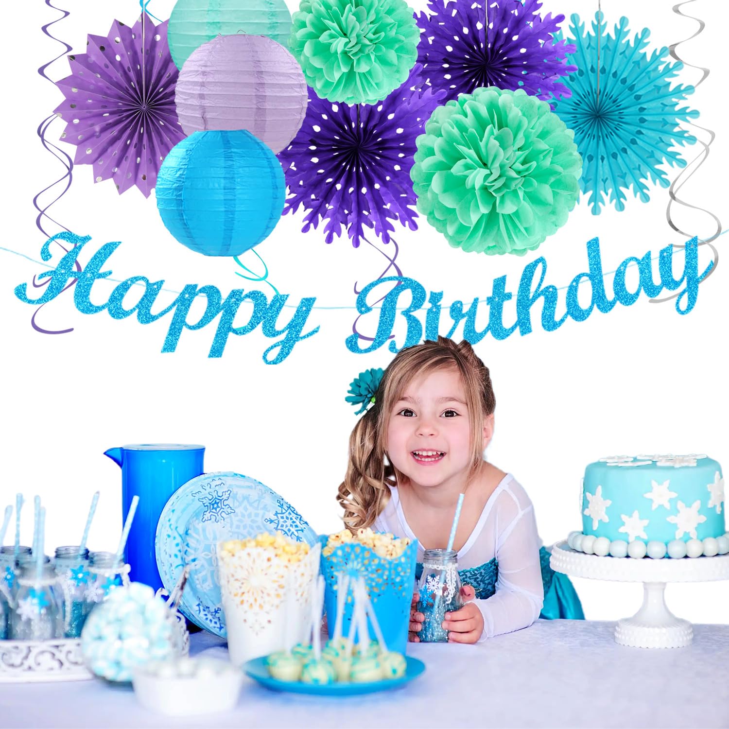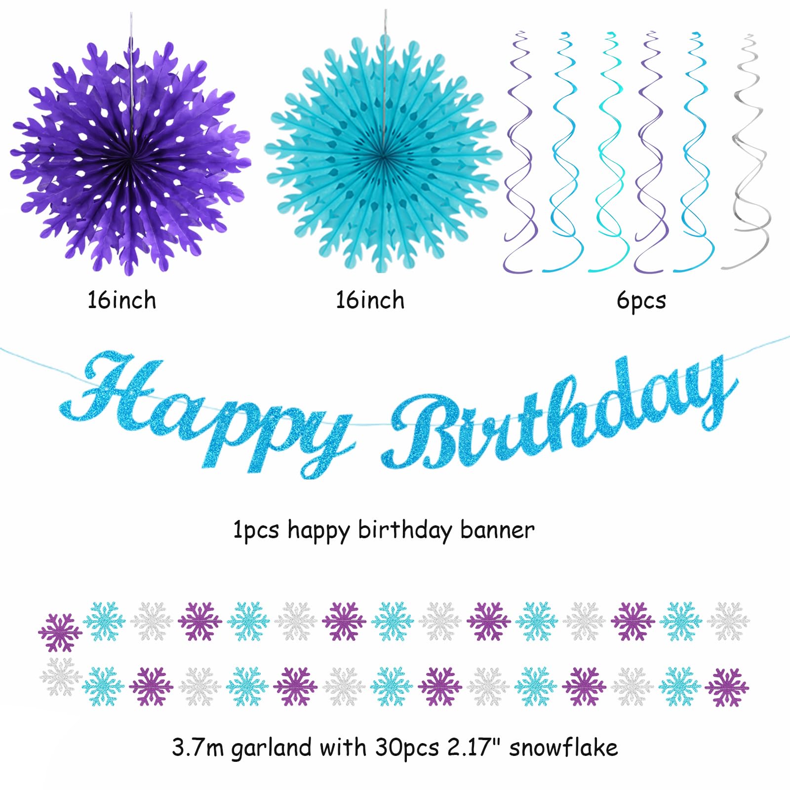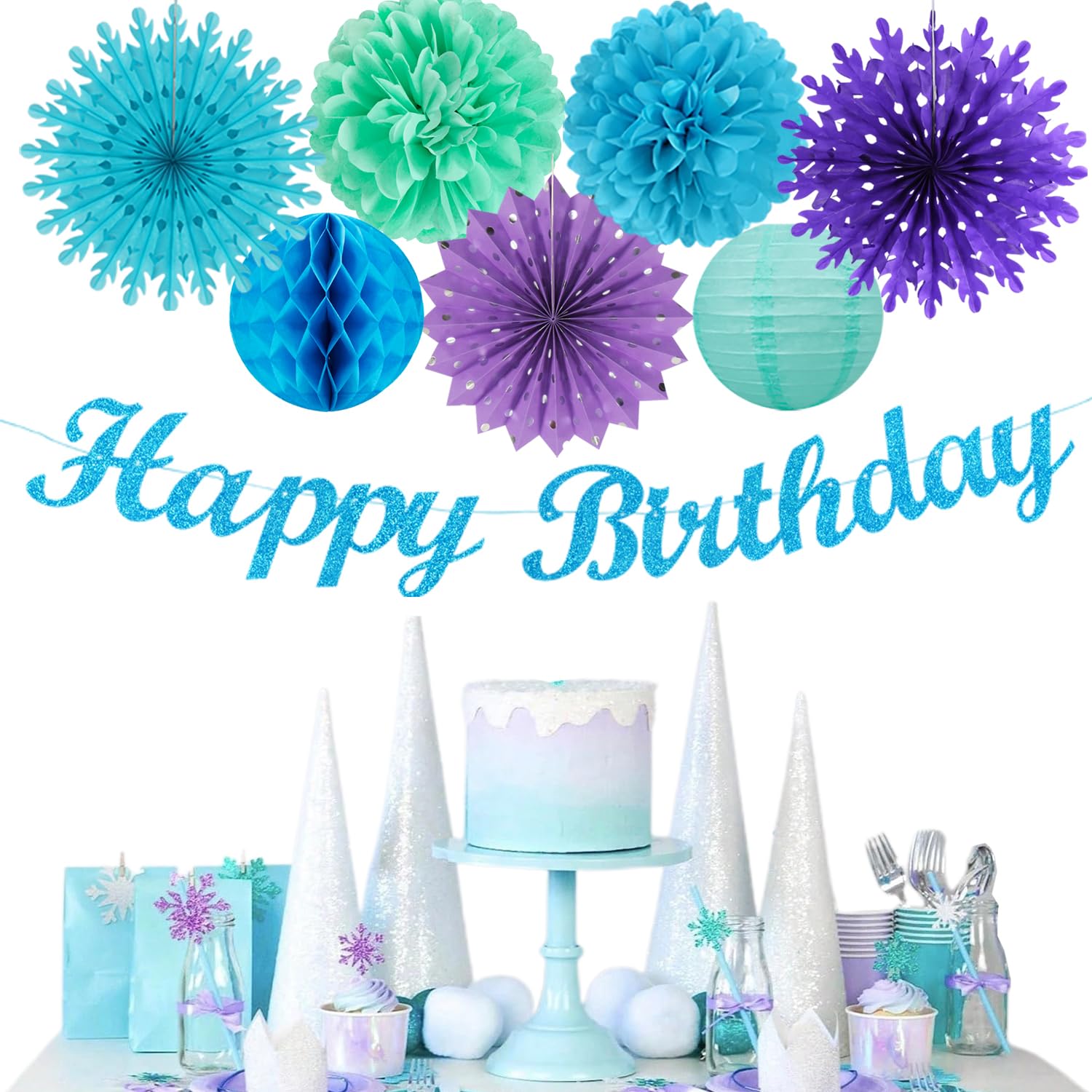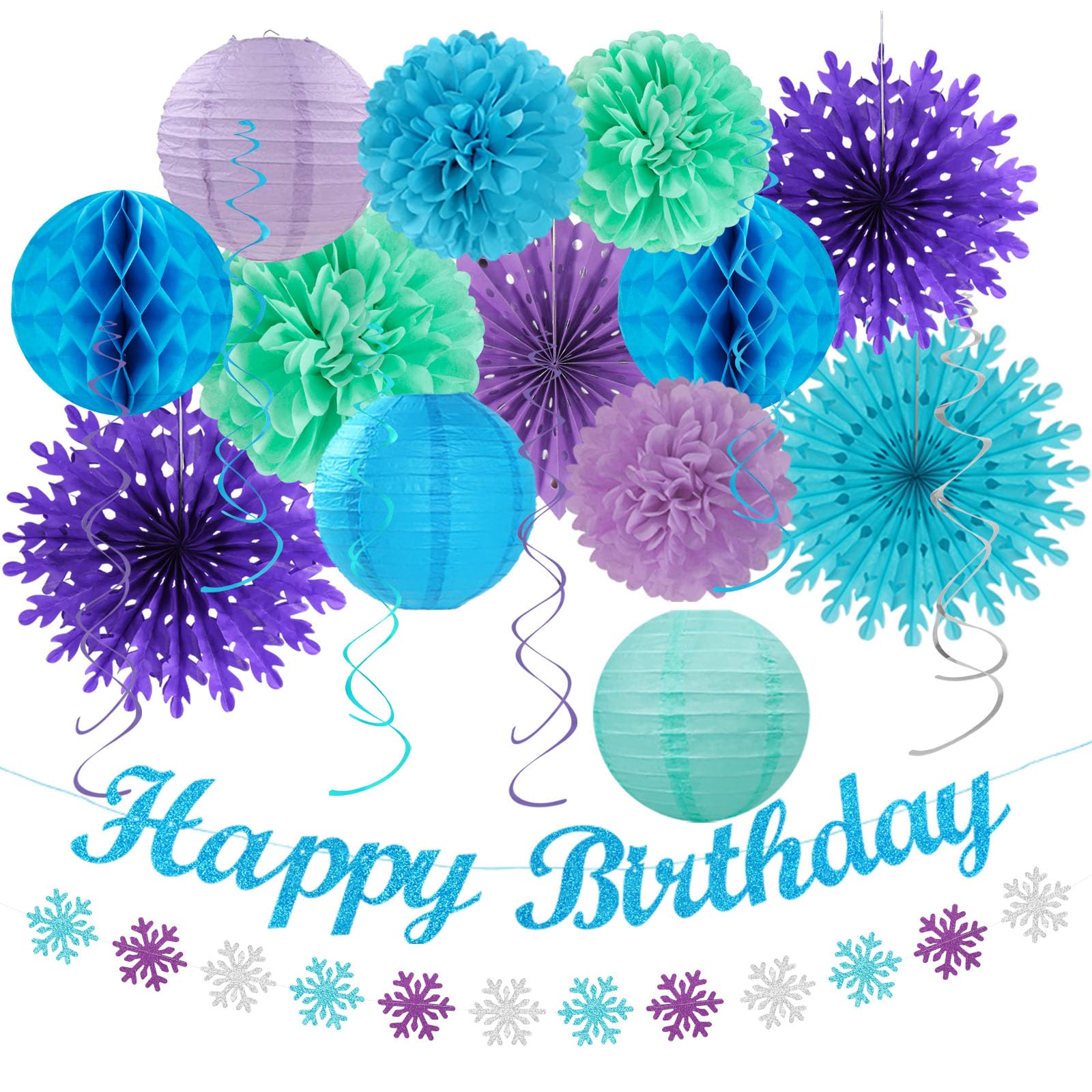 【Bue Purple Teal Party Favors】This kits include 1pcs happy birthday banner, 1pcs snowflake paper banner, 4pcs tissue pom poms: 3pcs 10" and 1pcs 12" , 3pcs 8inch paper honeycom ball, 2pcs 8inch paper lantern, 4pcs 12inch paper flower fan, 6pcs Paper swirls hanging streamers.