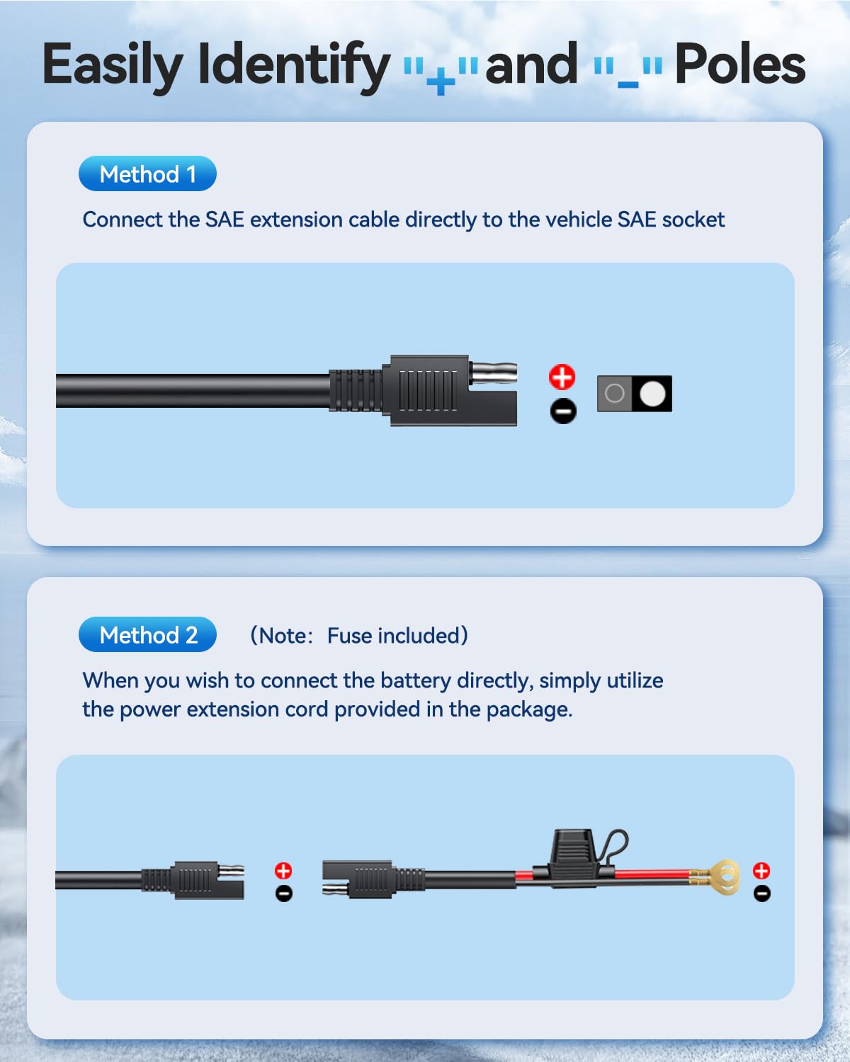 LED Voltmeter & ON/OFF Switch – The motorcycle charger has an independent on/off button and displays the battery's voltage in real-time while you ride, monitoring its health and the electrical system automatically, ensuring driving safety. (TIPS: Please replace the battery as soon as possible if the voltage is lower than 12V)