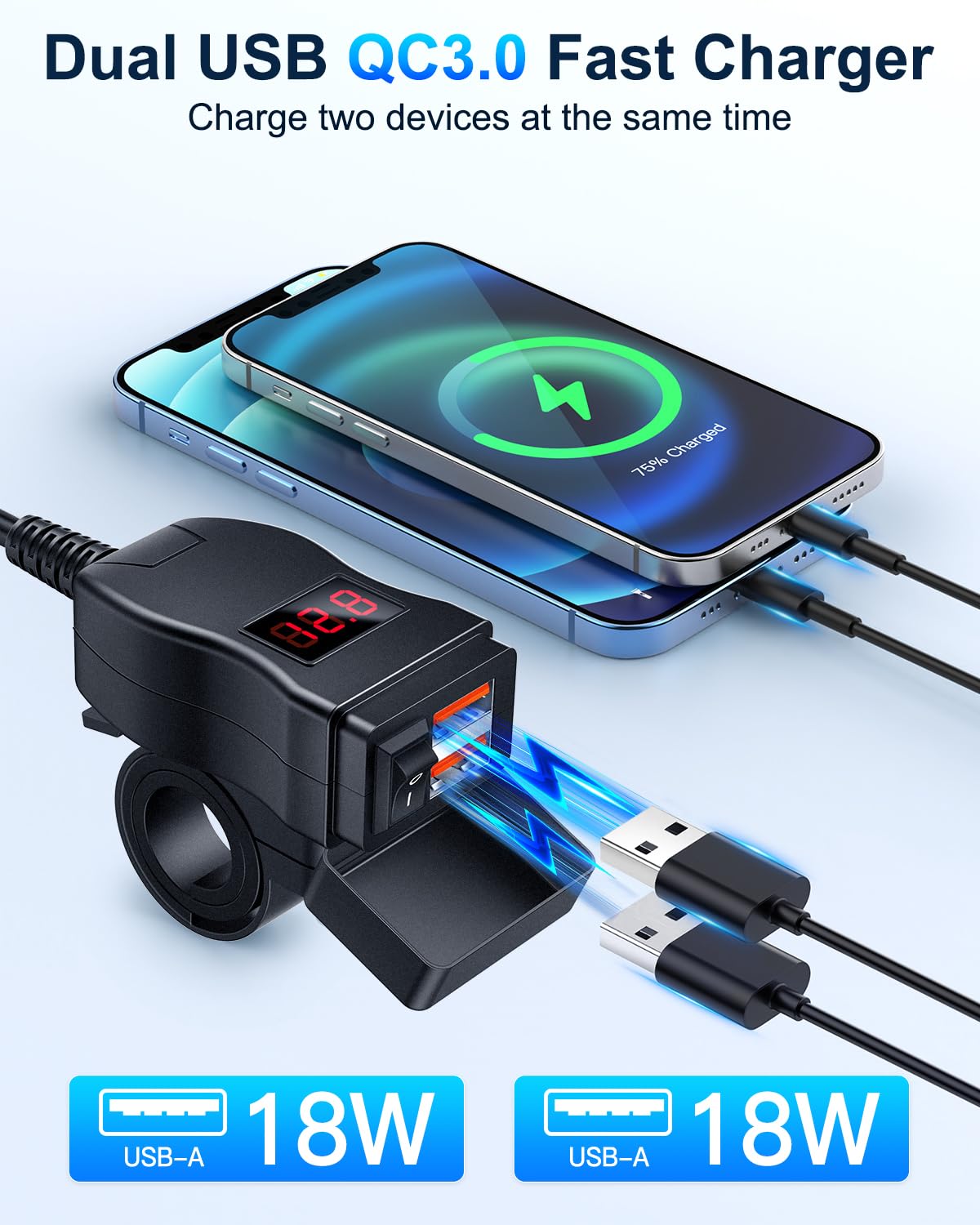 Dual Fast Charging USB Ports – Our motorcycle USB fast charger is equipped with 18W USB-A (QC3.0) dual ports, so you can charge two devices at the same time. Empowers you to say goodbye to charging anxiety on your journey.