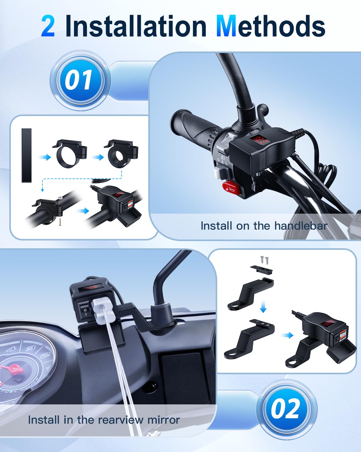 Safety & Smart Charging – This USB charger for motorcycles is constructed of flame-retardant ABS and high-quality copper for optimal conductivity. Adjusts output voltage automatically according to the charging device (USB: 5V-3.4A; 9V-2A; 12V-1.5A).