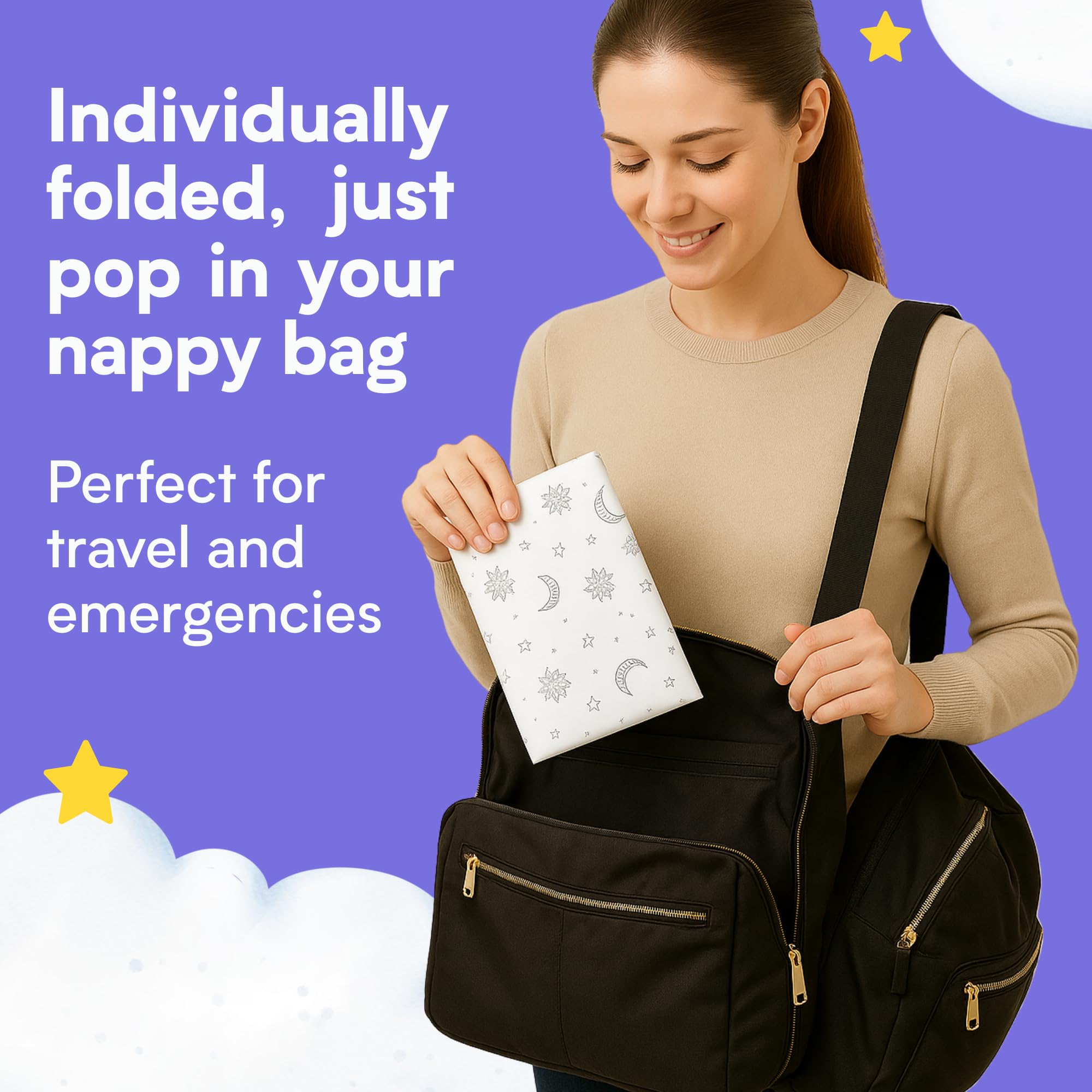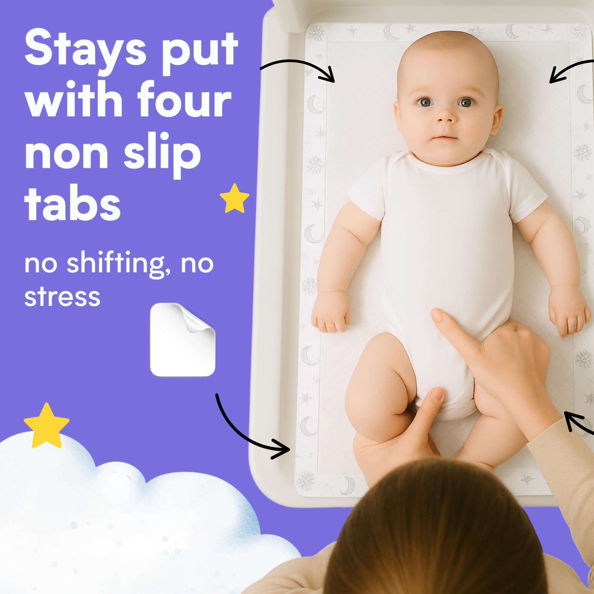 SECURE & SLIP-RESISTANT: 4 built-in sticky tabs on the back help keep each pad firmly in place. No slipping, sliding, or bunching, even during wiggly changes. At home, on the go, or at a public changing station, you can count on a stable surface every time.