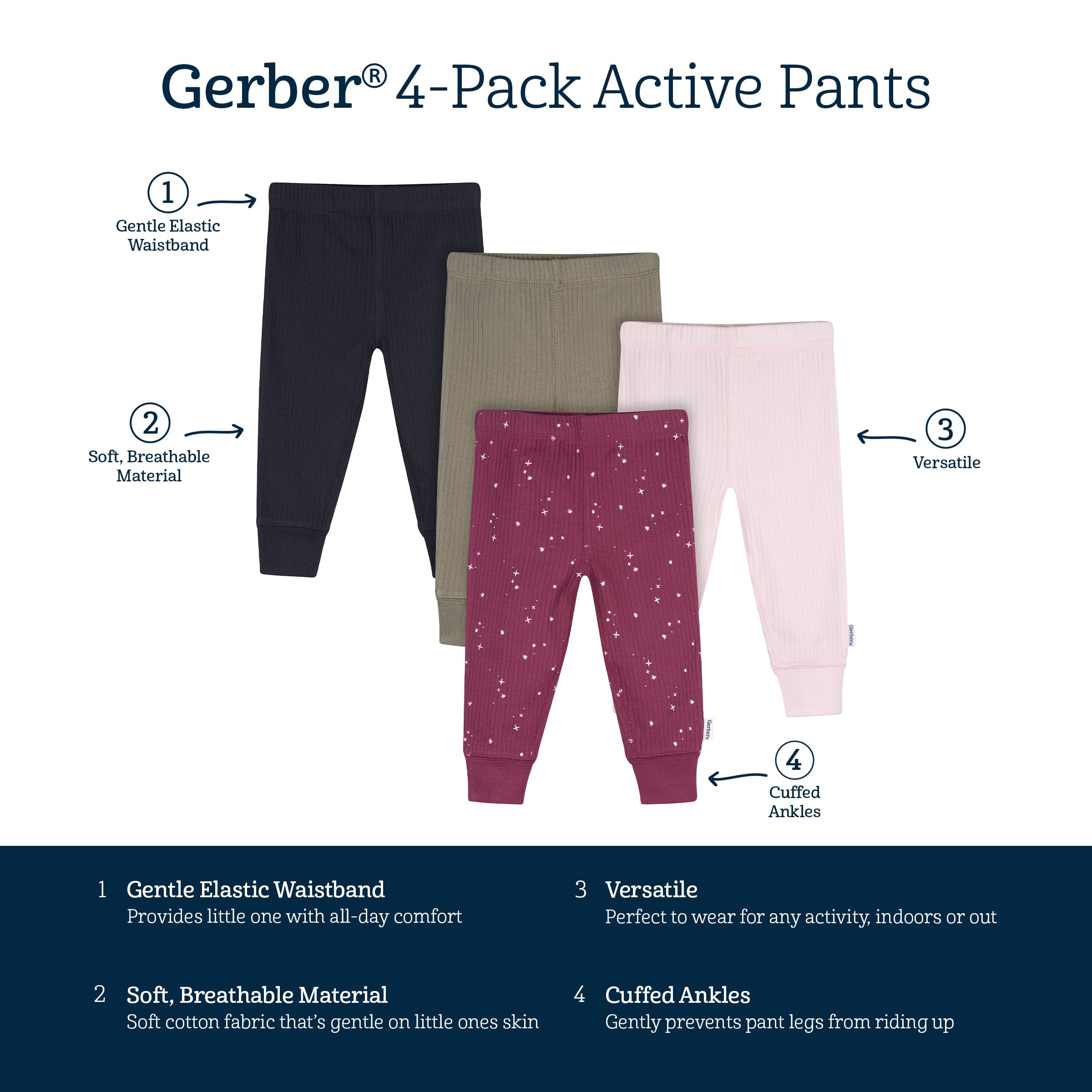 Description This 4-pack of baby active pants is designed for all-day comfort and play! Made primarily from soft cotton with a hint of spandex, they offer a flexible fit that moves with your little one. The comfort-stretch waistband makes dressing quick and easy, while cinched ankles keep the pants securely in place, no matter how much they wiggle and explore. A touch of vertical ribbing adds subtle texture and style, making these pants as cute as they are practical. Perfect for pairing with bodysuits or t-shirts, they’re a must-have for everyday wear!