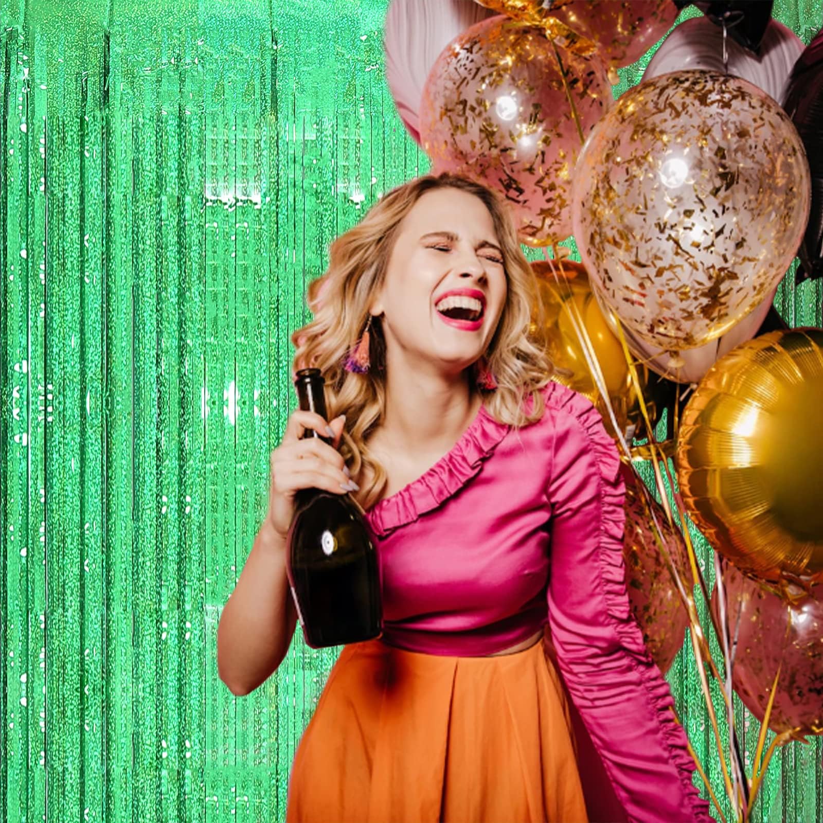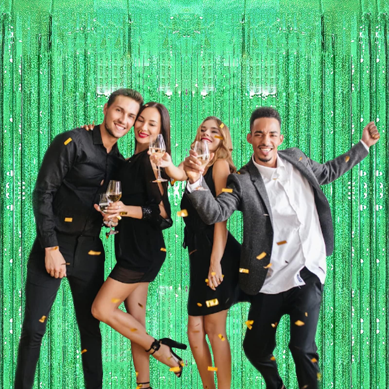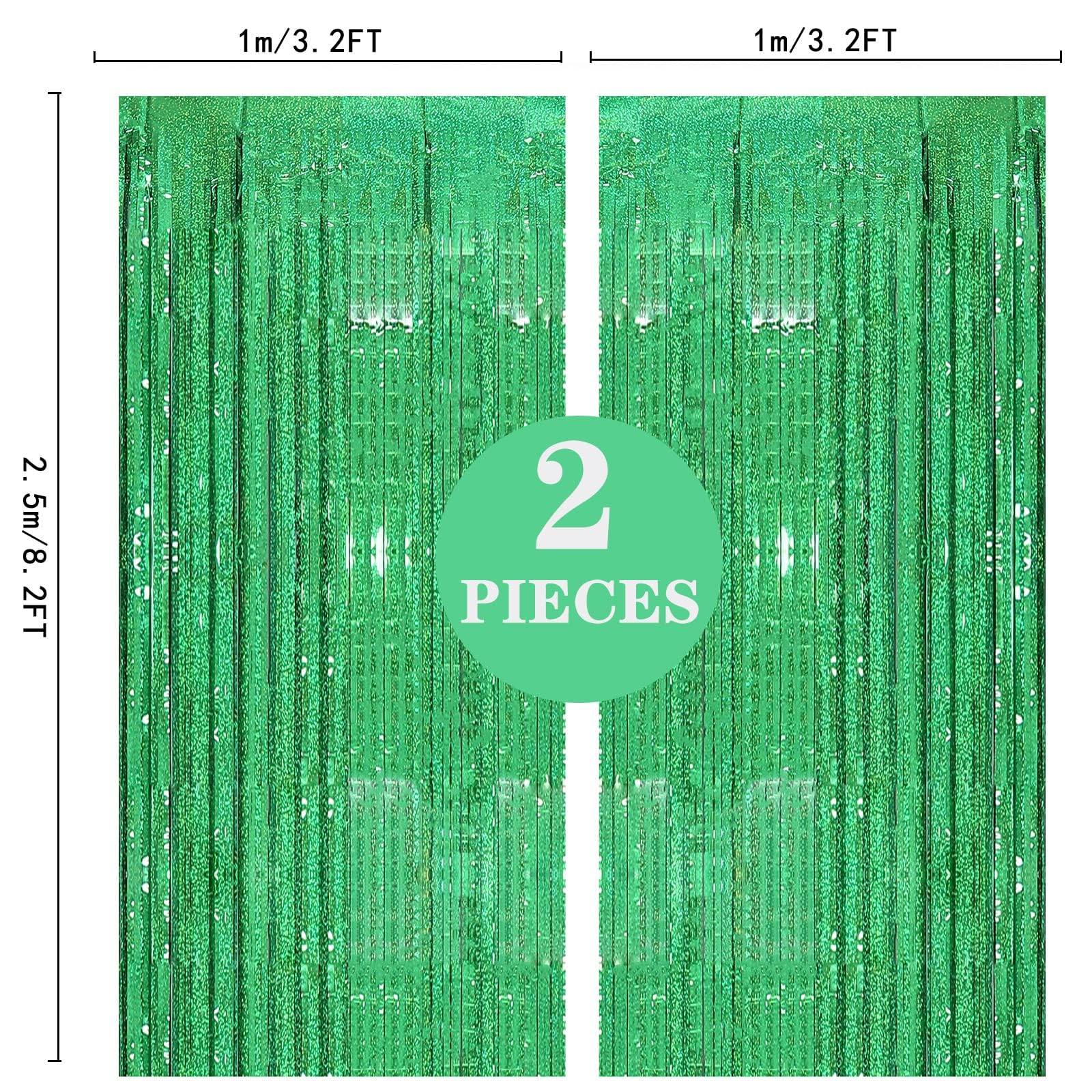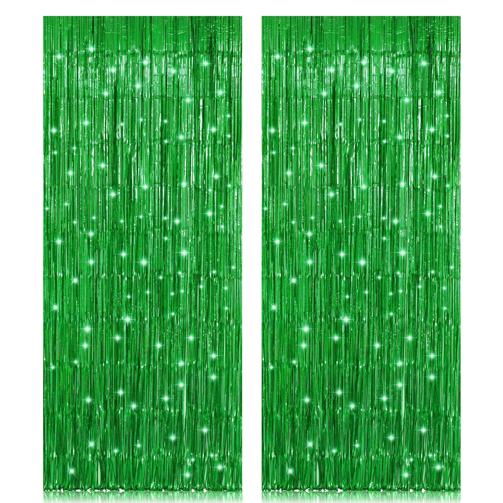 【Metallic Backdrop Curtain Kit】Package includes 2 packs green backdrop curtains, each foil fringe curtain size is 3.2 FT wide and 8.2 FT long, cuttable, you can make it short to decorate your table or wall.