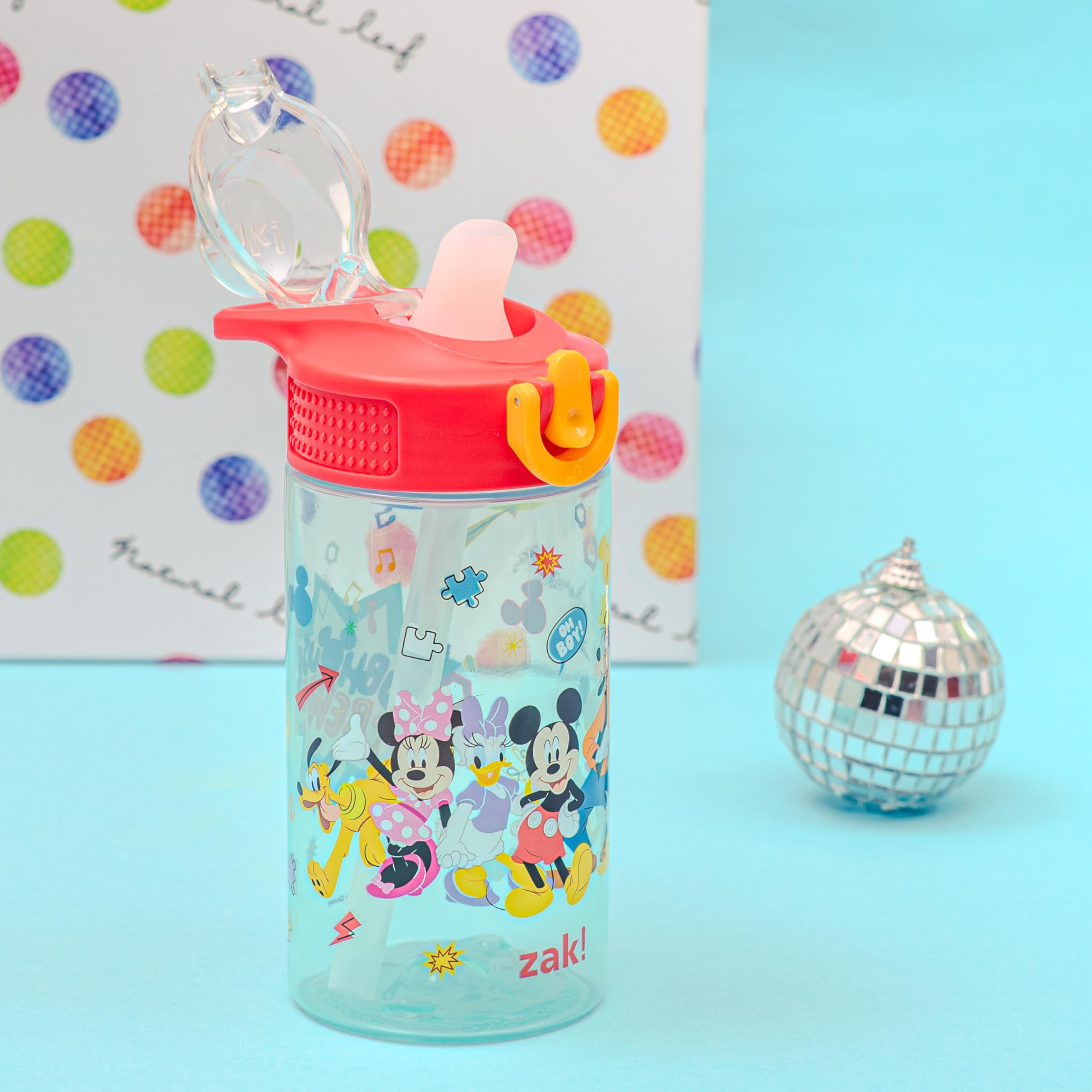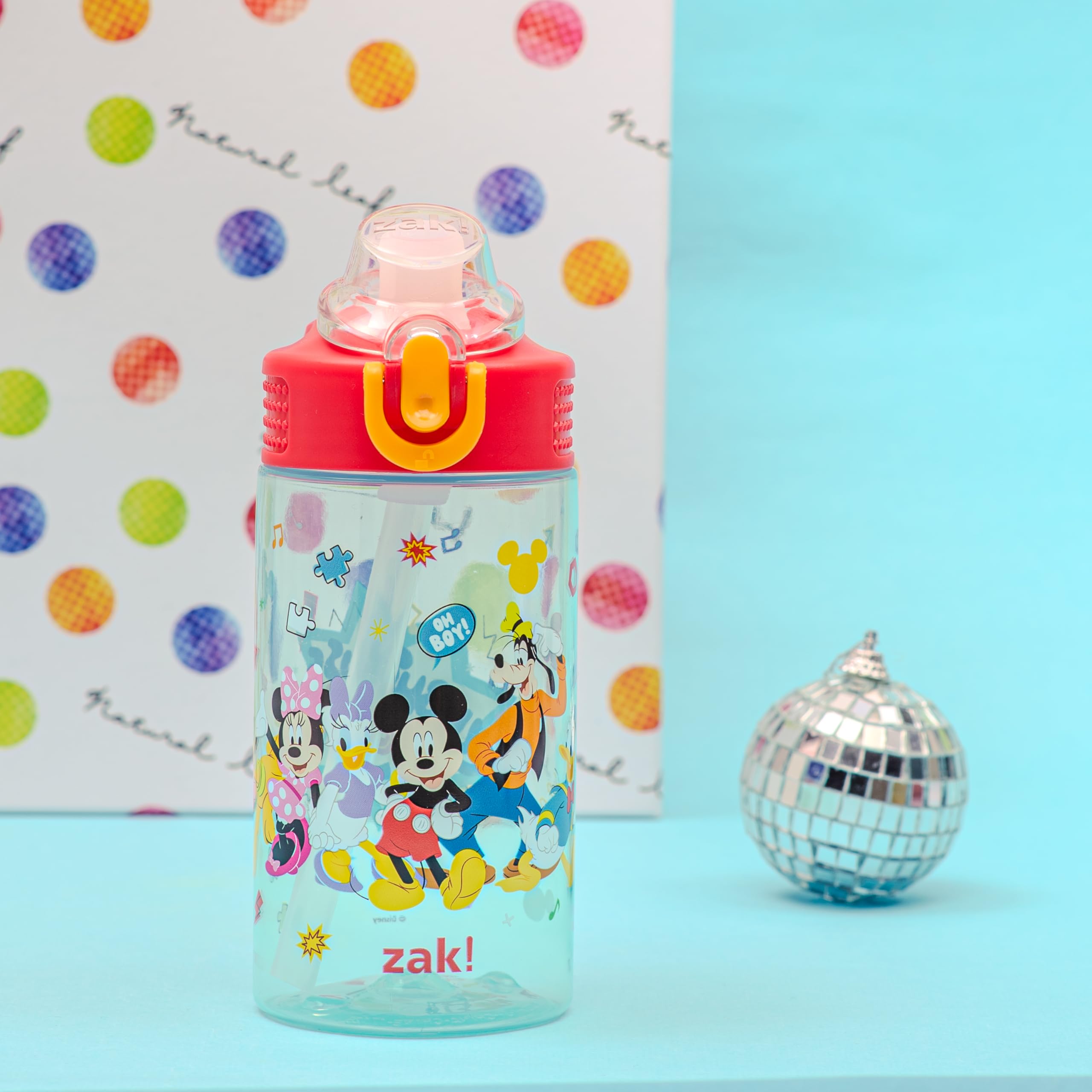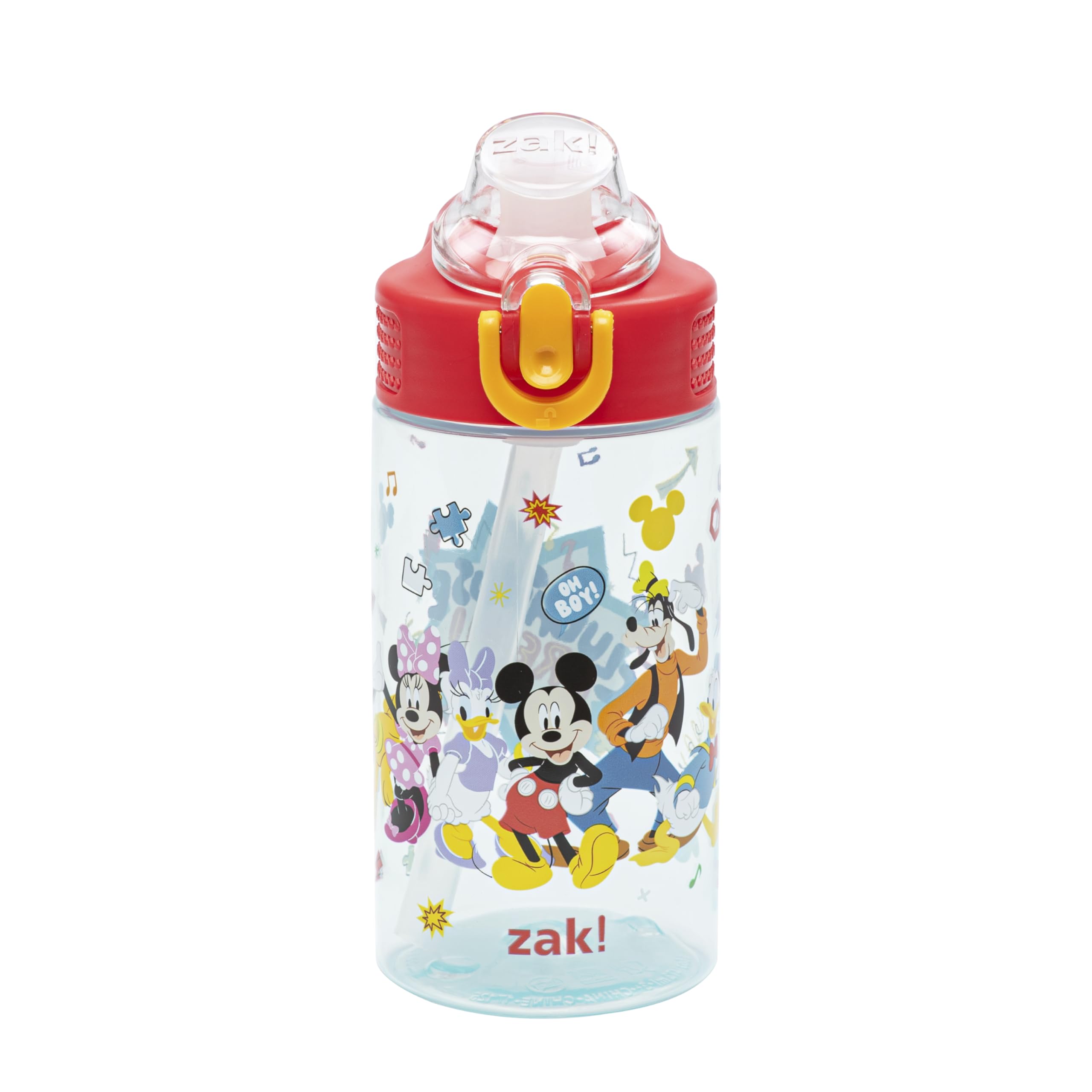 Let kids enjoy hydration with a fun Disney water bottle by zak! designs! Easy to Clean: The silicone spout and straw can be removed from the lid, and the pieces are dishwasher safe for simple cleanup at the end of the day. Reusable and Durable Material: Reusable water bottles will last wash after wash—good news for you and the environment! The 16 oz water bottle is made of PP plastic, durable enough for kids to use every day and bring on any adventure. Leak-Proof Lid: The lid screws on securely and won't leak when the spout is closed, though water flows for easy drinking when the spout is open. The easy-open button has a flip-up lock to keep it from activating accidentally. On the Go: The water bottle has a built-in carrying loop on the lid for easy transportation, and with the spout cover to keep the spout clean and closed, it can be tossed into a bag for worry-free travel. Specifications: 16 oz capacity. Made of durable plastic. Dishwasher safe, do not microwave. Length: 4.33-inch, Width: 2.78-inch, Height: 7-inch. Character: Disney's Mickey Mouse, Minnie Mouse, Donald Duck, Daisy Duck, Goofy, Pluto.