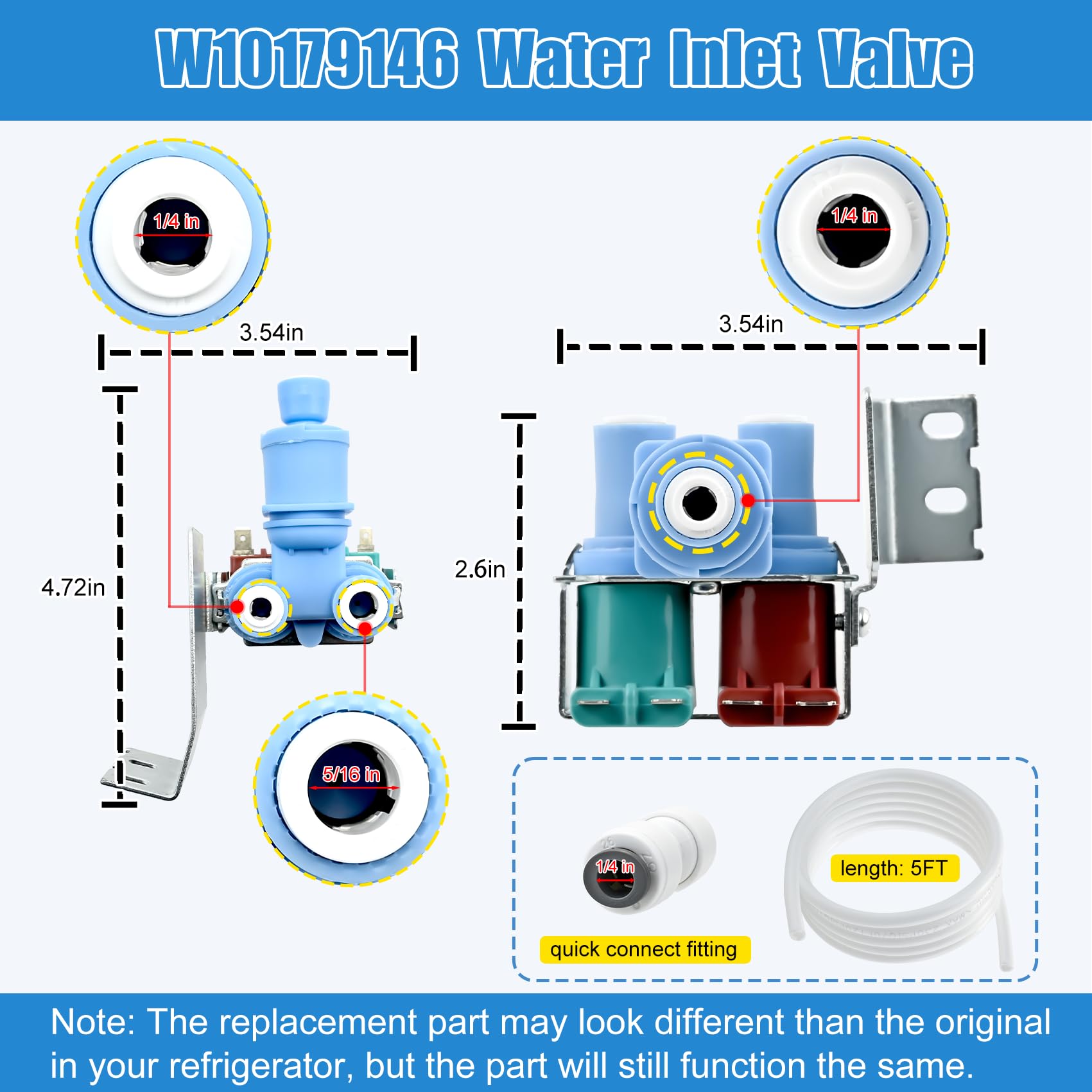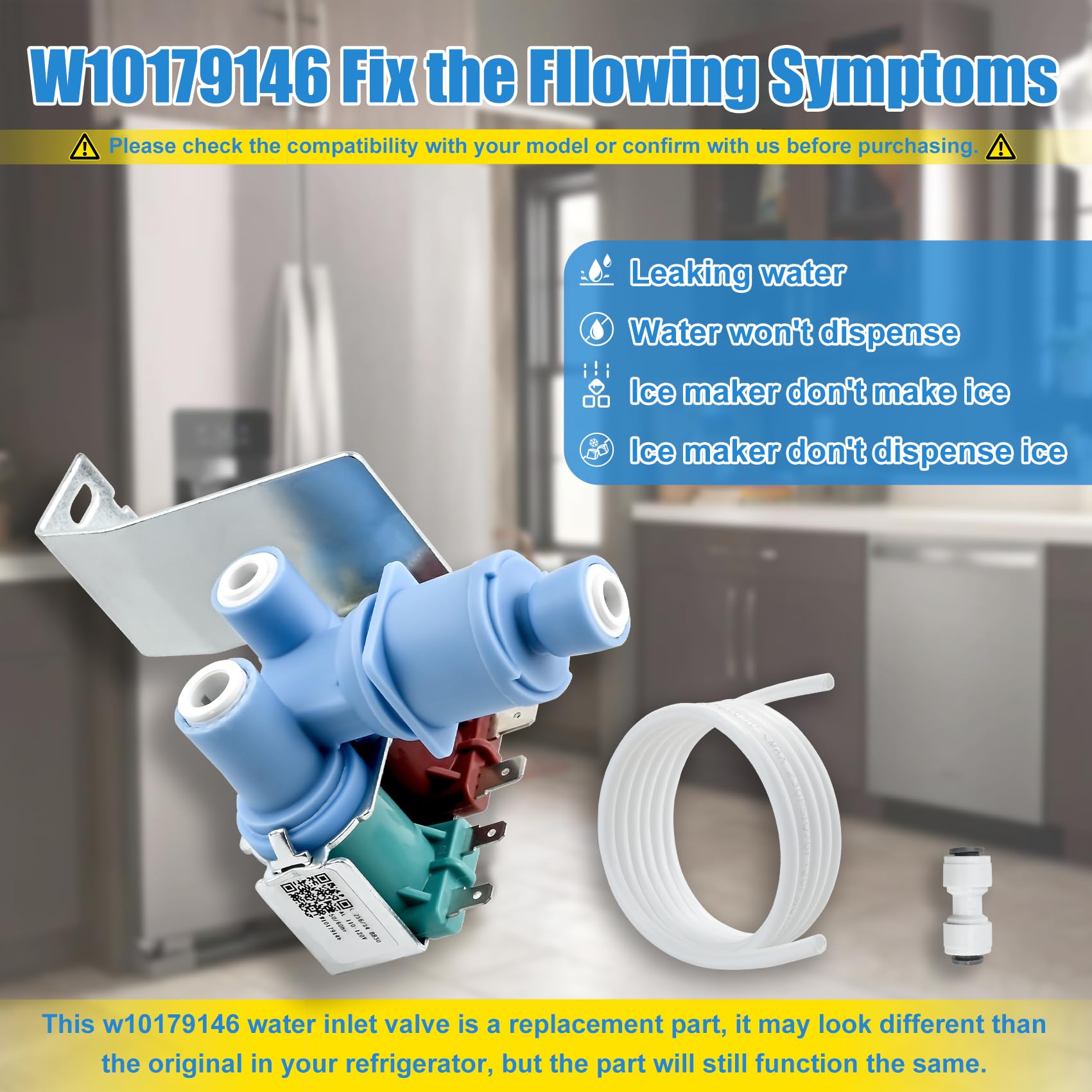 【Purchase Notes】This w10179146 water inlet valve is a replacement part of whirlpool refrigerator water inlet valve, it may look different than the original in your refrigerator, but the part will still function the same. WPW10179146 inlet valve come with 5FT water supply line and 1/4’’ quick connect fitting. NOTE: It is NOT W10408179 and the refrigerator models they fit are not compatible. Some parts may look the same, but there may be small variations in size and installation.