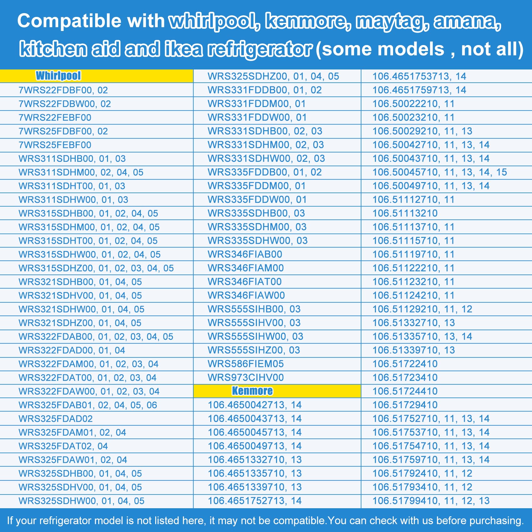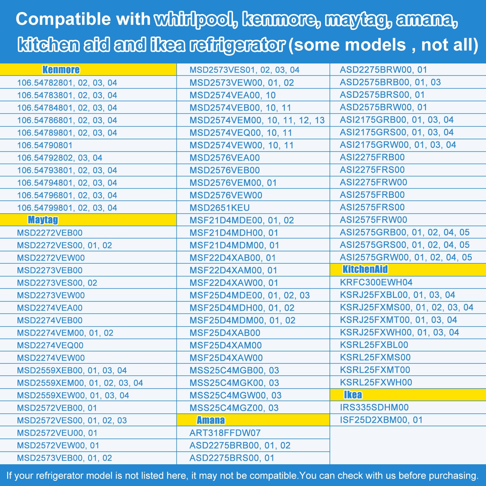 【Applicable Brand】 AP6016381 water inlet valve is compatible with whirlpool, kenmore, maytag, amana, kitchen aid and ikea Refrigerator (some models of these brands, not all). Before purchasing, you can quickly search for your model in the product description by "Ctrl+F", or view it in the product images. If you have any questions, please feel free to let us know!